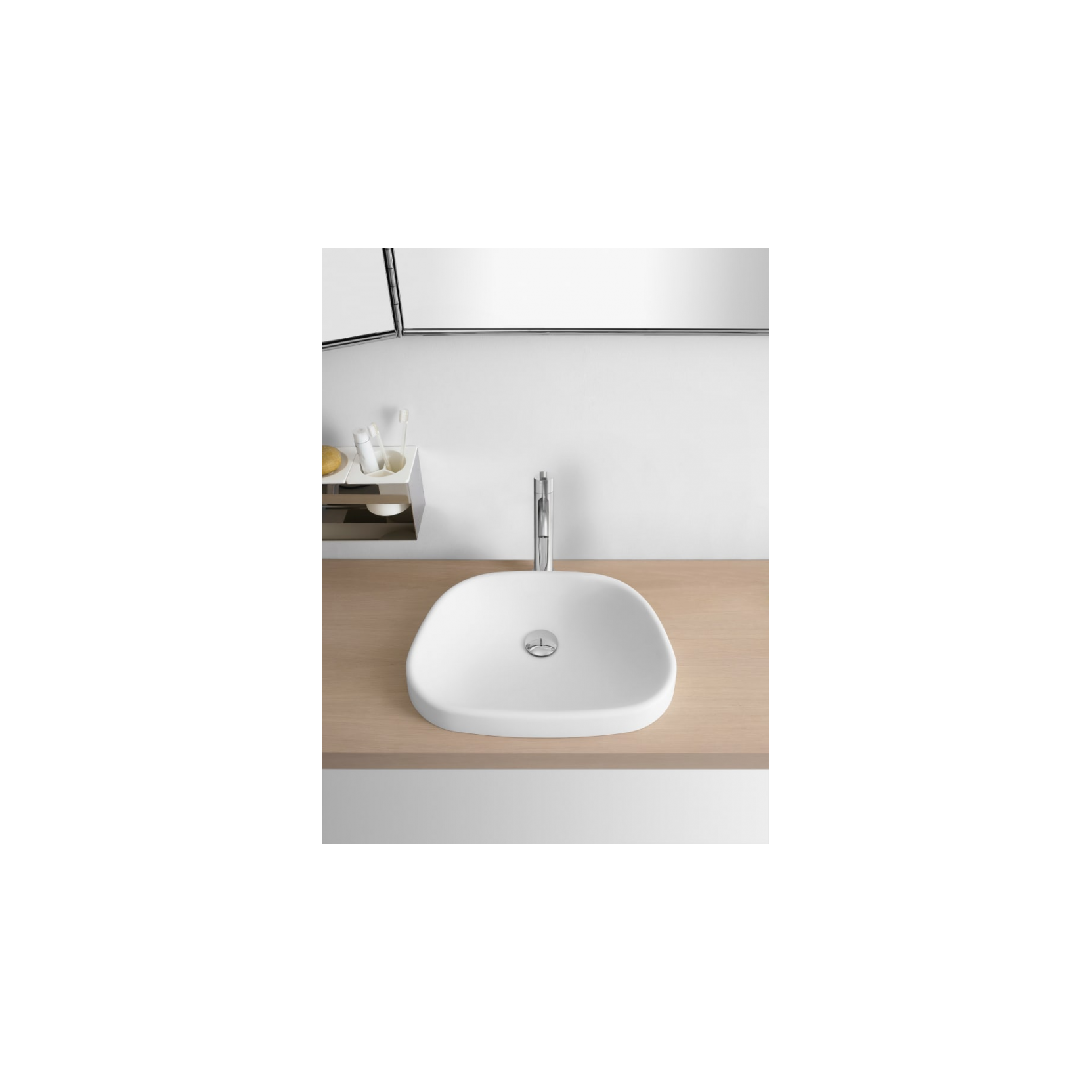 Pear è un lavabo a semincasso in Cristalplant® biobased bianco, con profilo morbido e pulito che si adatta alle forme più diverse delle strutture d’appoggio, da soluzioni in marmo, legno, pietra o metallo. Il bacino, integrato nel piano, è pensato per scarico libero, con rubinetteria montata a parete o a pavimento, senza foro sulle superfici visibili, così da mantenere una linea continua e senza interruzioni. Il materiale Cristalplant® conferisce al lavabo una superficie white e setosa, con un volume importante ma delicato, che si fonde naturalmente con il resto della collezione Pear, caratterizzata da forme arrotondate e avvolgenti. Il design di Pear trasforma il lavabo in un punto di ristoro piacevole, dove il gesto quotidiano si accomoda in un volume morbido, pulito e rassicurante, perfetto per bagni contemporanei, SPA e progetti contract che privilegiano caloricità e materialità.