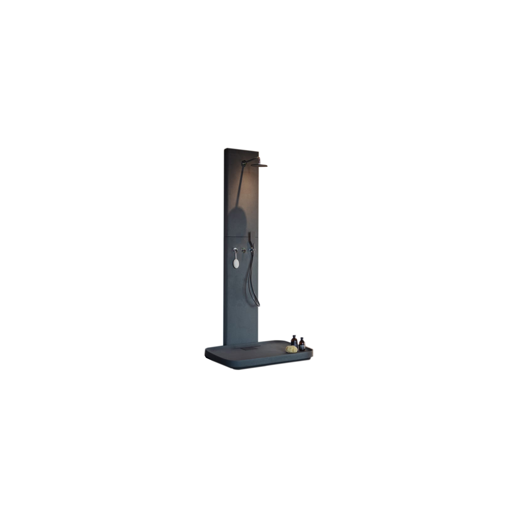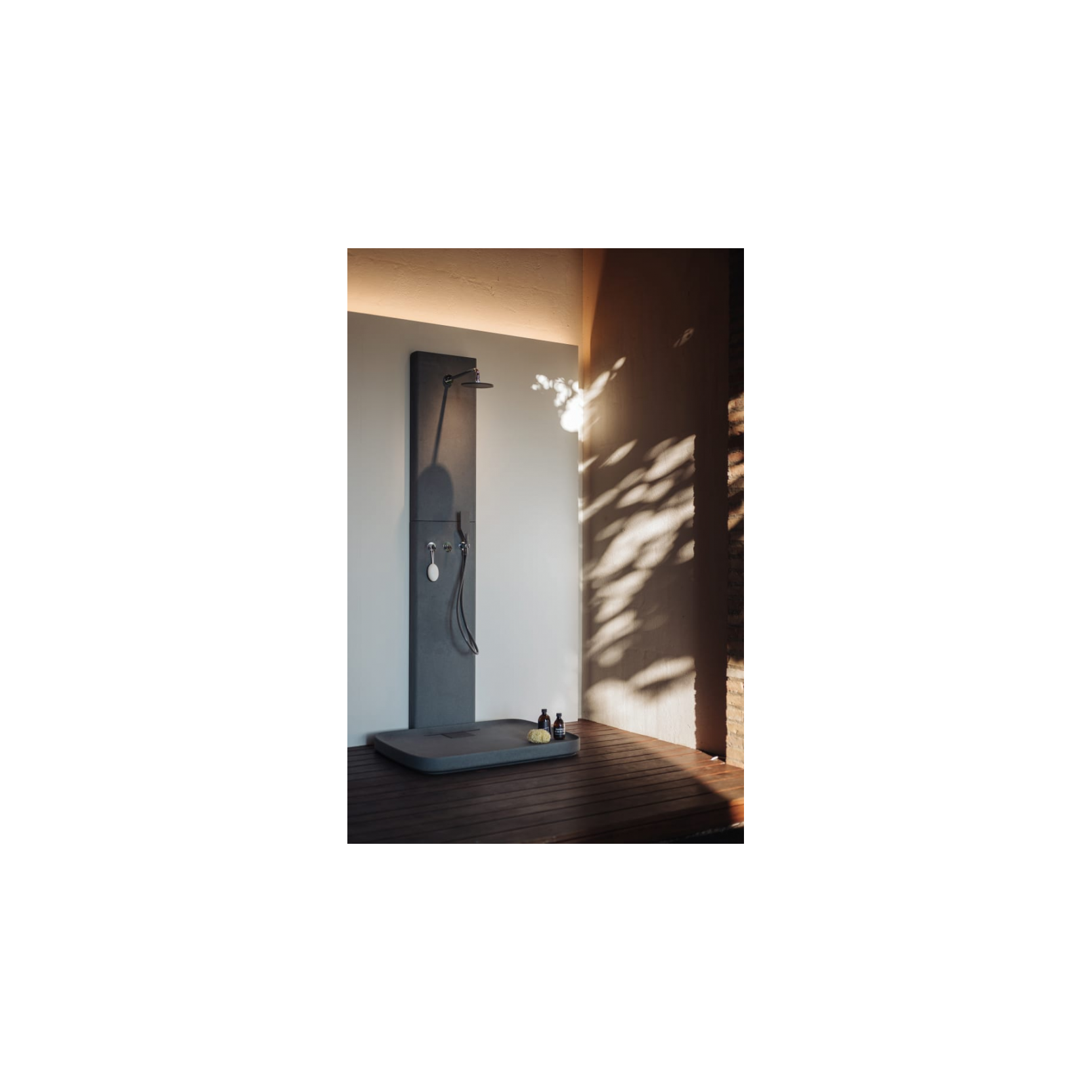 Petra è una colonna doccia firmata da Diego Vencato e Marco Merendi per Agape, pensata per vivere all’esterno in giardino, terrazzo o spazi wellness. Realizzata in Cementoskin® o in marmo, con superficie naturale e vellutata, la colonna si accoppia al piatto doccia omonimo per creare una cabina doccia totalmente materica. La struttura presenta tacche nella parte superiore che permettono differenti configurazioni di rubinetteria, trasformando la colonna in un elemento di forte presenza scenografica e funzionale.