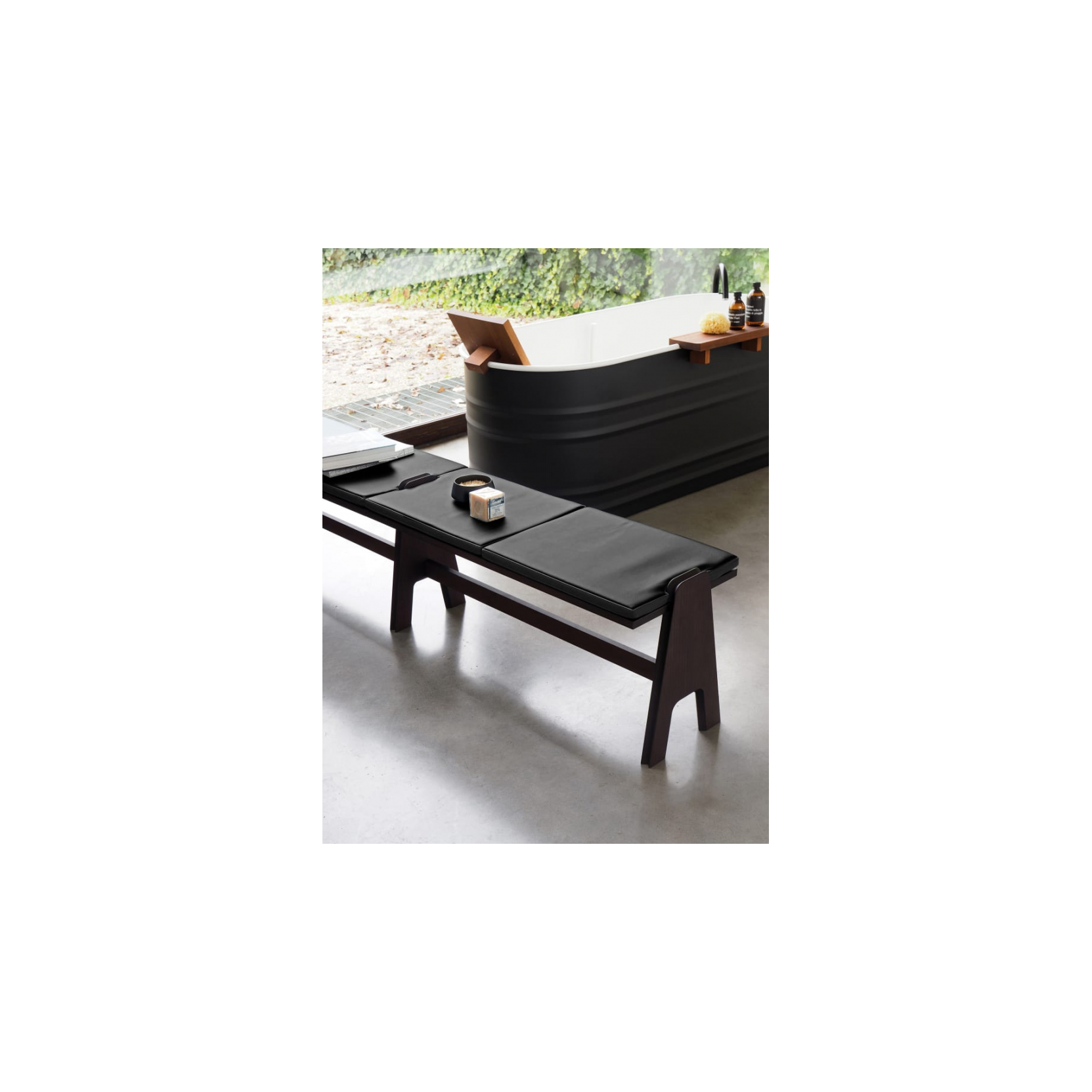 Cavalletto è un’elegante panchetta disegnata da Angelo Mangiarotti e Bruno Morassutti nel 1953, nata come complemento dell’omonimo e storico sistema di librerie. Realizzata in multistrato di pioppo con finitura rovere naturale, bruno o scuro, si distingue per un sofisticato gioco di incastri tra piani sagomati, che le conferisce un aspetto leggero e contemporaneo. Versatile e funzionale, può essere utilizzata come seduta — eventualmente arricchita da un cuscino in pelle nera — o come pratico piano d’appoggio, integrandosi perfettamente accanto a una vasca freestanding o in qualsiasi ambiente della casa.