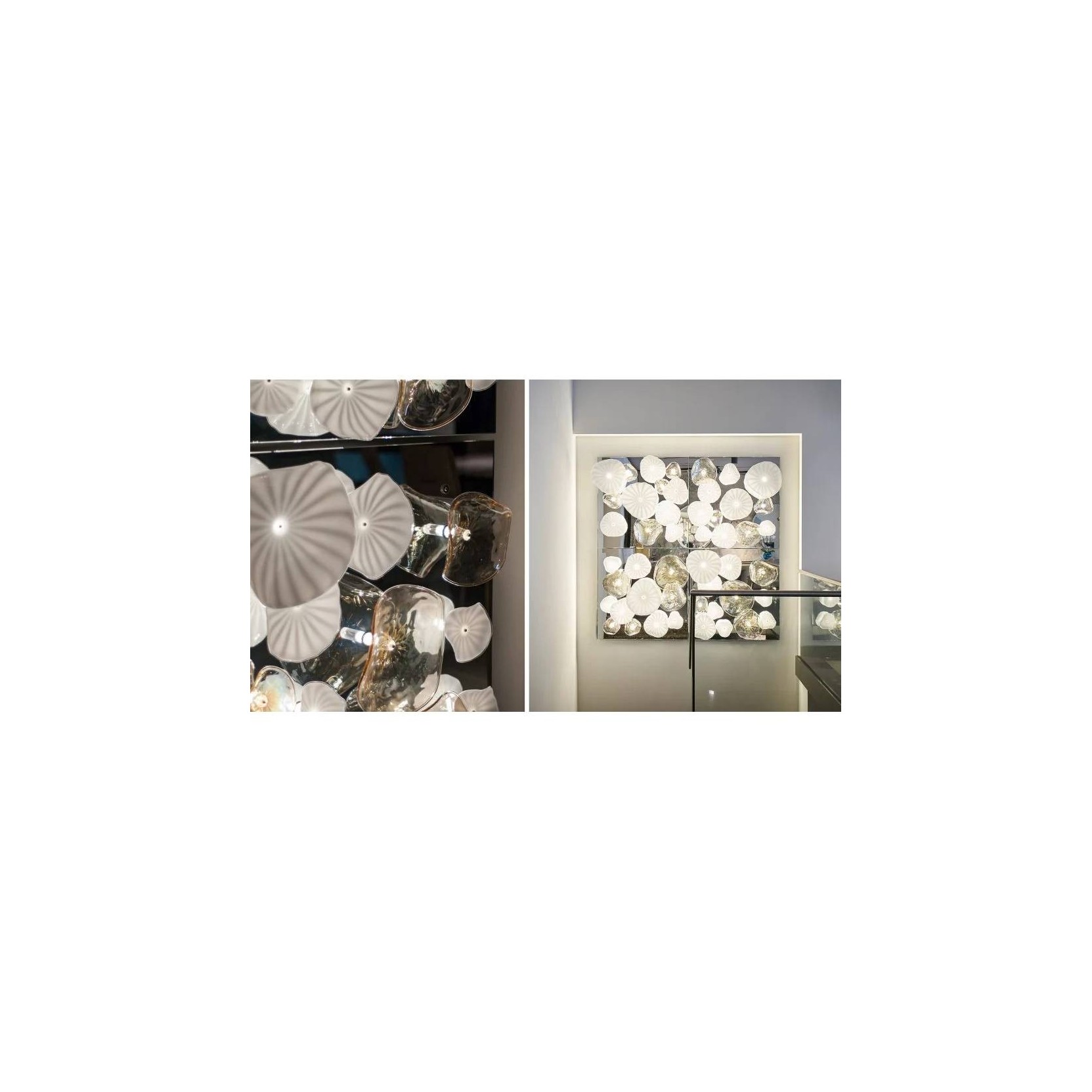 Modulo decorativo componibile in vetro a specchio spessore 5 mm installabile a parete o a soffitto. Elementi floreali in vetro di Murano bianco e ambra iridium, retro-illuminati a LED.Spedizione 5-6 settimane lavorative