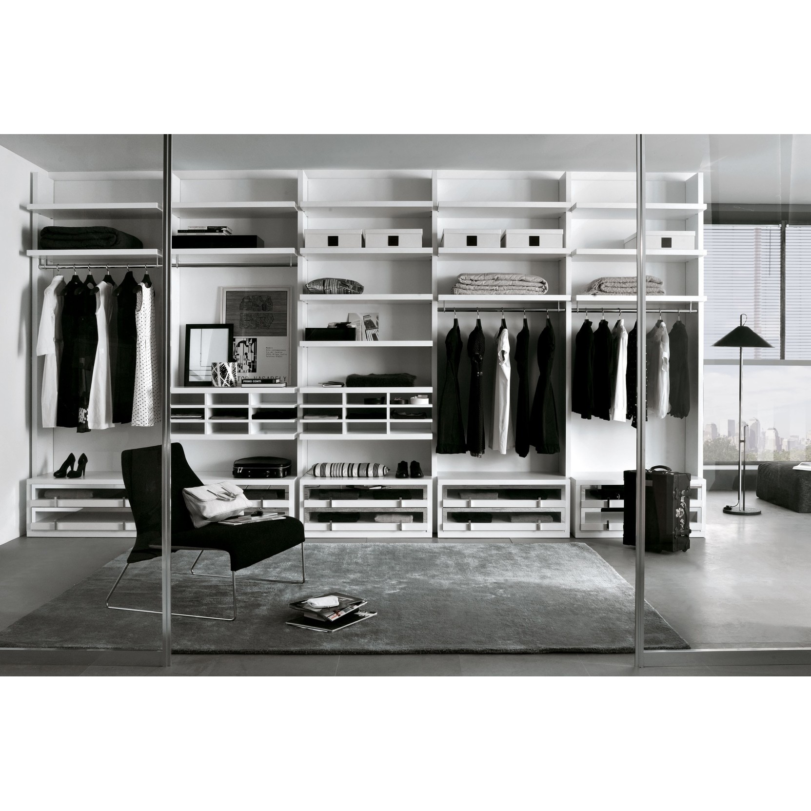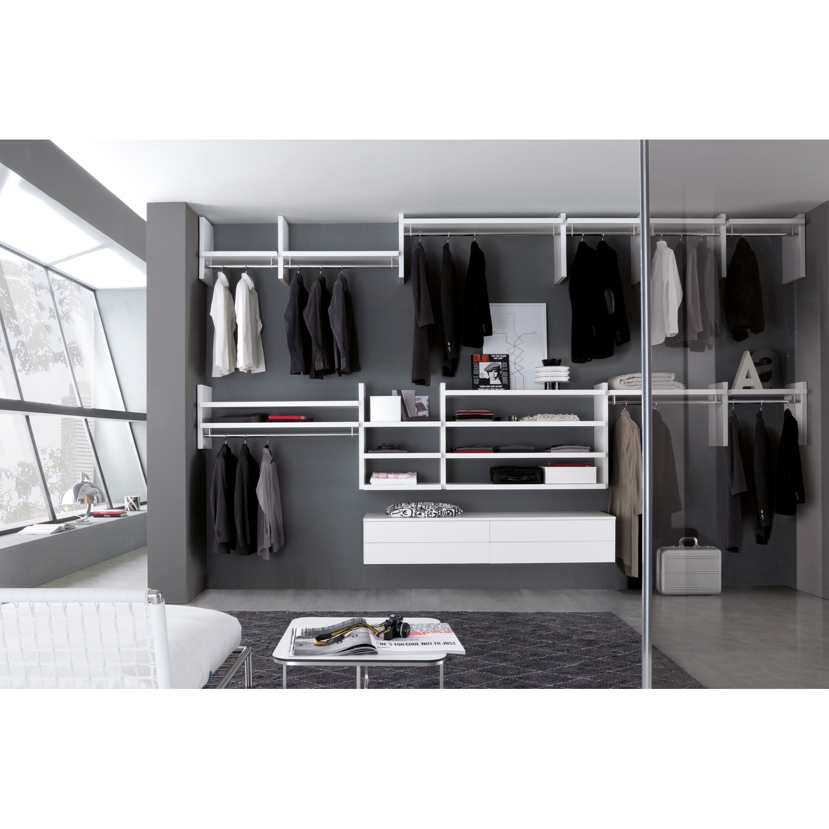 Tutto il fascino di uno spazio interamente dedicato al guardaroba: geometrie che si adattano perfettamente all’architettura dell’ambiente, modularità completamente personalizzabile e una vasta gamma di accessori e complementi.