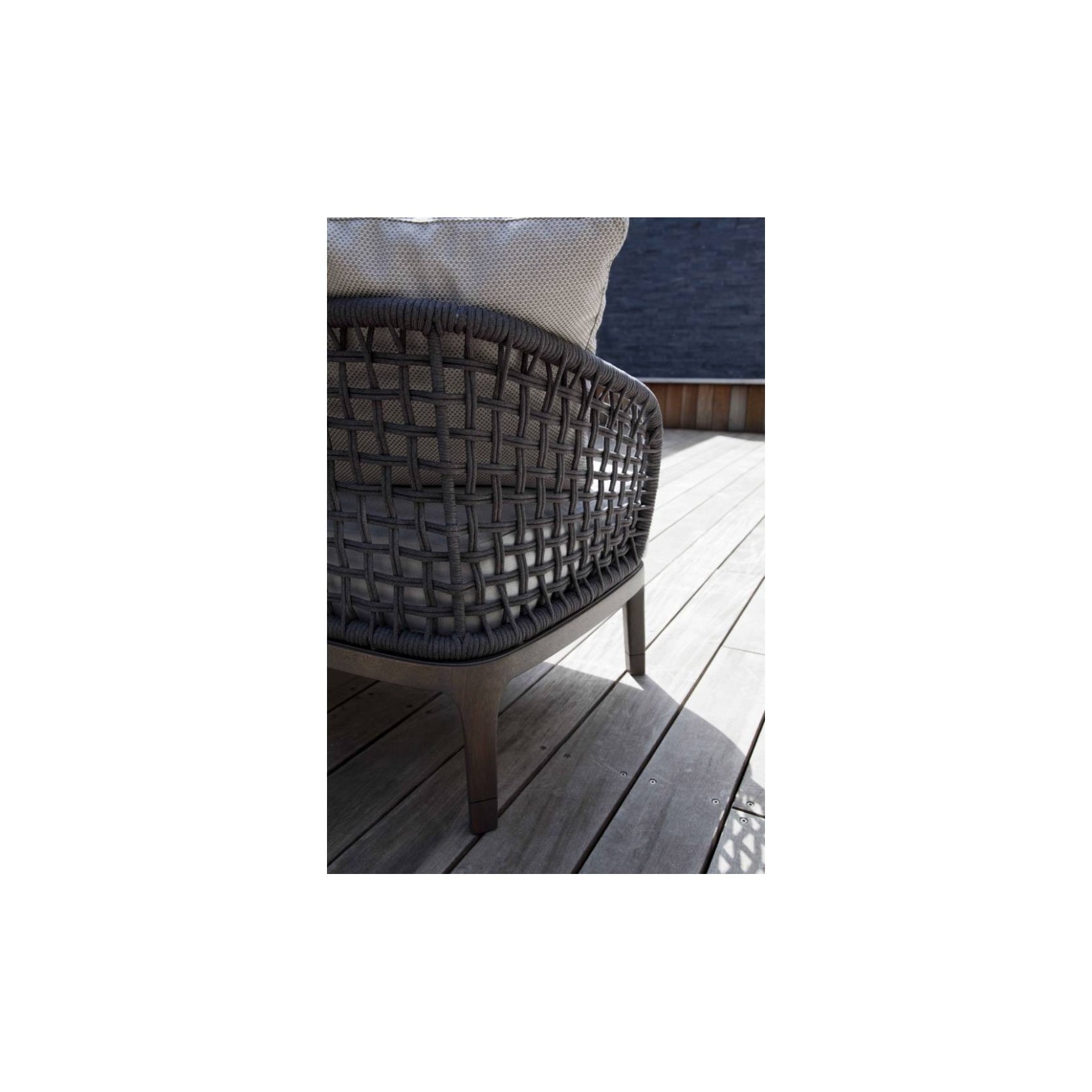 Struttura e intrecci metallo rivestito con filato di polipropilene Dimesioni sedia con braccioli : cm 60x58x82h | seduta cm 48h poltrona: cm 76x76x72h | seduta cm 43h divano: cm 200x76x72h | seduta cm 43h chaise longue: cm 76x160x65h