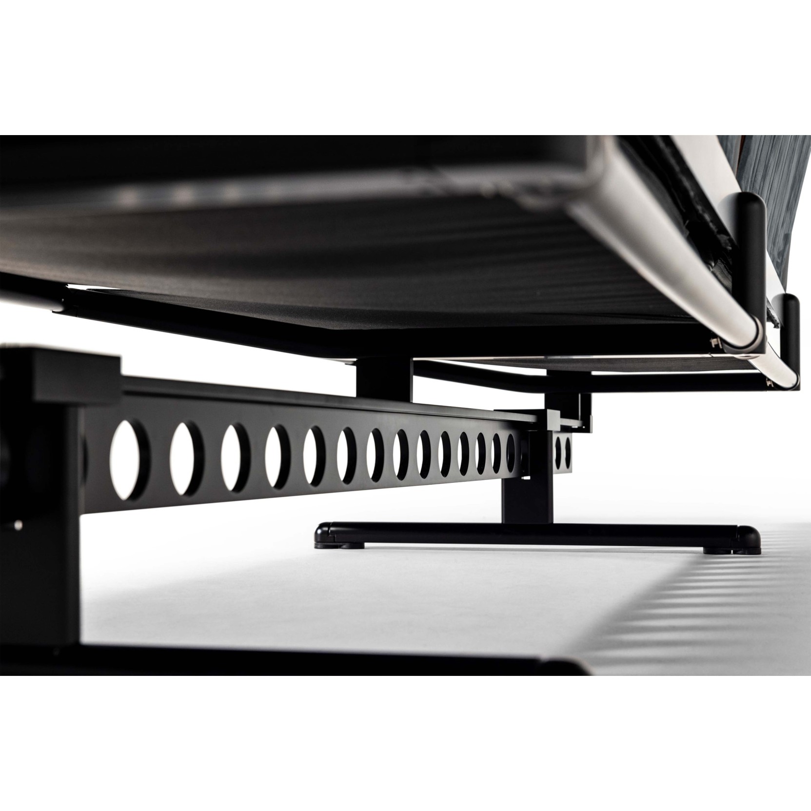Ouverture è un divano che fonde eleganza e innovazione strutturale. La sua struttura portante, i piedi e i braccioli sono realizzati in profilati di acciaio a sezione semi-ovale con terminali in alluminio pressofuso. La seduta poggia su una trave a T traforata in acciaio, garantendo solidità e leggerezza. Lo schienale è in lamiera d’acciaio e profilati di alluminio, con una finitura metallica verniciata a polveri epossidiche di colore nero opaco.