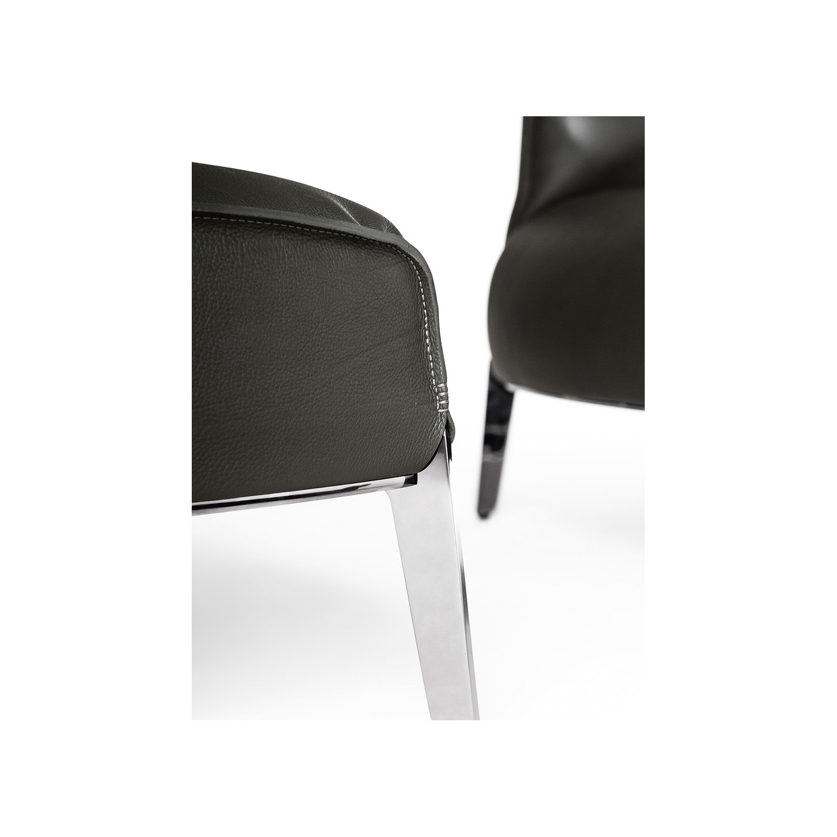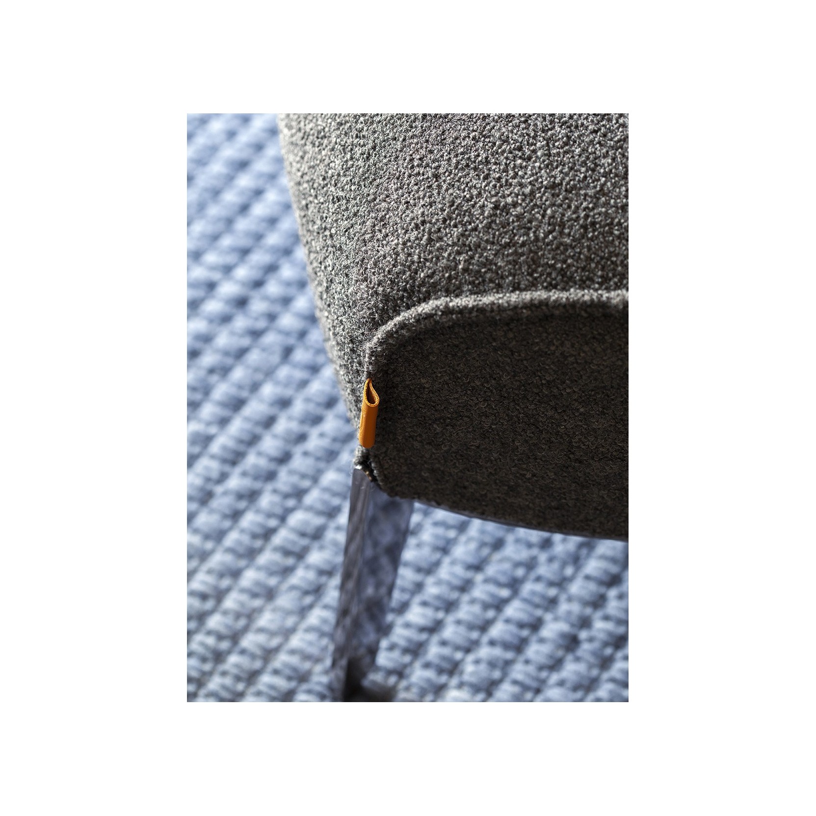 La struttura del pouf è realizzata in multistrato di betulla, mentre l'imbottitura è in espanso sagomato con ovatta di poliestere. Il basamento è composto da quattro piedi in fusione di alluminio e un telaio in tubolare di acciaio, disponibile in tre finiture: canna di fucile, brunito e verniciato titanio. Il rivestimento è in Pelle Frau® o in tessuto, con diverse opzioni di colore e materiale, tra cui ColorSphere® (SC), Nest, Soul, Velvety, e altre varianti di tessuti. La sfoderabilità è prevista solo per la versione in tessuto. I dettagli estetici includono cuciture a contrasto lungo i bordi e sulle superfici esterne per la versione in pelle, mentre la versione in tessuto presenta cuciture tono su tono.