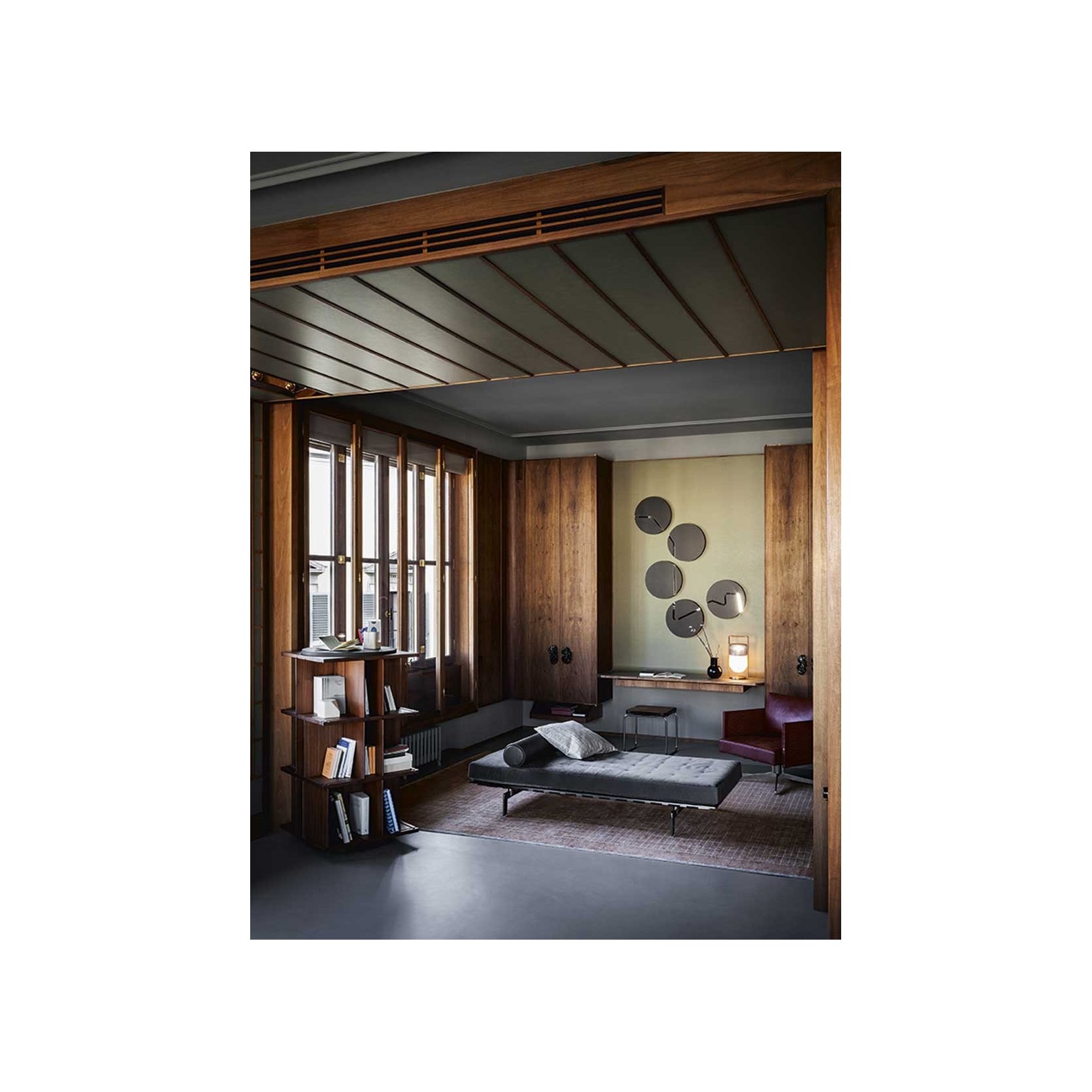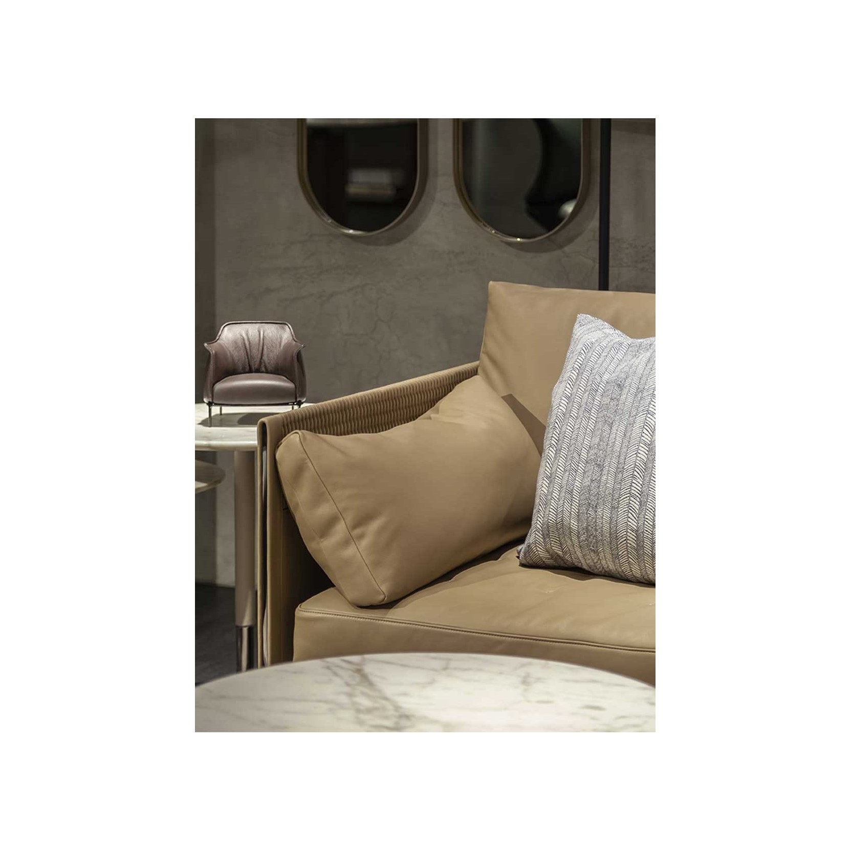 La struttura della poltrona è realizzata in acciaio con leggera imbottitura in poliuretano. I pannelli laterali e lo schienale sono uniti da cerniere a vista in metallo con finitura ruthenium. La seduta, costruita in acciaio e alluminio con finitura ruthenium, poggia su un telaio in massello stagionato e una struttura metallica che fissa il meccanismo girevole. Il molleggio della seduta è ottenuto con cinghie in cuoio intrecciate, rinforzate da un inserto tecnico che ne garantisce la resistenza, mentre quello della poltrona è con cinghie elastiche. L’imbottitura del cuscino della seduta è in poliuretano espanso, mentre la cuscinatura dello schienale è composta da piuma d’oca e poliuretano espanso ed è in appoggio. I cuscini dei braccioli sono imbottiti in piuma d'oca. I piedi in acciaio con trattamento galvanico ruthenium sono dotati di puntali protettivi in materiale plastico. La poltrona è montata su una base a 4 razze con un meccanismo che consente una rotazione di 360° e il ritorno automatico alla posizione iniziale. Il rivestimento può essere realizzato in Pelle Frau® o in una combinazione di materiali diversi, con opzioni che includono tessuti come ColorSphere®, Nest, Soul, e Velvety. Il rivestimento dei pannelli di schienale e fianchi è caratterizzato da una cucitura tridimensionale che crea una trama di piccoli rombi in pelle, tipica dell’haute-couture, mentre i cuscini della seduta sono arricchiti da una cucitura a X realizzata a mano con filo a contrasto. La cuscinatura in pelle presenta una fascia microforata sulla parte posteriore.