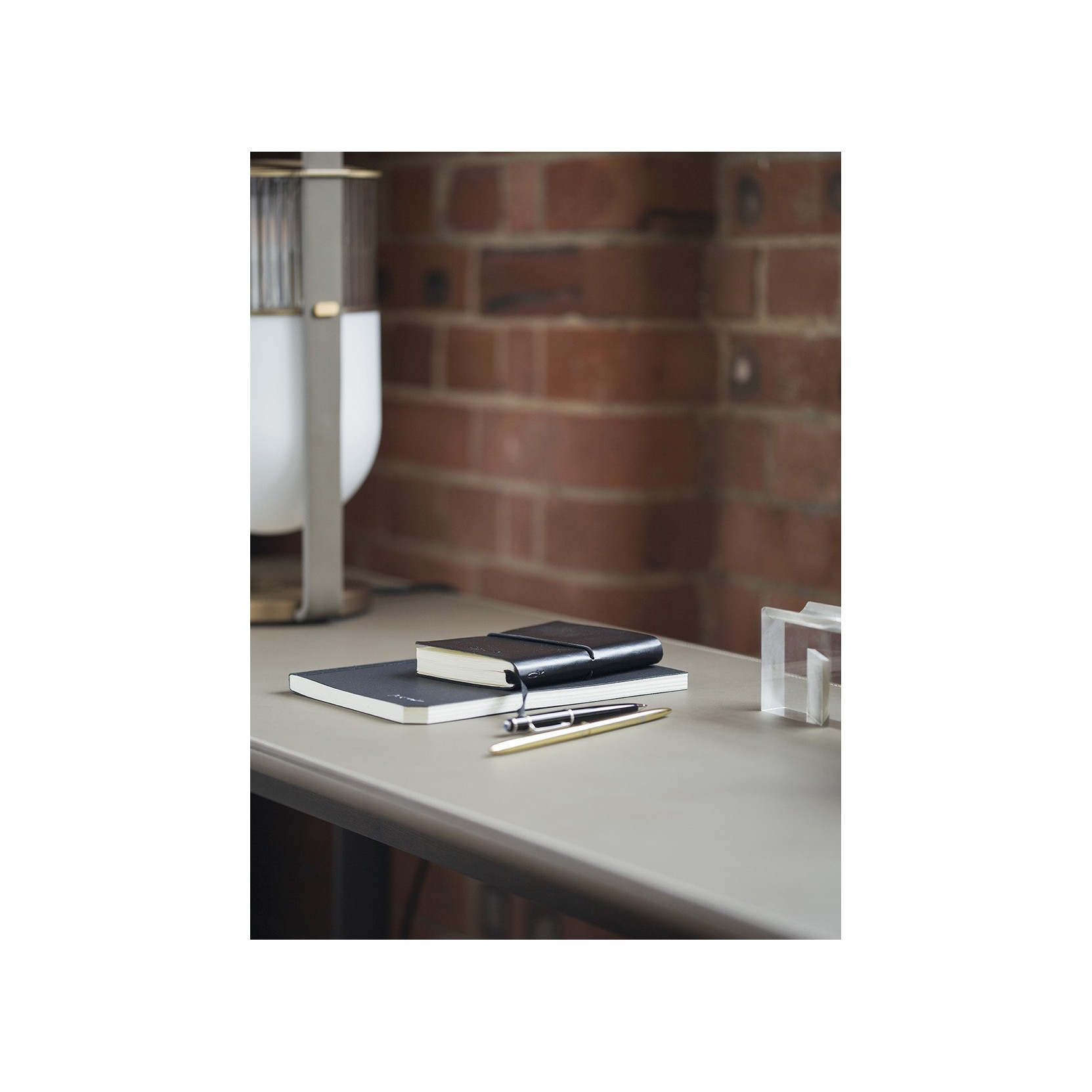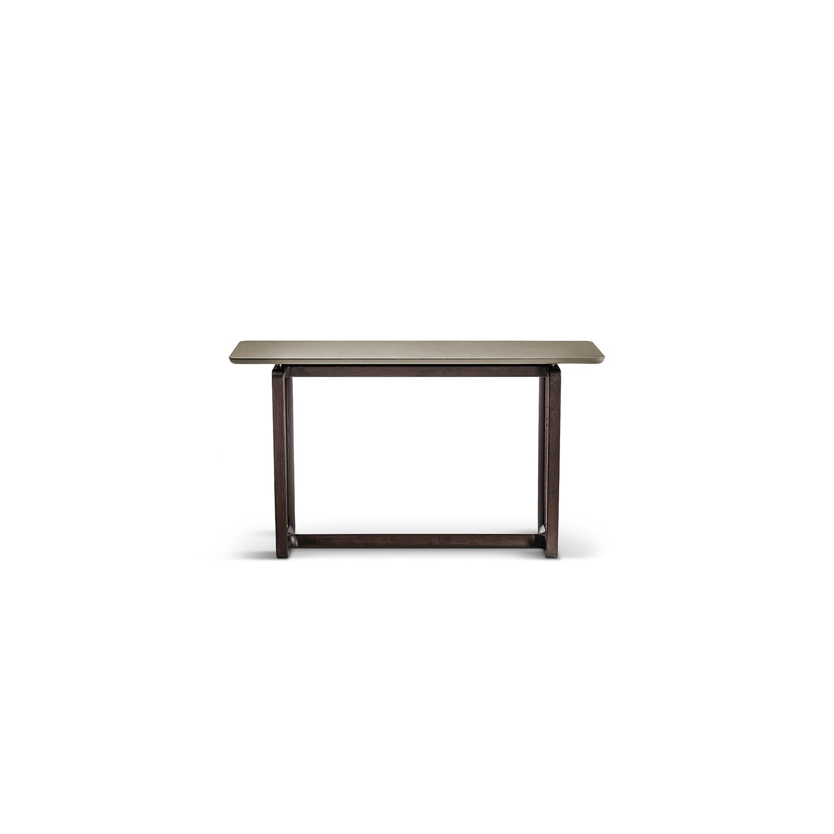 La base è in legno massello di frassino con un caratteristico profilo a sezione triangolare. Disponibile in due finiture: frassino tinto wengè e frassino tinto moka, la base è dotata di feltrini autoadesivi per proteggere il pavimento. Il raccordo tra il piano e la base è realizzato con piastre di ancoraggio in acciaio verniciato nero opaco e distanziali in acciaio spazzolato verniciati nella finitura ottone naturale. Il piano è realizzato in multistrato di betulla e disponibile in diverse opzioni, tra cui cuoio Saddle Extra, vari tipi di marmo come il Calacatta lucido, il Calacatta semi-lucido, l’Arabescato Venato lucido e l’Arabescato Venato semi-lucido. Il piano in cuoio Saddle Extra è rifinito con la parte inferiore in Pelle Frau® in abbinamento cromatico, mentre il piano in marmo è rinforzato da una rete tecnica per garantire resistenza alla flessione e agli urti. I piani in marmo Calacatta e Arabescato Venato lucidi sono trattati con una vernice poliestere trasparente, mentre le versioni semilucide sono trattate con una soluzione idrorepellente che dona un aspetto più naturale. È consigliato fissare il piano a parete, soprattutto per la versione con piano in marmo, per una maggiore stabilità e sicurezza. L’accessorio per il montaggio a parete include una piastra posteriore con regolazione di profondità (+/- 6 mm) in acciaio verniciato nero opaco.