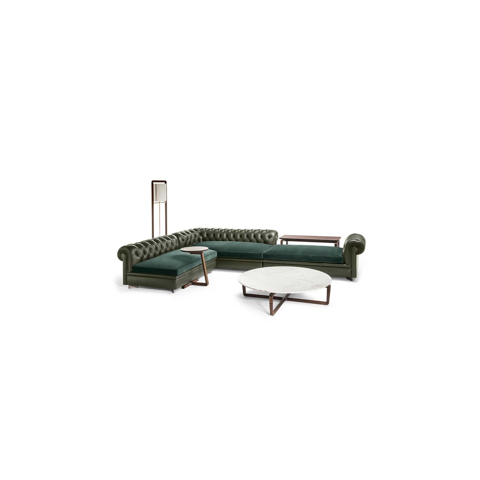La struttura portante è realizzata in legno massello di faggio stagionato e pioppo, con traverse in multistrato di pioppo. I moduli componibili offrono massima versatilità, permettendo configurazioni aperte o chiuse. Il pouf, costruito con gli stessi materiali, è arricchito da una leggera imbottitura in poliuretano espanso. Il molleggio utilizza molle biconiche in acciaio, legate a mano e fissate su cinghie di juta, garantendo resistenza e comfort.