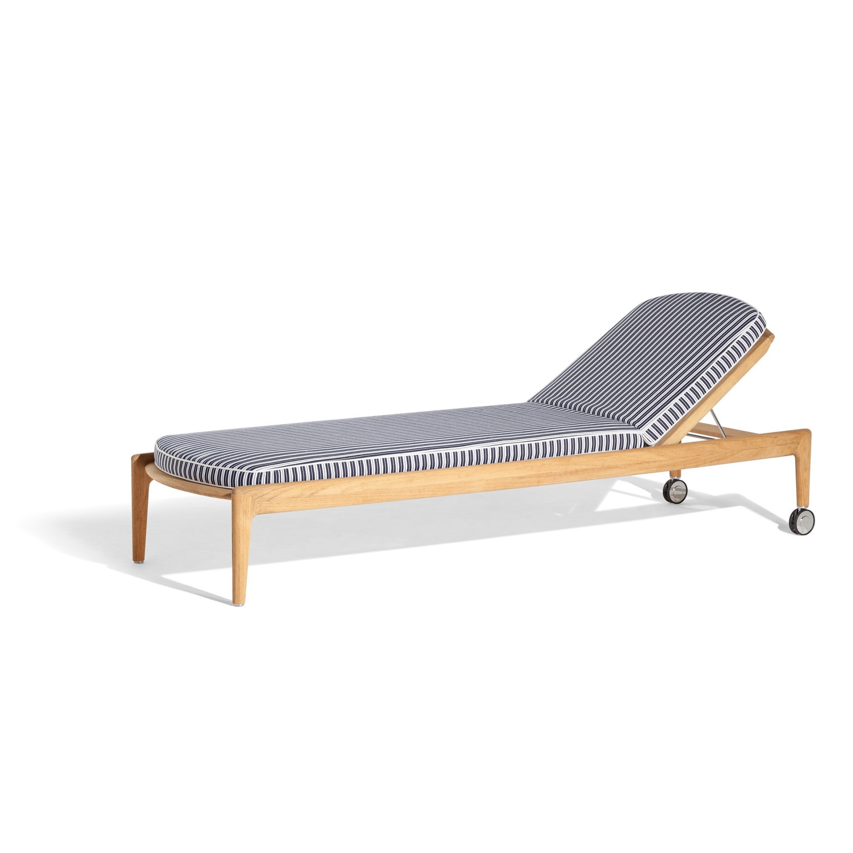La struttura del lettino è realizzata in legno massello di teak con finitura naturale, senza trattamenti superficiali, sia per i fianchi che per i piedi, che presentano una sezione sagomata. Il pianale è composto da doghe in legno massello di teak con la stessa finitura naturale. Lo schienale reclinabile ha una cornice sagomata in legno massello di teak ed è completato da un sistema di cinghie incrociate in polipropilene, disponibili in due varianti cromatiche: ecrù e taupe. La regolazione dell’inclinazione dello schienale è garantita da cremagliere e telaio in acciaio inox lucido. Il materassino, incluso, è imbottito con poliuretano a celle aperte con densità differenziata, rivestito in polipropilene, e dotato di un filetto perimetrale che abbina il tessuto. La parte inferiore è realizzata con una rete antiscivolo in poliestere, e il cuscino è fissato al pianale tramite automatici in acciaio inox. Il lettino è disponibile con diversi rivestimenti, tra cui Pelle Frau® Outdoor e Outdoor Fabric, ed è sfoderabile. Gli appoggi anteriori sono costituiti da piedini in acciaio inox lucido con puntali in nylon nero, mentre gli appoggi posteriori includono ruote unidirezionali in acciaio inox, dotate di anelli in nylon per migliorare il comfort a terra. I dettagli metallici comprendono leveraggi in acciaio inox lucido, e una targhetta con il logo Poltrona Frau® è applicata sulla parte superiore dello schienale.