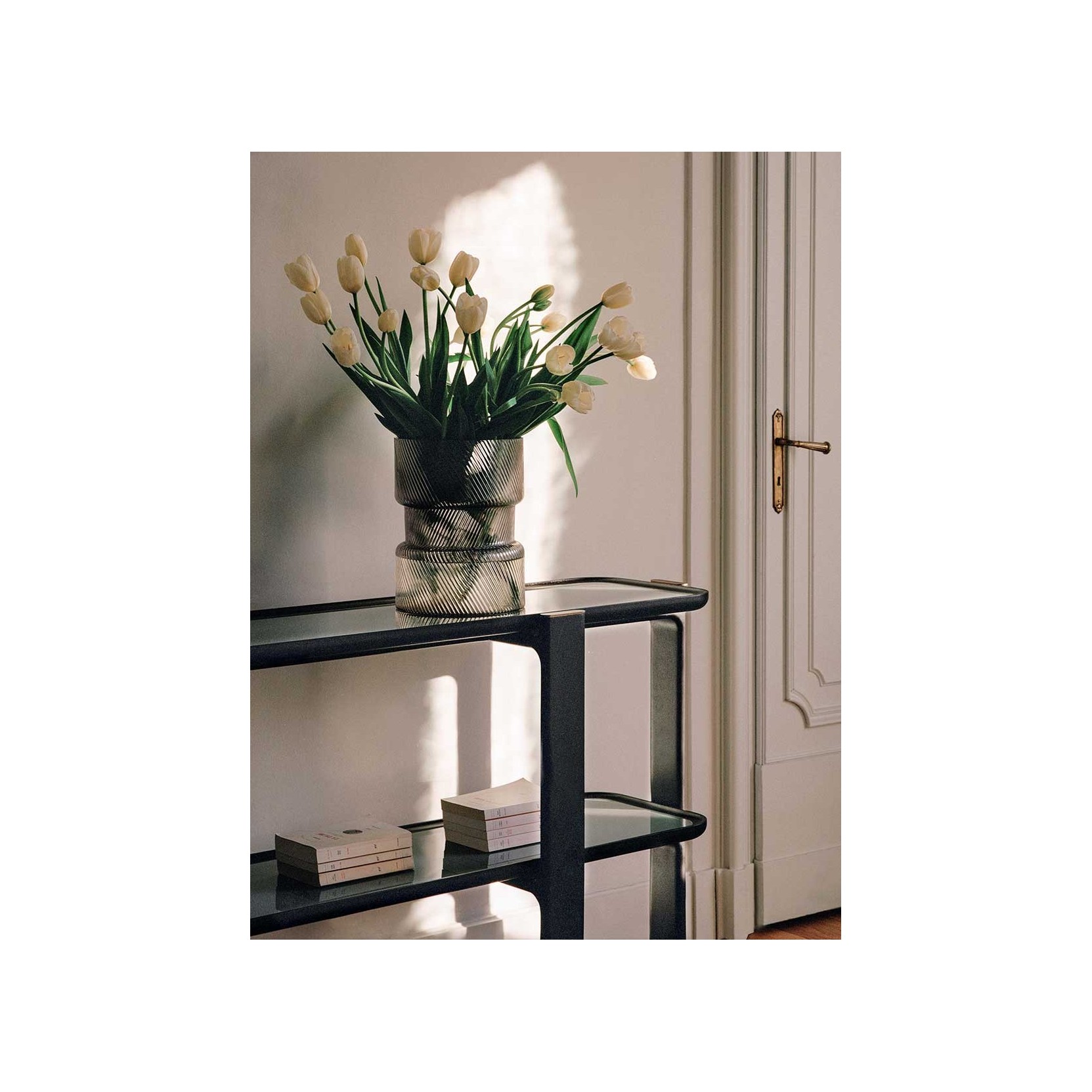 La console DUO presenta un design unico caratterizzato da montanti sfalsati e distanziali metallici che sollevano i ripiani dalla struttura, conferendo leggerezza e raffinatezza al prodotto. La struttura portante è realizzata in legno massello di frassino, disponibile nelle finiture wengé o moka, e incornicia ripiani in frassino impiallacciato o in alternative in vetro retro-verniciato o marmo Calacatta semilucido. È possibile scegliere tra diverse finiture per i piani, creando una combinazione di materiali che si adatta perfettamente all'ambiente. La console è dotata di distanziali in metallo verniciati in bronzo sfumato che ne esaltano il design sofisticato. I ripiani sono opzionali e possono essere aggiunti per aumentare la capacità della console, con la possibilità di scegliere tra vetro colorato o marmo Calacatta semilucido. La console può essere personalizzata ulteriormente scegliendo il colore del vetro e specificando la finitura del legno al momento dell'ordine.