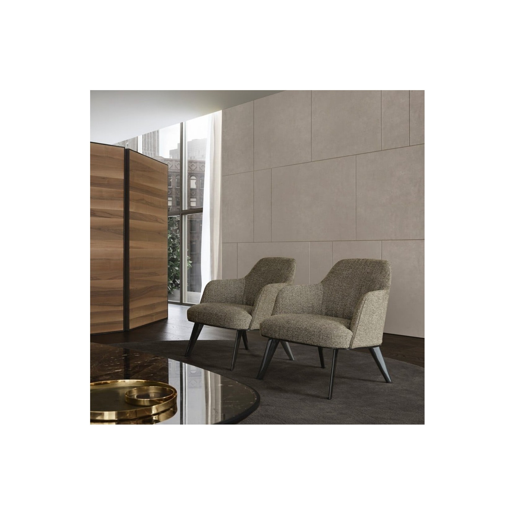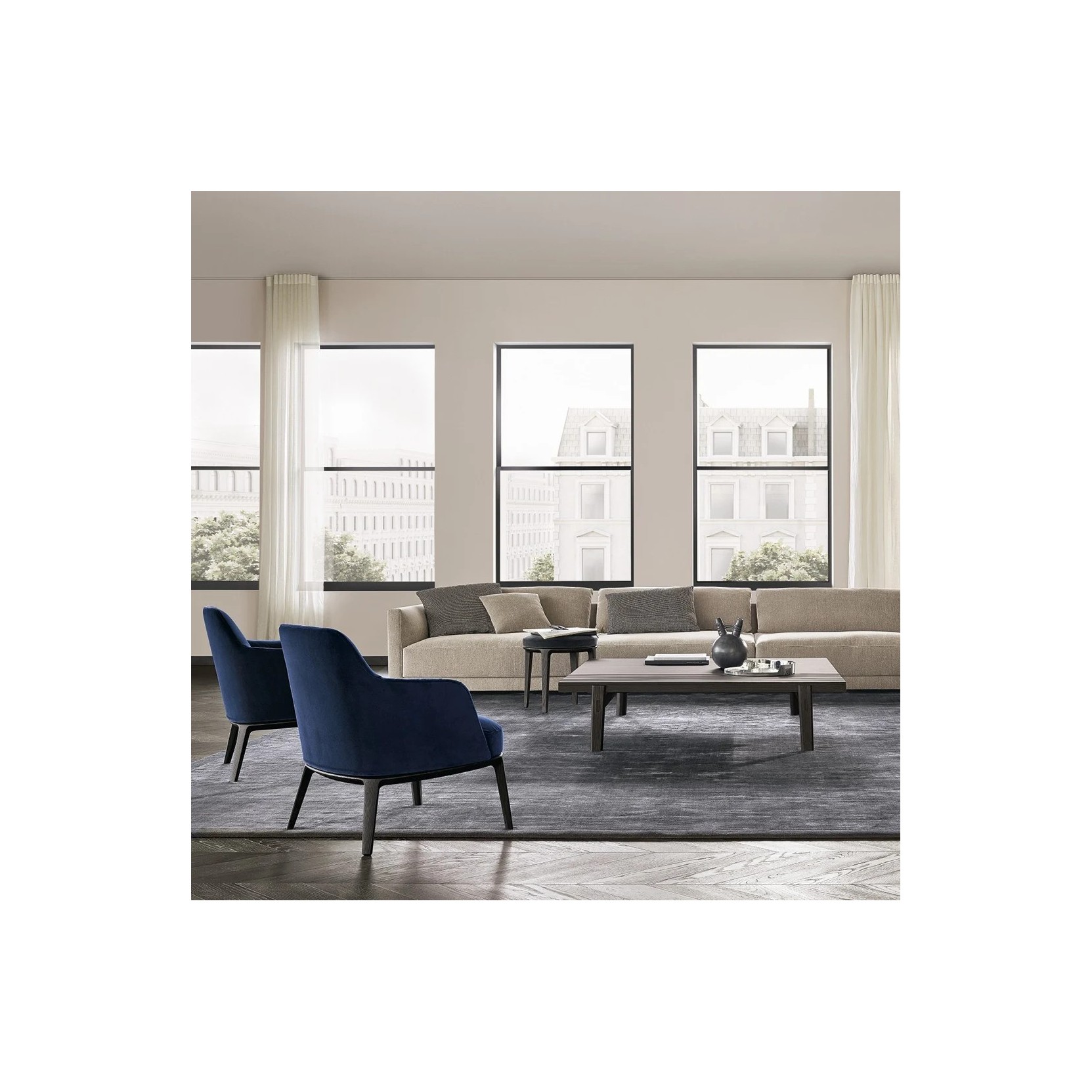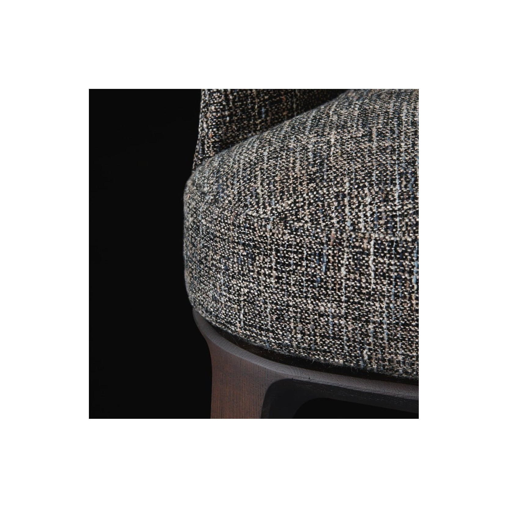 La scocca e la seduta sono realizzate in poliuretano flessibile stampato con parti a quote differenziate. Il prerivestimento è composto da fibra di poliestere, piuma e tela di cotone, mentre il rivestimento è disponibile in tessuto sfoderabile o in pelle non sfoderabile. Per il tessuto Sendai è prevista una bordura in gros-grain. È possibile scegliere un rivestimento diverso tra interno ed esterno della scocca, mantenendo il rivestimento sfoderabile ma non lavabile.
