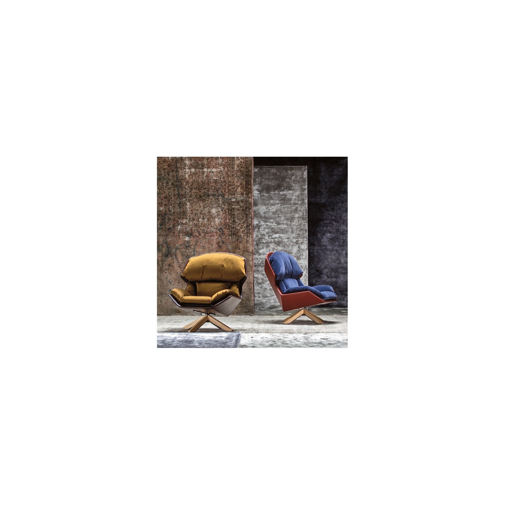 MISURE Larghezza 96 cm Profondità 103 cm Altezza 45/103 cm MATERIALI E FINITURE Espanso schiumato a freddo ignifugo Struttura in acciaio Basamento girevole in acciaio verniciato o lo stesso con finitura in rovere