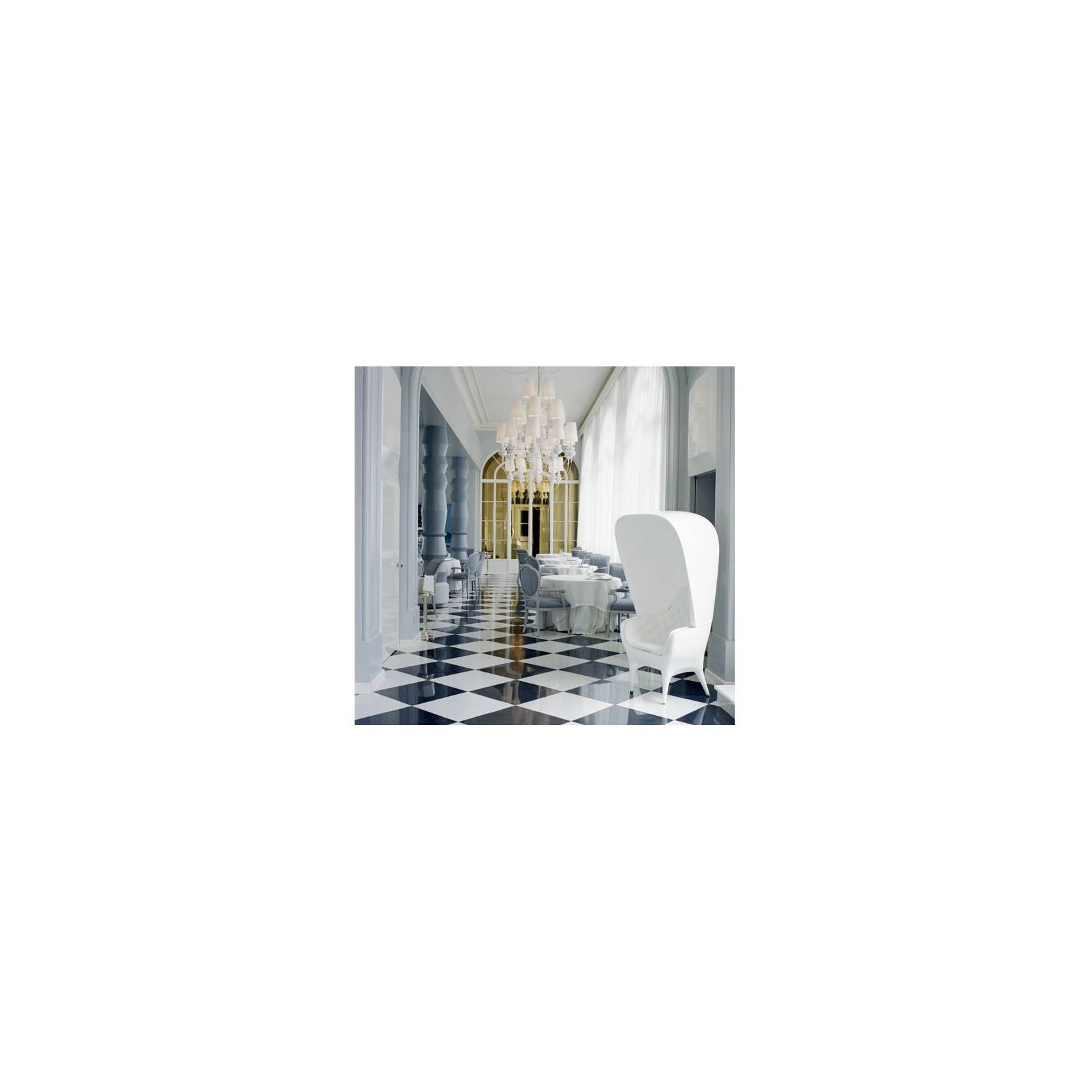 Dimensioni 82 x 90 x h.168 cm Poltrona, divano e rivestimento in polietilene stampato in rotazionale, rivestito in pelle capitoné e laccato lucido.