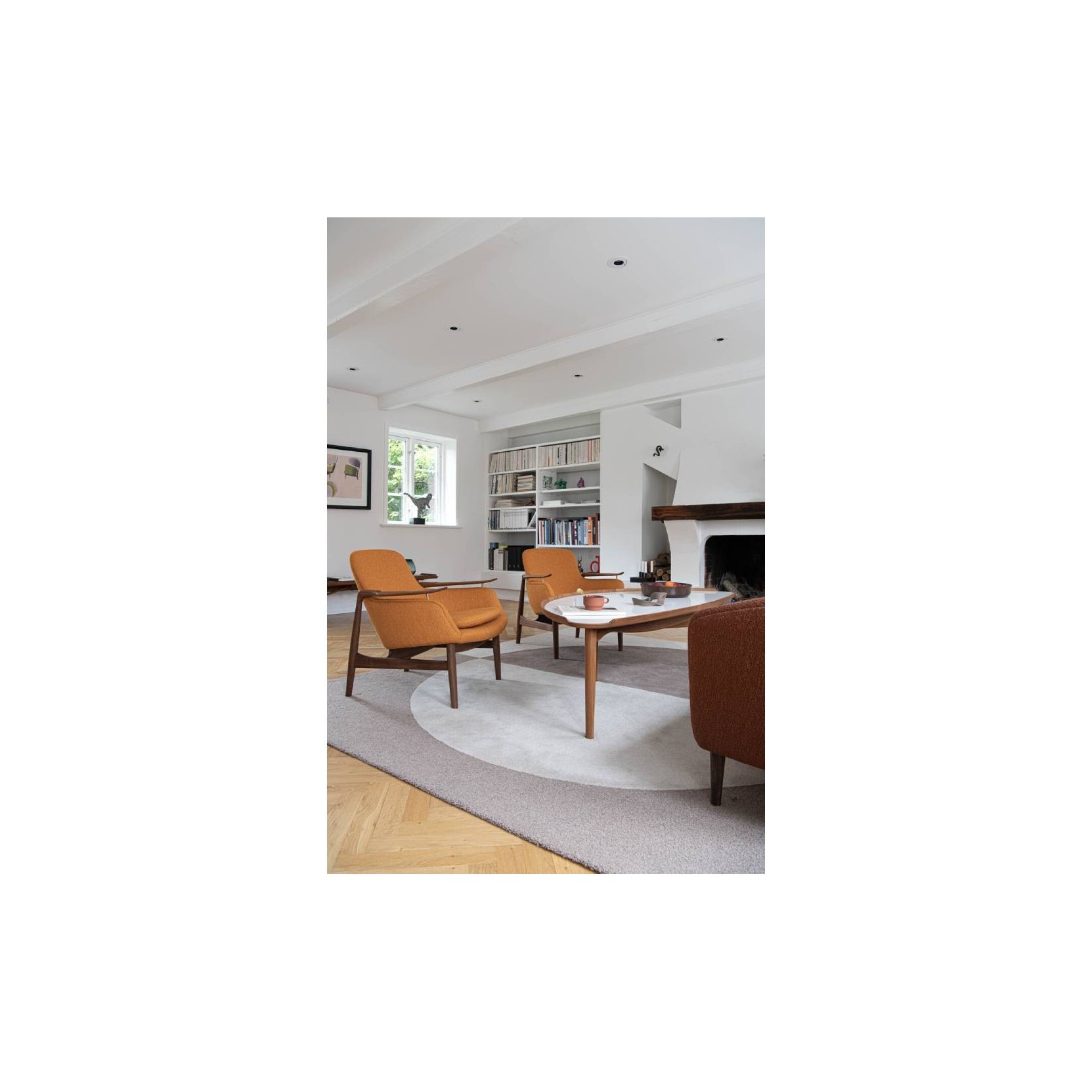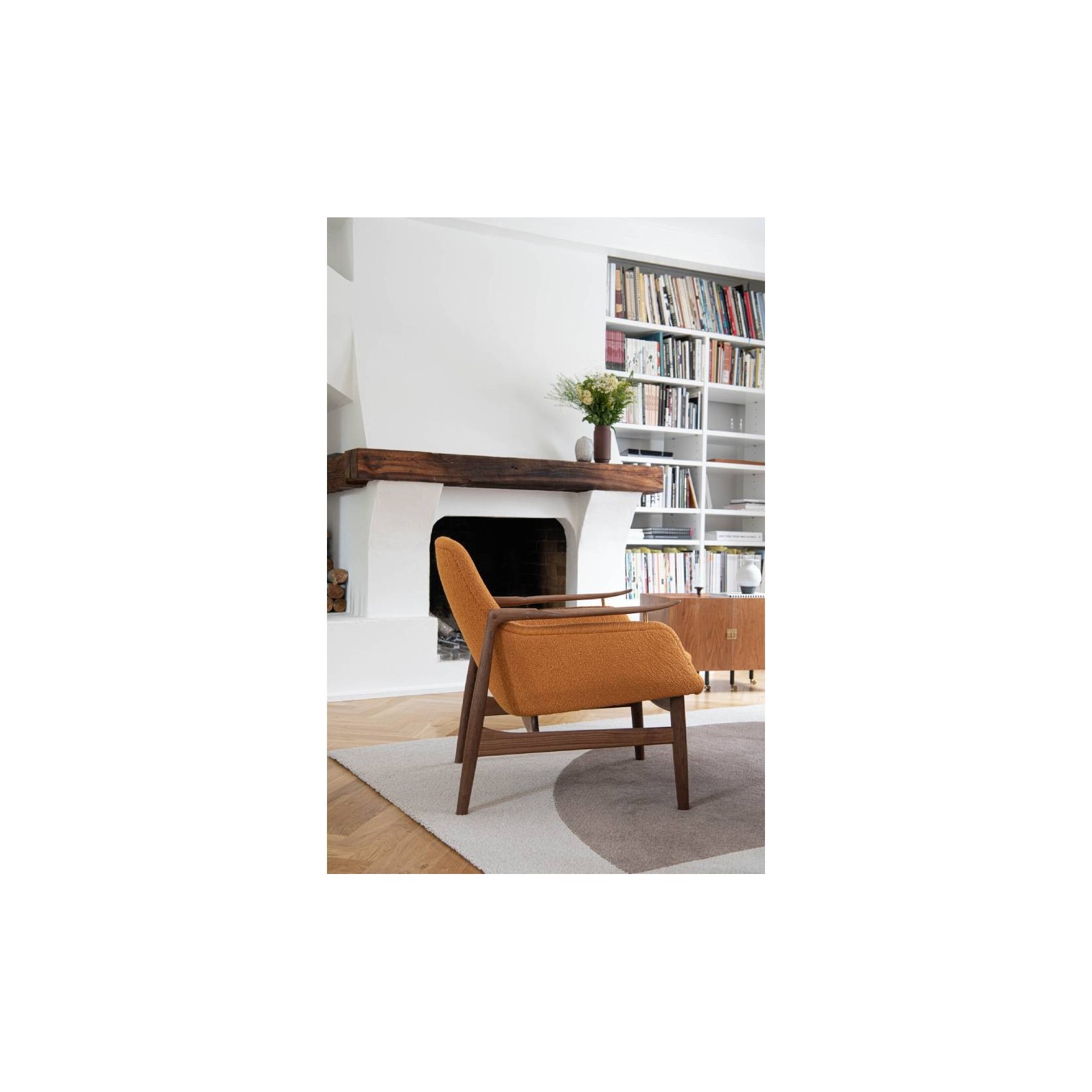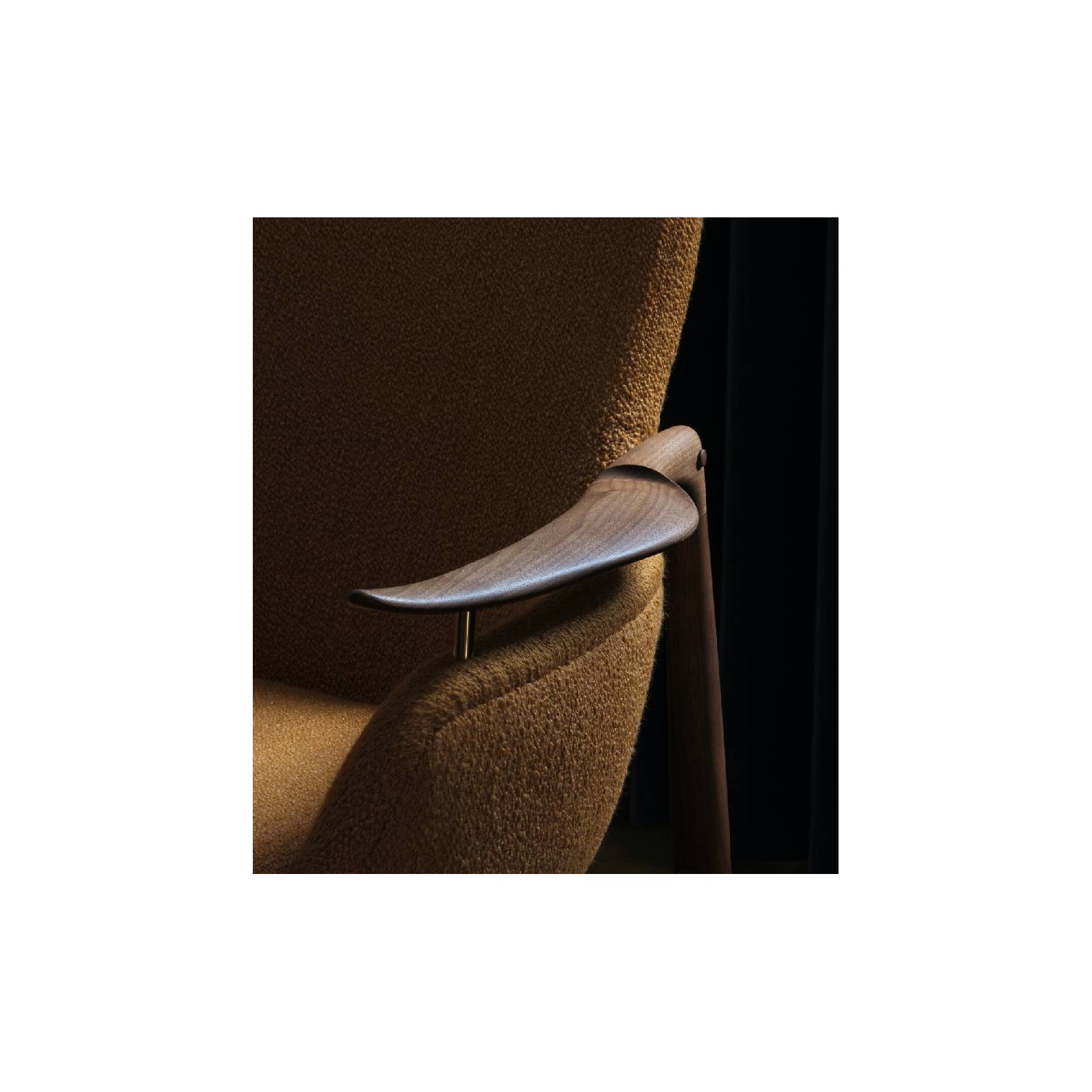 Finn Juhl /h4> FJ 53 è una poltrona disegnata da Finn Juhl e proposto da House of Finn Juhl. Disponibile in una vasta gamma di tessuti e pelli per il rivestimento. Introdotta alla Mostra della Corporazione dei Falegnami di Copenaghen del 1953, Finn Juhl progettò la serie FJ 53 per il maestro falegname Niels Vodder. La struttura di FJ 53 è un trionfo formale: le gambe posteriori partendo dal pavimento, con un unico movimento cambiano direzione trasformandosi in braccioli organici, i quali, affusolandosi verso l'alto sembra quasi che chiedano di essere toccati. Oggi House of Finn Juhl rilancia sia la poltrona che il divano 2 posti, entrambi disponibile in noce americano o rovere europeo, con le strutture in legno realizzate in Giappone; il rivestimento è disponibile in tessuto o pelle e realizzato a mano a Ringkøbing in Danimarca.