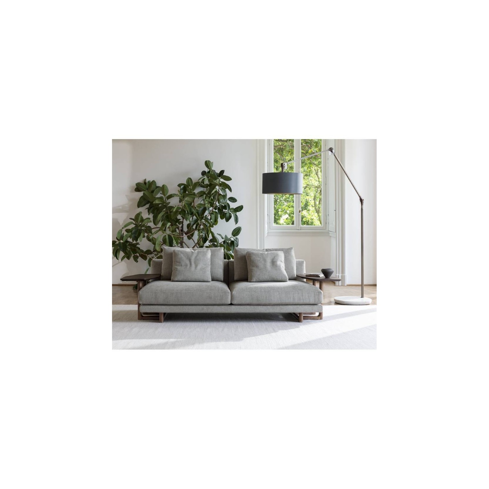 Sistema di sedute modulare con base in massello di noce canaletta e puntali in cromo nero e ottone spazzolato. Rivestimento sfoderabile nei tessuti della collezione e non sfoderabile in pelle.Le basi, disponibili in diverse dimensioni, a cui si aggiungono gli elementi trapezioidali che possono essere combinati per formare penisole o sedute con profondità maggiorata. I braccioli possono essere imbotti oppure con funzione tavolino integrato in legno massello di noce canaletta.Spedizione 5-6 settimane lavorative