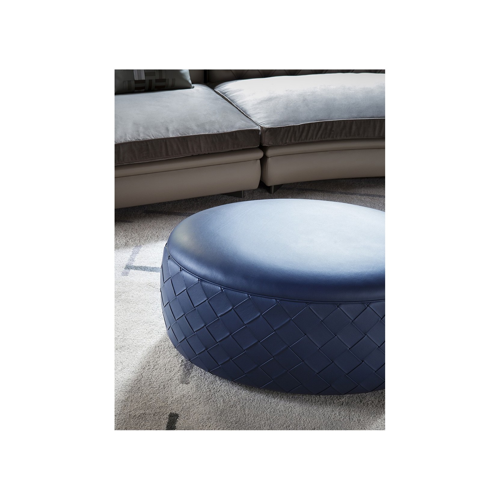 Il rivestimento presenta un'esclusiva lavorazione a intreccio con fasce in Pelle Frau® larghe 6 cm e disposte a 45°, che decorano la struttura perimetrale dei pouf. È disponibile nelle pelli ColorSphere® (SC) e Soul. Per i modelli ø46 De Luxe e 90x64 De Luxe, è possibile scegliere un rivestimento che combina due tipi di pelle: Pelle Frau® Motif Knits per la base e Velvety per la seduta. Un filetto in pelle delimita la seduta e si abbina sempre al rivestimento della base.