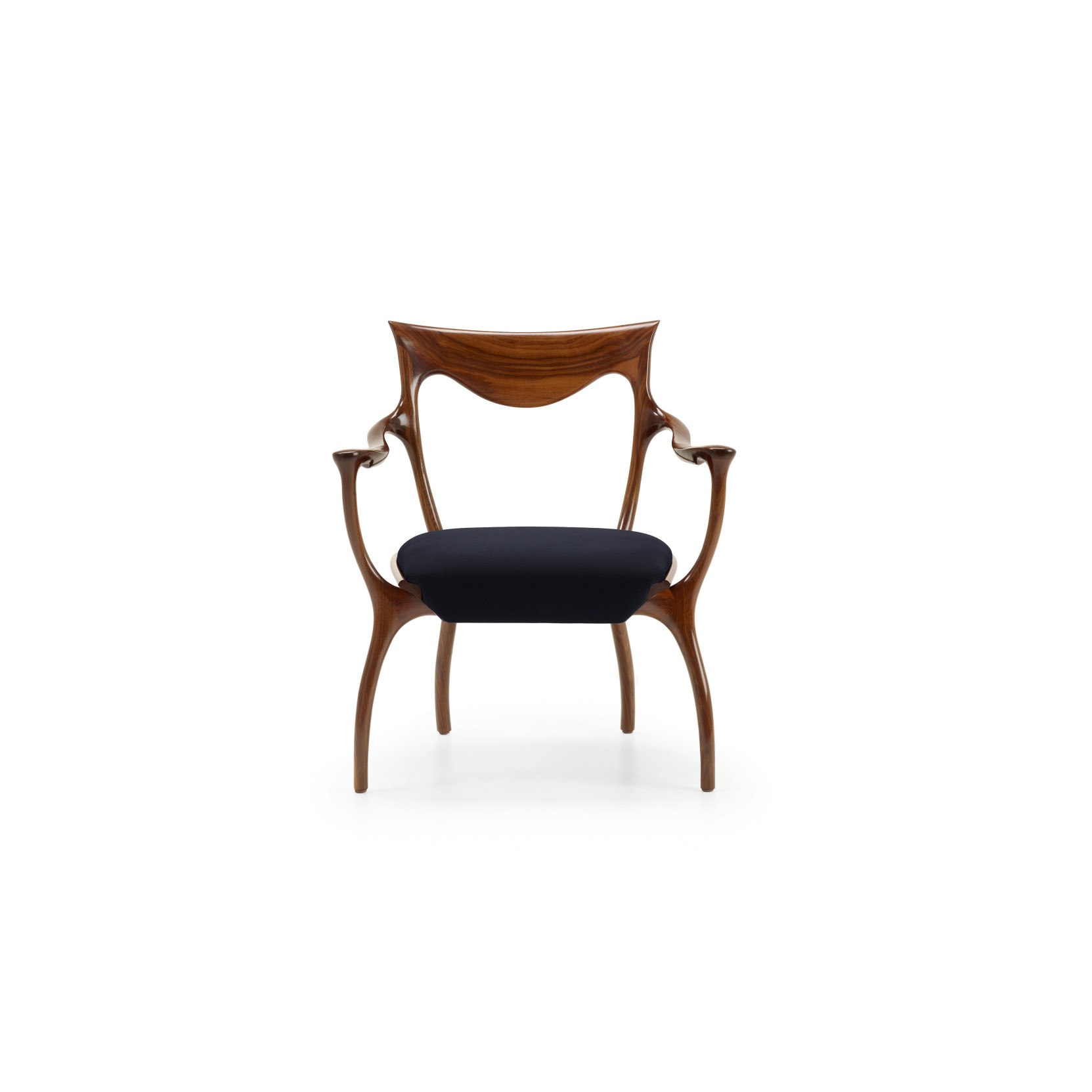 La struttura, realizzata in massello di noce americano, accoglie una seduta imbottita in multistrato, proposta in una ricca gamma di tessuti e pelli. Ogni poltrona è il frutto di un dialogo continuo tra il designer e il maestro artigiano, che trasforma uno schizzo in un’icona senza tempo, realizzata senza l’ausilio di disegni esecutivi ma con una profonda conoscenza della materia. Hypnos si distingue per l’equilibrio tra forma e funzione, per la sua eleganza scultorea e per la capacità di inserirsi con naturalezza sia in contesti domestici che contract. Disponibile in finitura gommalacca naturale o nera, oppure trattata ad olio, ogni versione esalta la qualità e la profondità del legno. È stata anche il punto di partenza per la nascita di un altro pezzo emblematico della collezione: il celebre D.R.D.P.