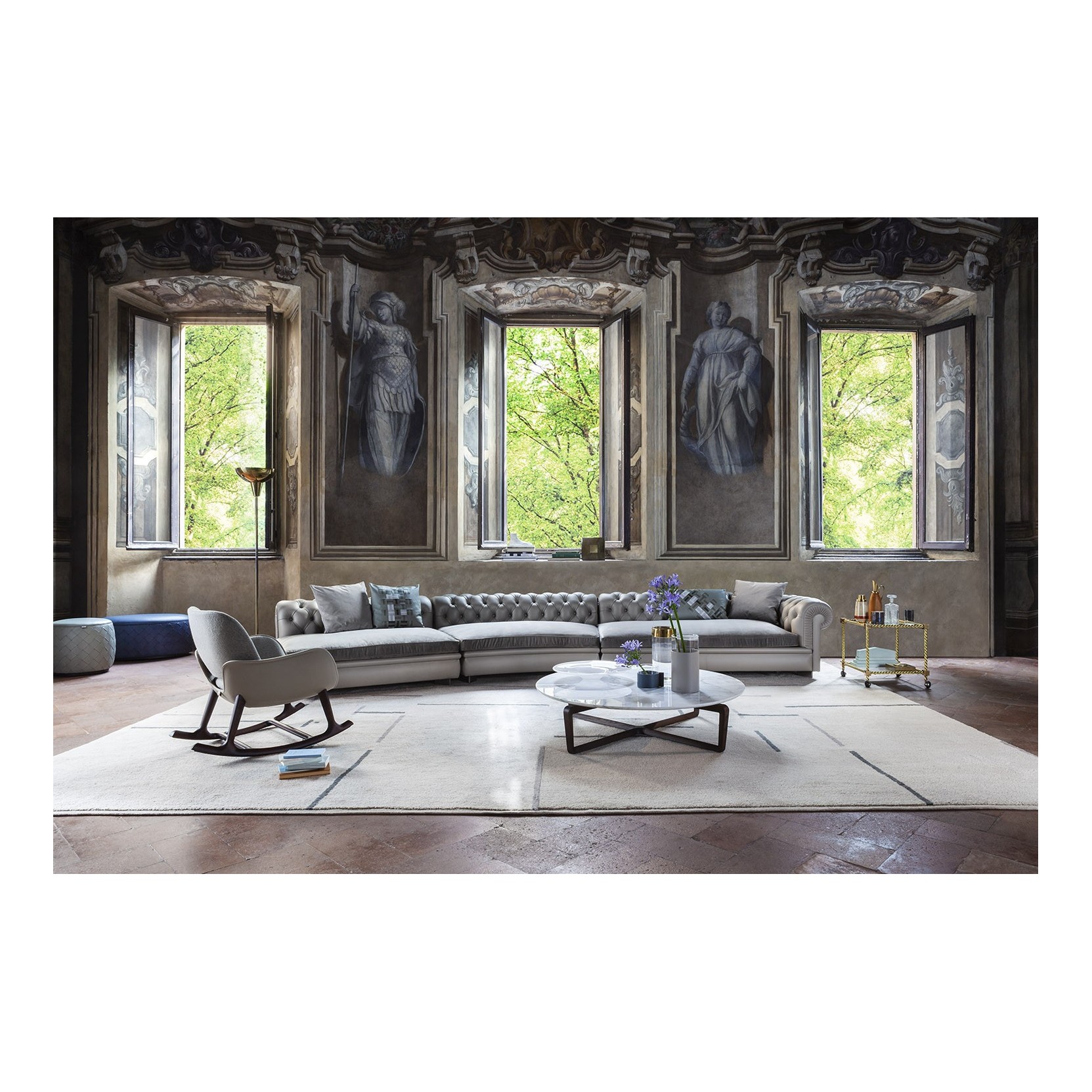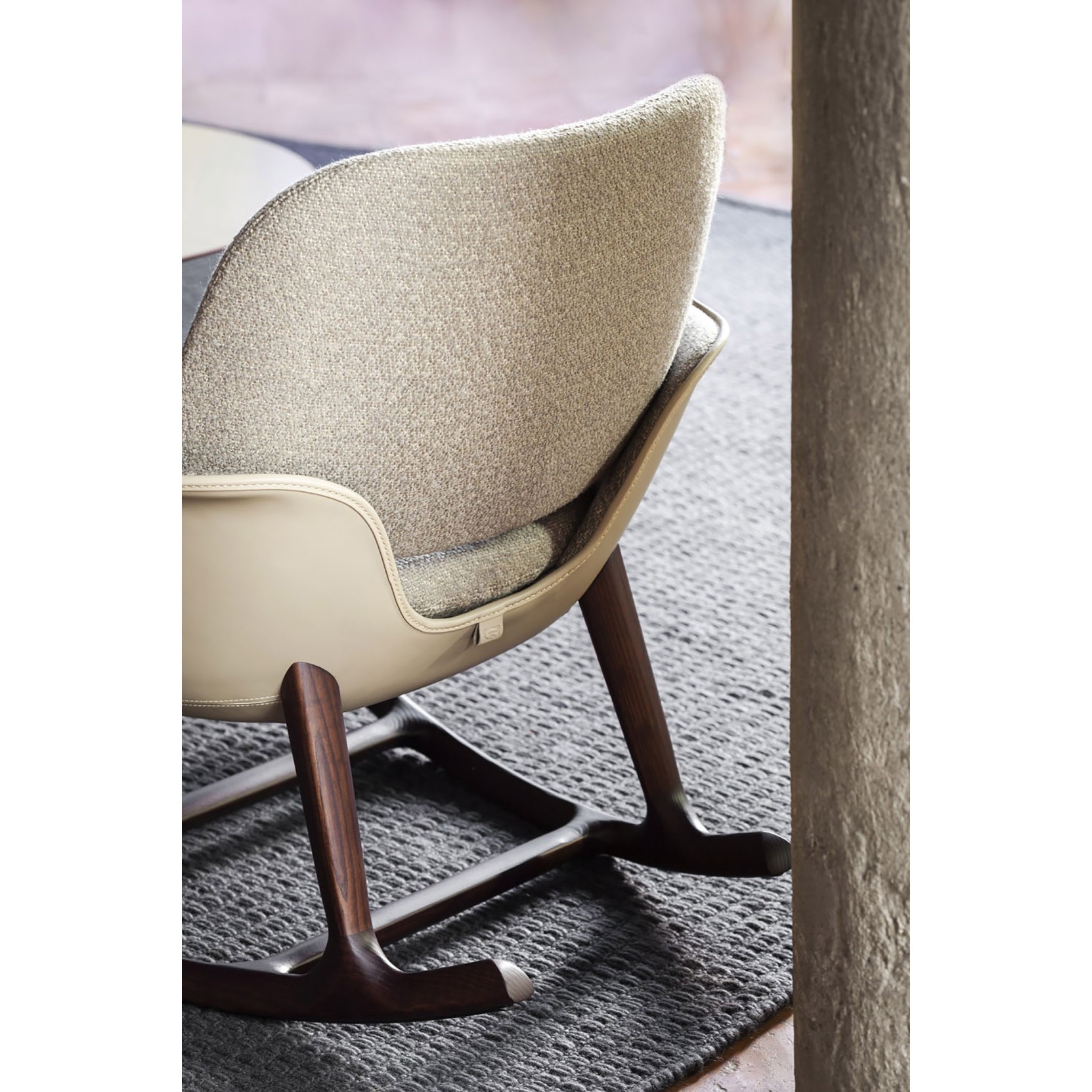 Il rivestimento combina più materiali, con la scocca esterna in un primo materiale e la superficie interna della seduta in un secondo. Le opzioni includono diverse combinazioni di Saddle Extra con Pelle Frau® ColorSphere®, Nest, Soul o una selezione di tessuti. Il cuscino della seduta è sfoderabile sia nelle versioni in pelle che in tessuto. Il raffinato accostamento tra i materiali è enfatizzato da eleganti cuciture in risalto.
