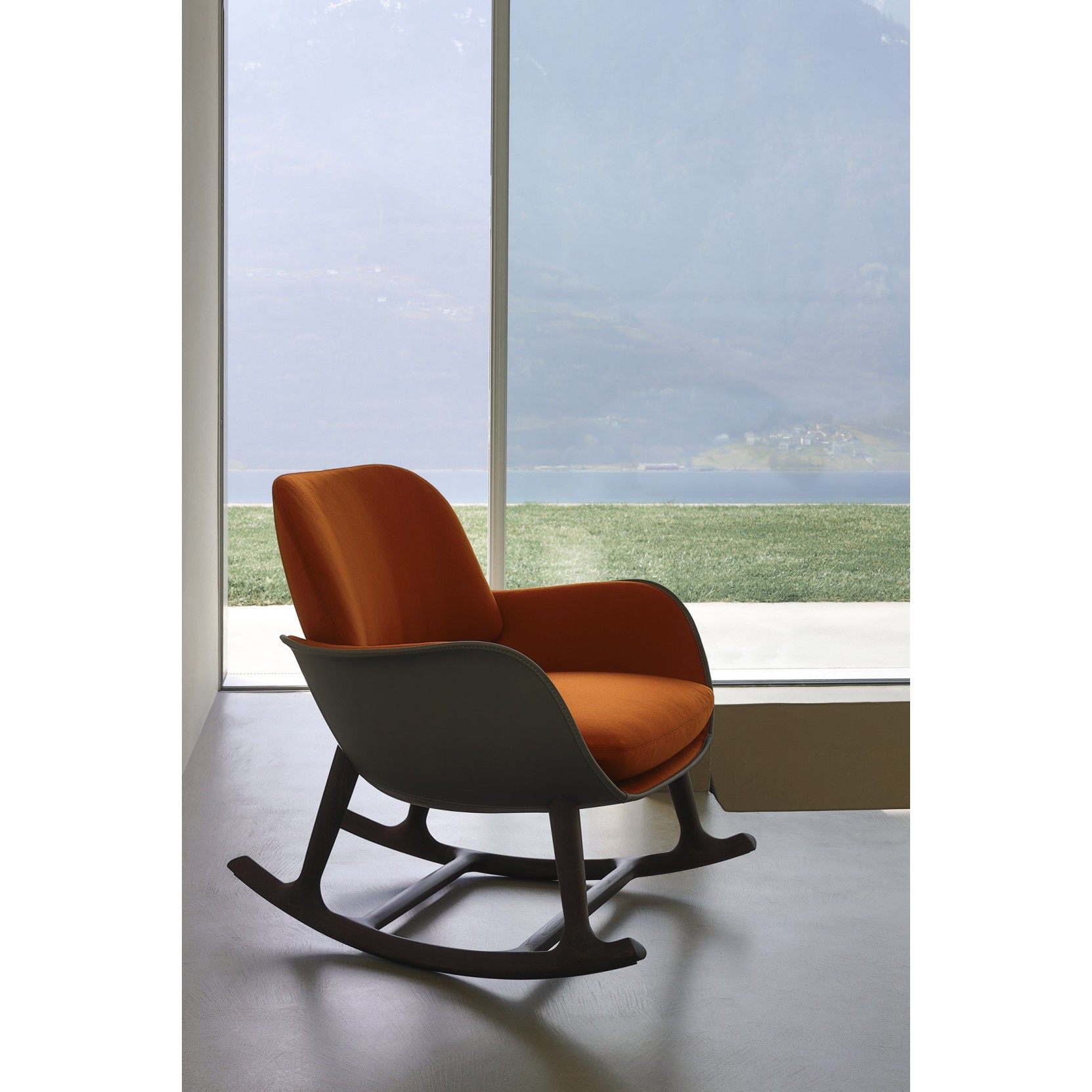 La base è disponibile in due versioni: con quattro gambe o a dondolo, entrambe realizzate in legno massello di frassino, nelle finiture tinto wengé o tinto moka.