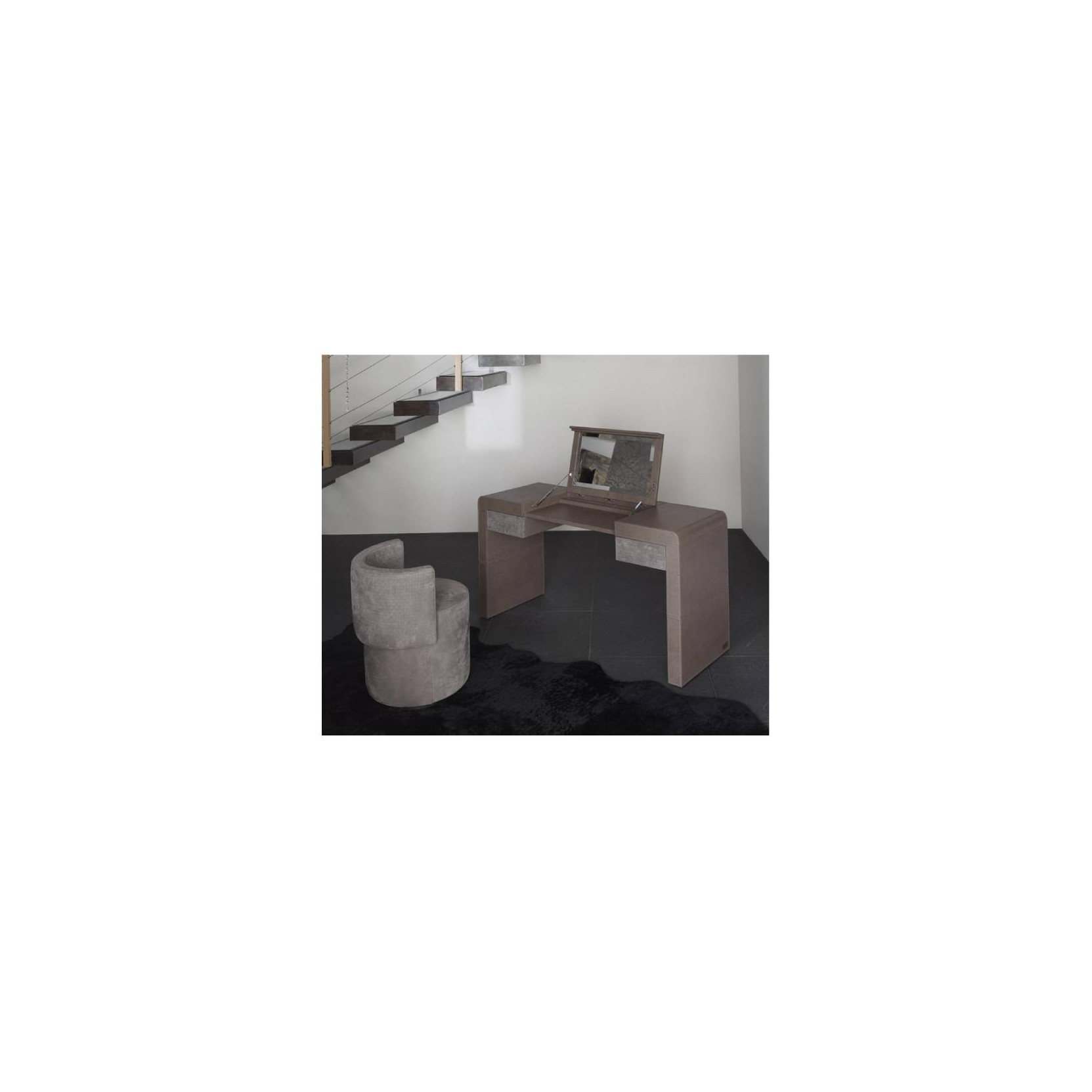 DIMENSIONI: Larghezza: 140 cm Profondità: 50 cm Altezza 73 cm: 115 cm MATERIALI E FINITURE: Poker firmata da Rugiano è una toletta con due cassetti, ribaltina e specchio. Rivestimento in pelle Cat. B GAL 19.