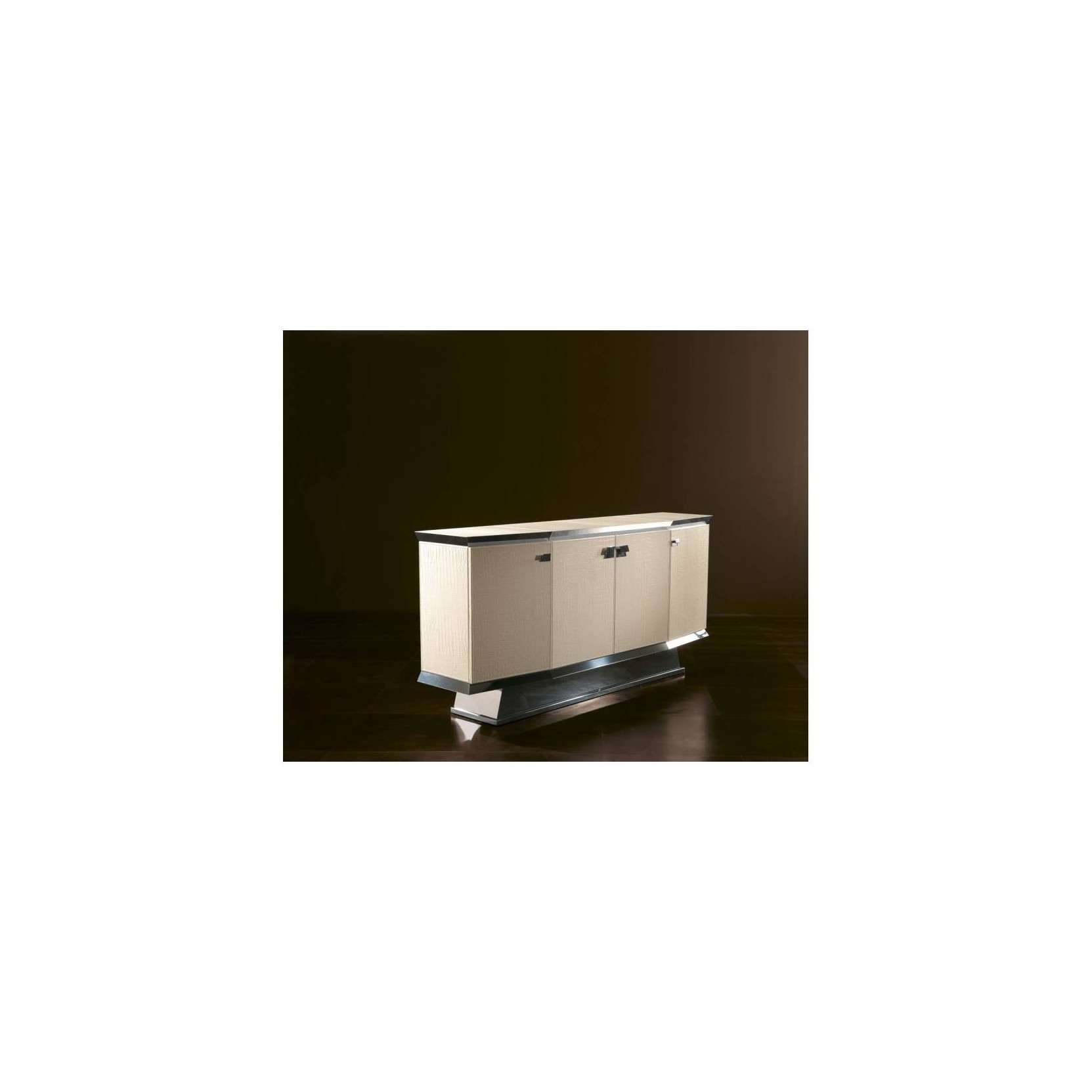DIMENSIONI: Larghezza: 216 cm Profondità: 50 cm Altezza: 102.5 cm MATERIALI E FINITURE: Morgana firmata da Rugiano è una madia rivestita in pelle e dettagli in acciaio o bronzo.