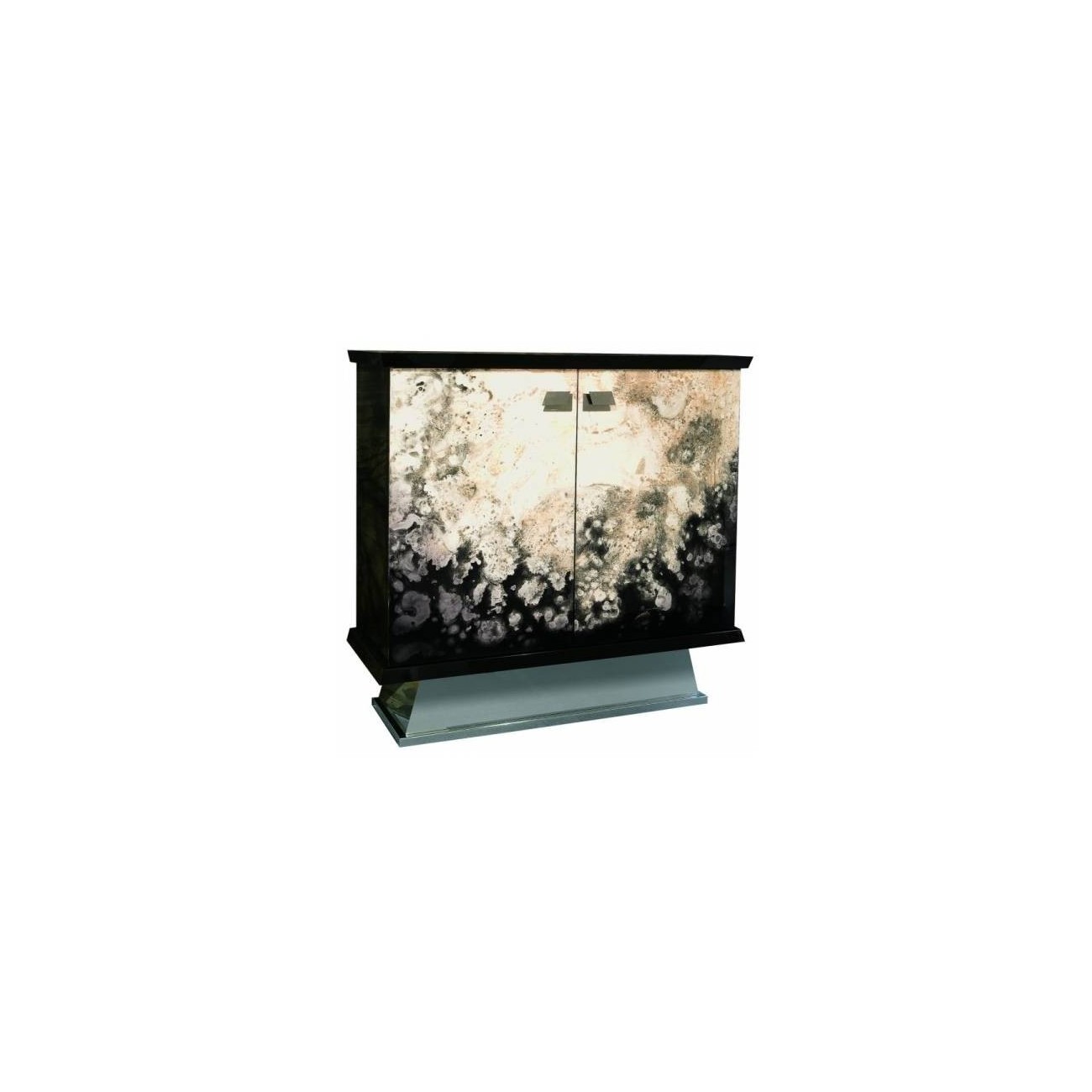 DIMENSIONI: Larghezza: 116 cm Profondità: 45 cm Altezza: 111.5 cm MATERIALI E FINITURE: Manhattan firmato da Rugiano è un mobile bar con ante in pelle o dipinte e struttura in laccato lucido. Base in acciaio o bronzo.