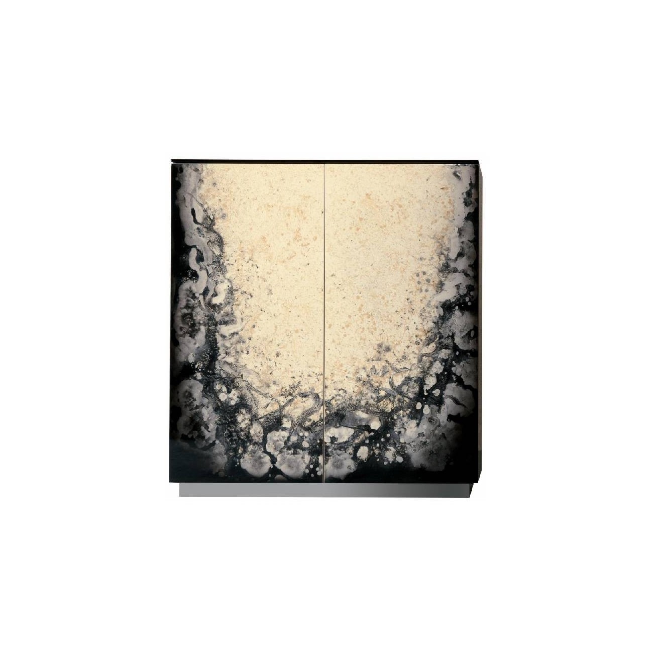 DIMENSIONI: Larghezza: 105 cm Profondità: 50 cm Altezza: 115 cm MATERIALI E FINITURE: Atlanta firmata da Rugiano è un mobile bar con ante in pelle o dipinte e struttura in laccato lucido.