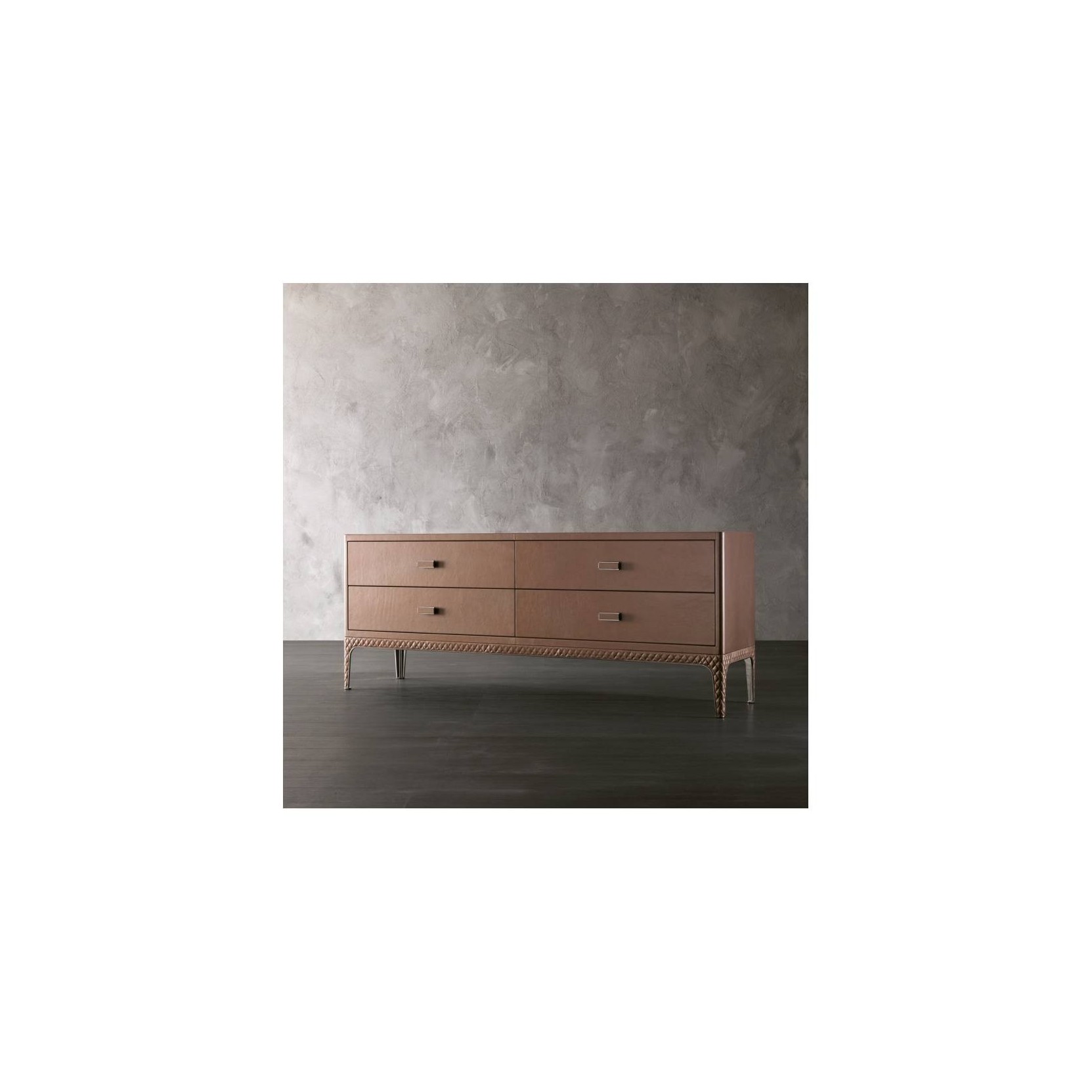 Dorian firmato da Rugiano è un comò con rivestimento in pelle. Dettagli in acciaio o bronzo. Disponibile con quattro cassetti. La lavorazione matelassè viene realizzata solo con pelli lisce morbide cat. C/D. Dire Rugiano è dire stile: quello di chi si distingue nella raffinatezza prodotti unici, senza tempo, destinati ad acquisire valore negli anni. Ma anche lo stile che prende vita dalla collaborazione di professionisti ed architetti di fama mondiale, dalla sapienza artigianale di chi con le mani sa trasformare i sogni in materia. Nascono così arredi per zona notte e zona giorno di grande carattere, caratterizzati da un sapiente ed originale uso di materiali nobili, dai metalli ai legni al pellame. Tutto nasce all’interno di Rugiano: innanzitutto l’idea, affidata all’Ufficio Stile che, in collaborazione con grandi nomi dell’architettura, dà forma sulla carta alle nuove collezioni. O che si pone al fianco del cliente e degli architetti nel caso si desideri un prodotto in tutto o in parte su misura, con un unico punto fermo: lo stile Rugiano. Così come nascono all’interno di Rugiano i materiali che andranno a comporre gli arredi: c’è chi lavora e decora la pelle, chi plasma il metallo, chi ricama i tessuti e chi si occupa dell’ebanisteria. Il tutto ancora con quei metodi e quella sapienza artigianali che hanno reso famosa in tutto il mondo la produzione mobiliera italiana. Così come nascono all’interno di Rugiano, infine, gli arredi completi, ognuno a modo suo espressione di diverse competenze da una parte tecniche e dall’altra artistiche in grado di vestire ogni abitazione di un’atmosfera unica. Un’atmosfera made in Rugiano. Tutto parte dalla materia prima: senza materiali di qualità non si possono fare prodotti di qualità. Per questo Rugiano utilizza per le proprie creazioni metalli nobili come bronzo, ottone e acciaio e si serve di pelli e stoffe di primissima scelta. E per questo esegue tutte le lavorazioni internamente, curando ogni particolare, anche il più piccolo e nascosto. Così nasce la qualità.