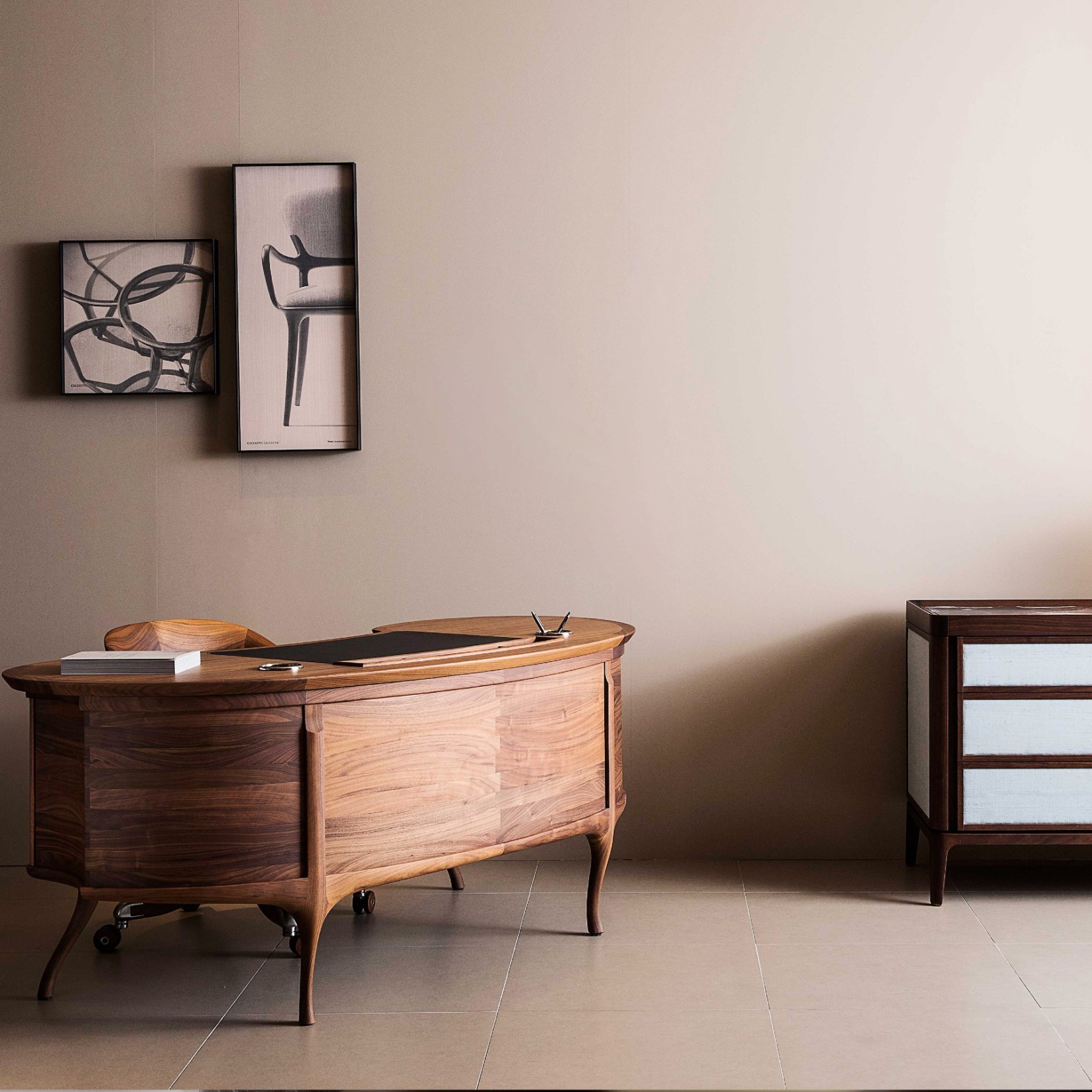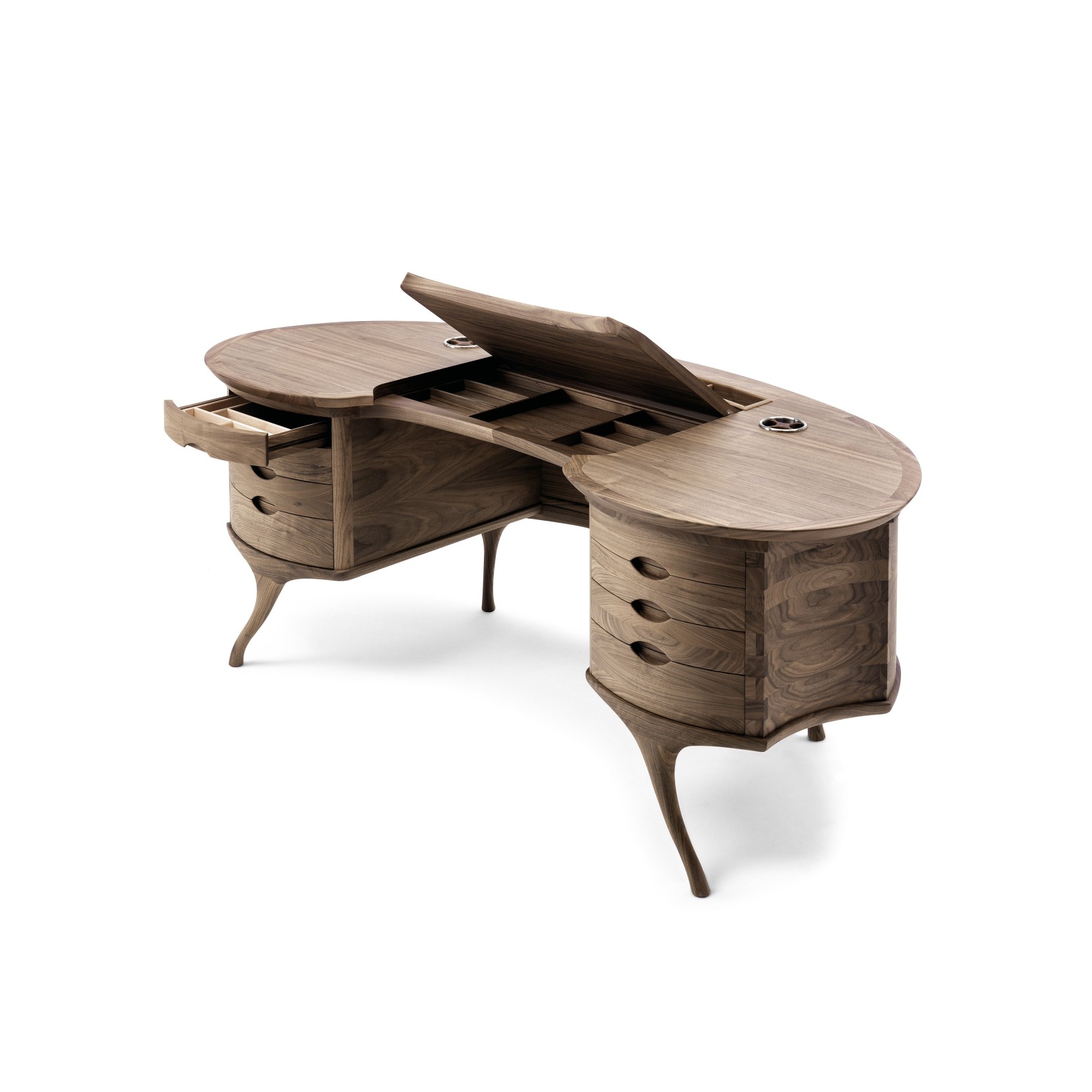 Realizzata in massello di noce americano, è frutto di un processo artigianale che coinvolge ben 346 componenti assemblate senza l’uso di viti, seguendo un rituale che richiede oltre due settimane di lavorazione manuale, dodici ore di finitura e otto di tinteggiatura. La verifica della qualità avviene ancora con metodi visivi e manuali, segno di una cura che va oltre la produzione in serie. Il piano, apribile, nasconde al suo interno un sottomano in pelle e una struttura in multistrato di pioppo impiallacciato con foglia spessa 1 mm, molto più pregiata rispetto agli standard industriali. L’interno è suddiviso in settori, con un vano portaoggetti centrale incassato e due portapenne laterali in ottone nickel satinato. Completano la scrivania otto cassetti, quattro per lato, con i primi due dotati di divisori in acero. Disponibile in due versioni: la più compatta, Bean 181, misura 181 cm in lunghezza, 87 cm in profondità e 75 cm in altezza, con un peso di 89 kg. La versione più ampia, Big Bean 210, arriva a 210 cm di lunghezza, 102 cm di profondità e mantiene i 75 cm di altezza, per un totale di 96 kg. Entrambe hanno un volume rispettivamente di 1,579 m³ e 2,076 m³. Personalizzabile nei dettagli, Bean può essere arricchita con interni in acero, fondi in cuoio, finiture in ottone brunito e una targhetta incisa. Perfetta in abbinamento con la sedia Marlowe, forma un insieme elegante e armonioso per lo studio o l’ufficio di casa.