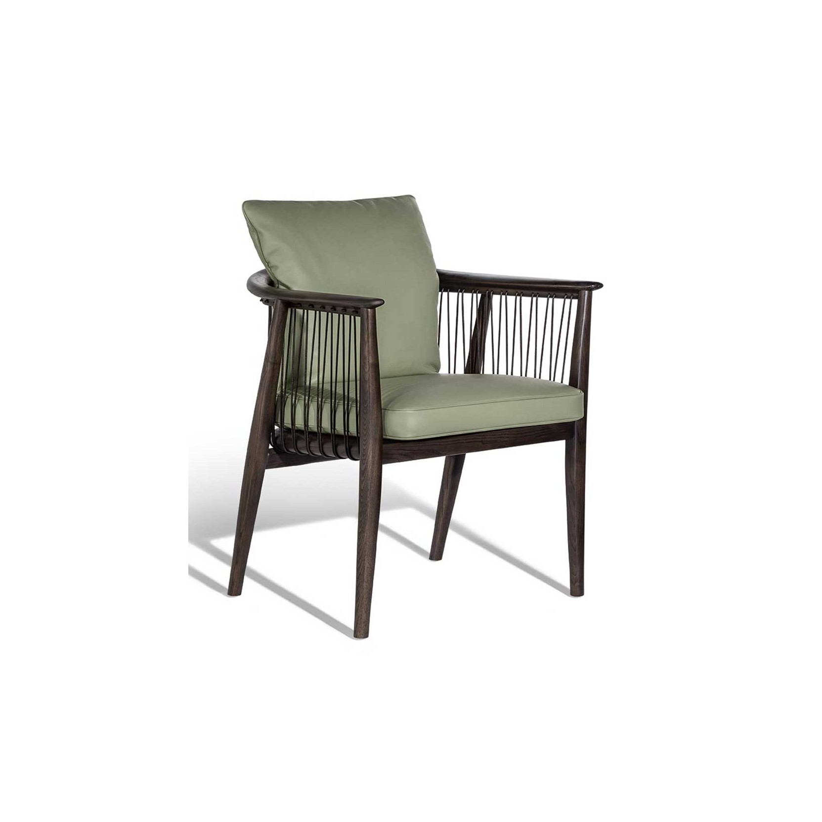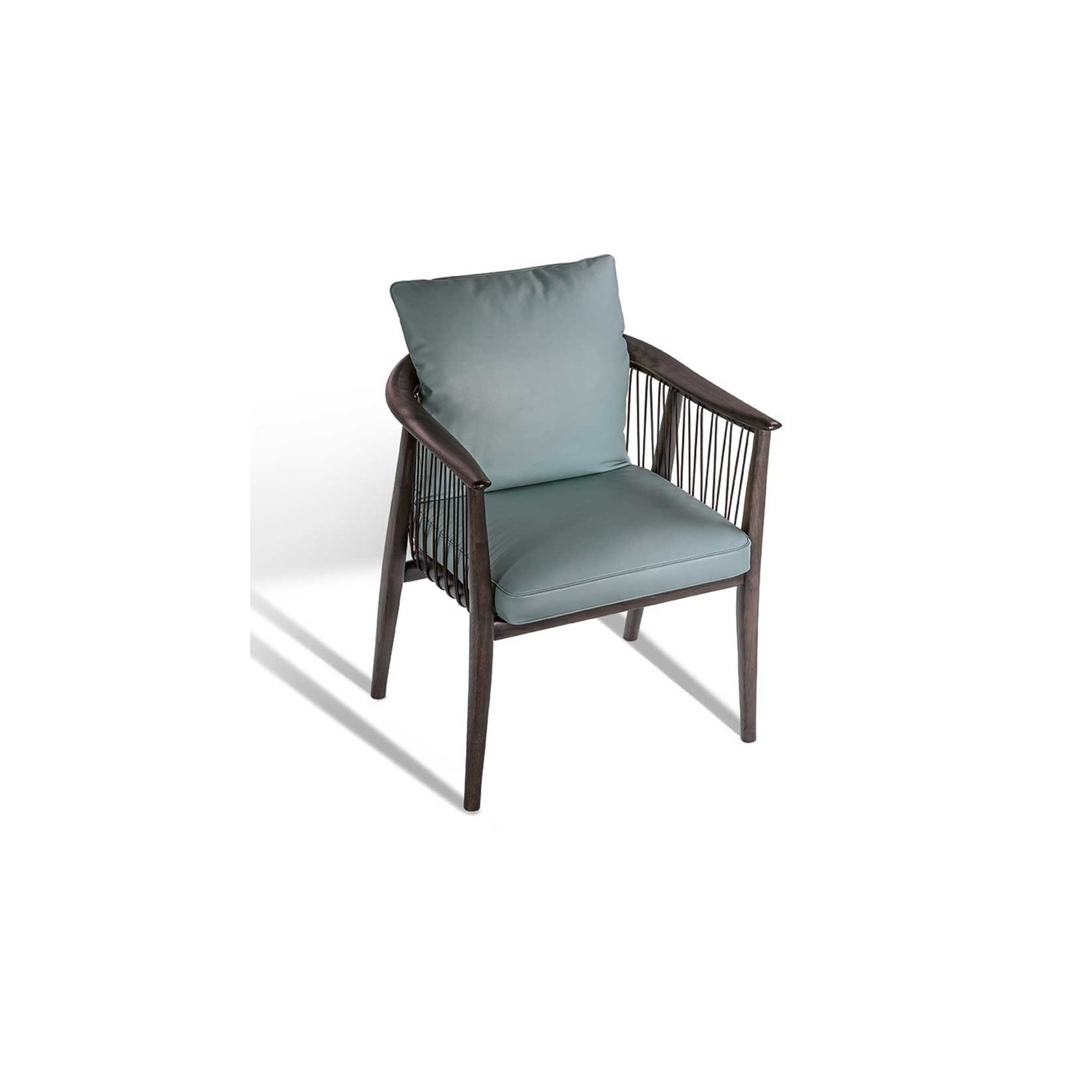 La struttura della poltroncina è realizzata in massello di frassino, disponibile in due finiture: tinto wengé o tinto moka. Un cordoncino in cuoio, lavorato a mano con un sofisticato intreccio, impreziosisce lo schienale e i fianchi. Il molleggio della seduta è garantito da cinghie elastiche. I cuscini di seduta e schienale sono composti da un unico corpo fissato al telaio tramite due bottoni automatici. Il cuscino schienale è realizzato in piuma con un inserto in poliuretano espanso, mentre il cuscino seduta è in poliuretano espanso e ovatta poliestere. Il rivestimento è disponibile in Pelle Frau® o in tessuti selezionati, come ColorSphere®, Nest, Soul, e altri, ed è completamente sfoderabile sia per la versione in pelle che in tessuto.