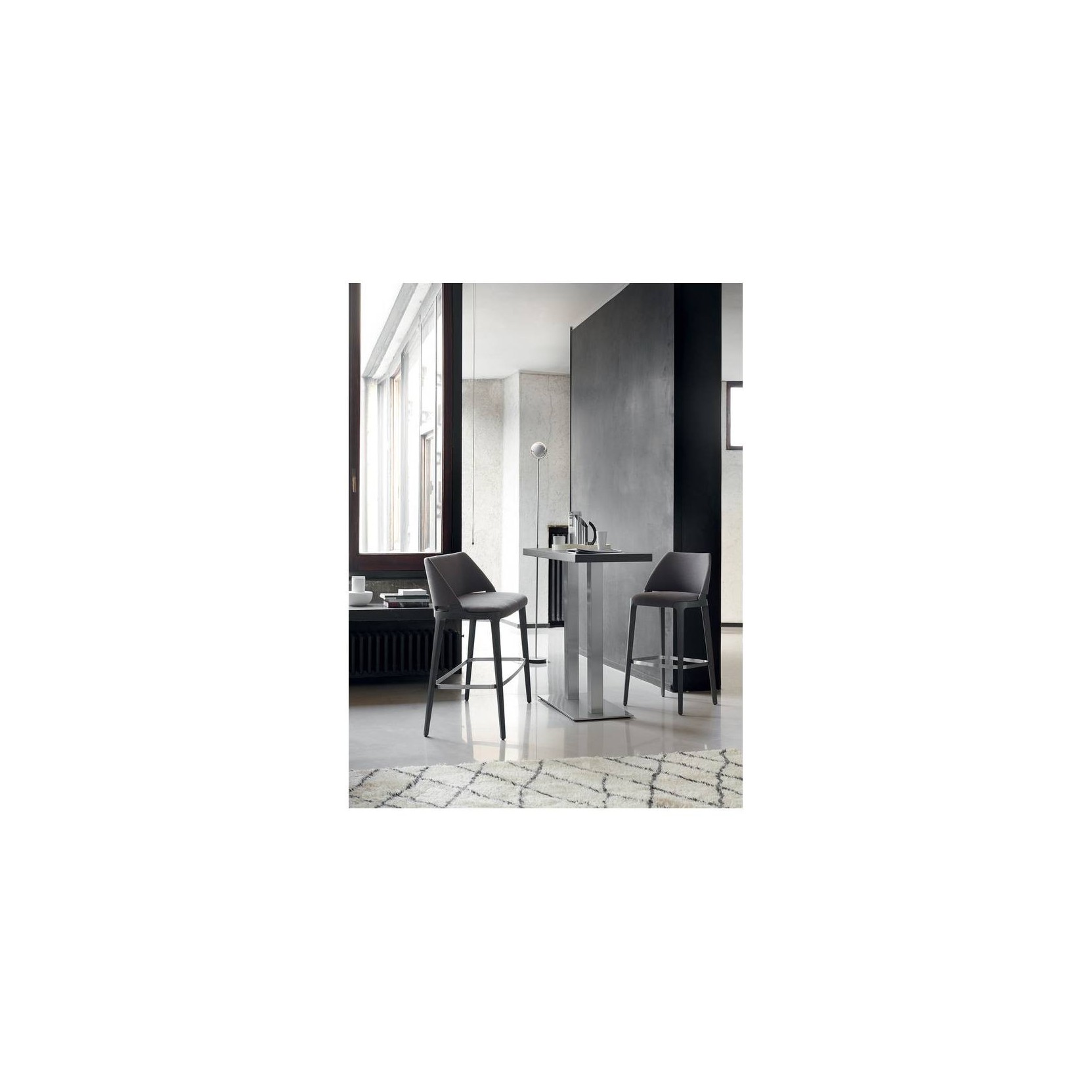 MATERIALI E FINITURE: Le gambe in frassino o noce canaletto che incontrano seduta e schienale imbottiti, in poliuretano espanso ignifugo, in una cornice di legno massello, sono la caratteristica distintiva dello sgabello Velis.