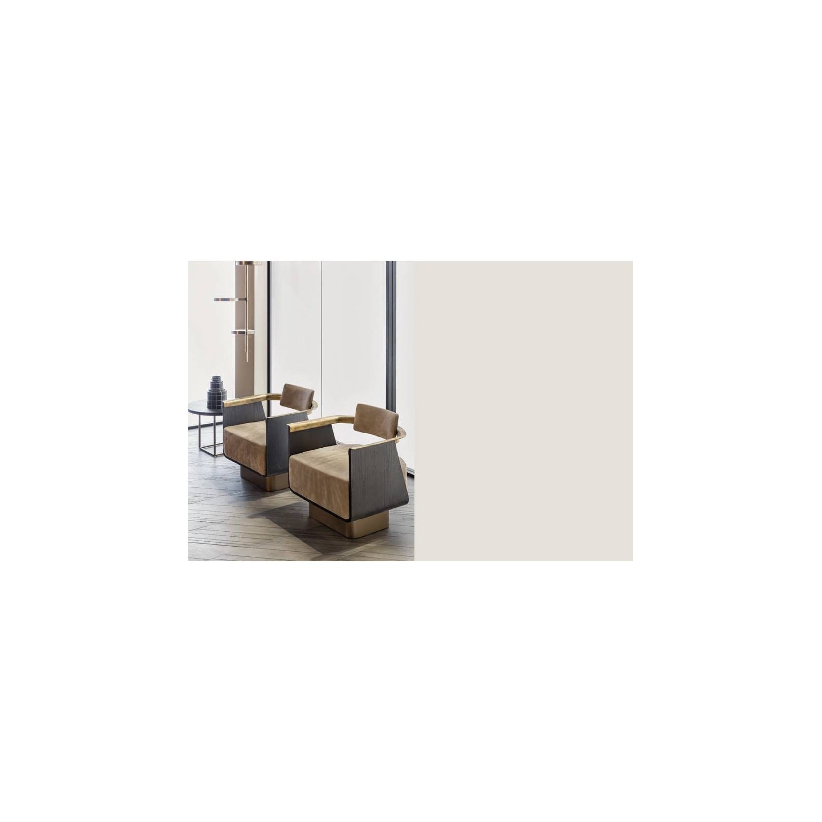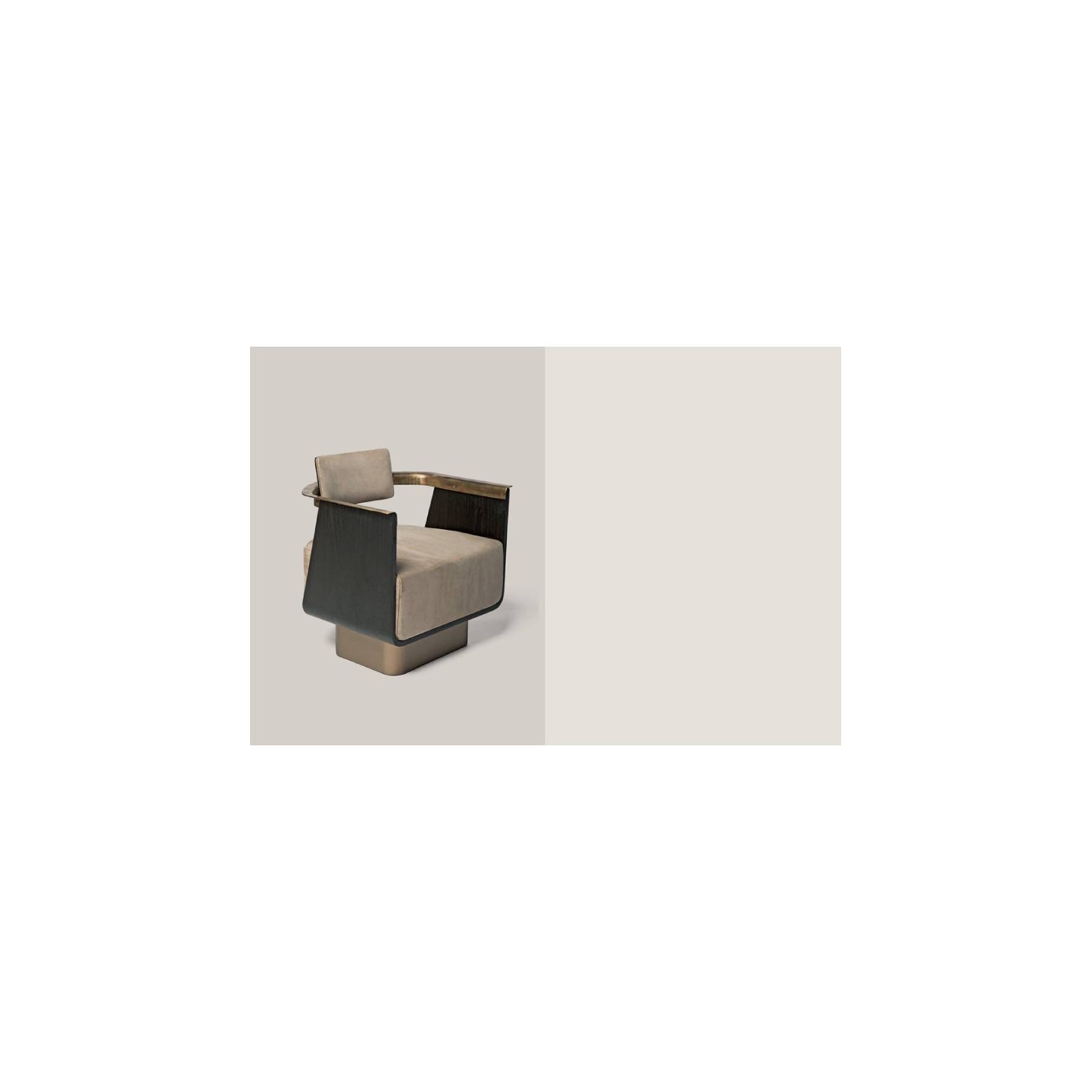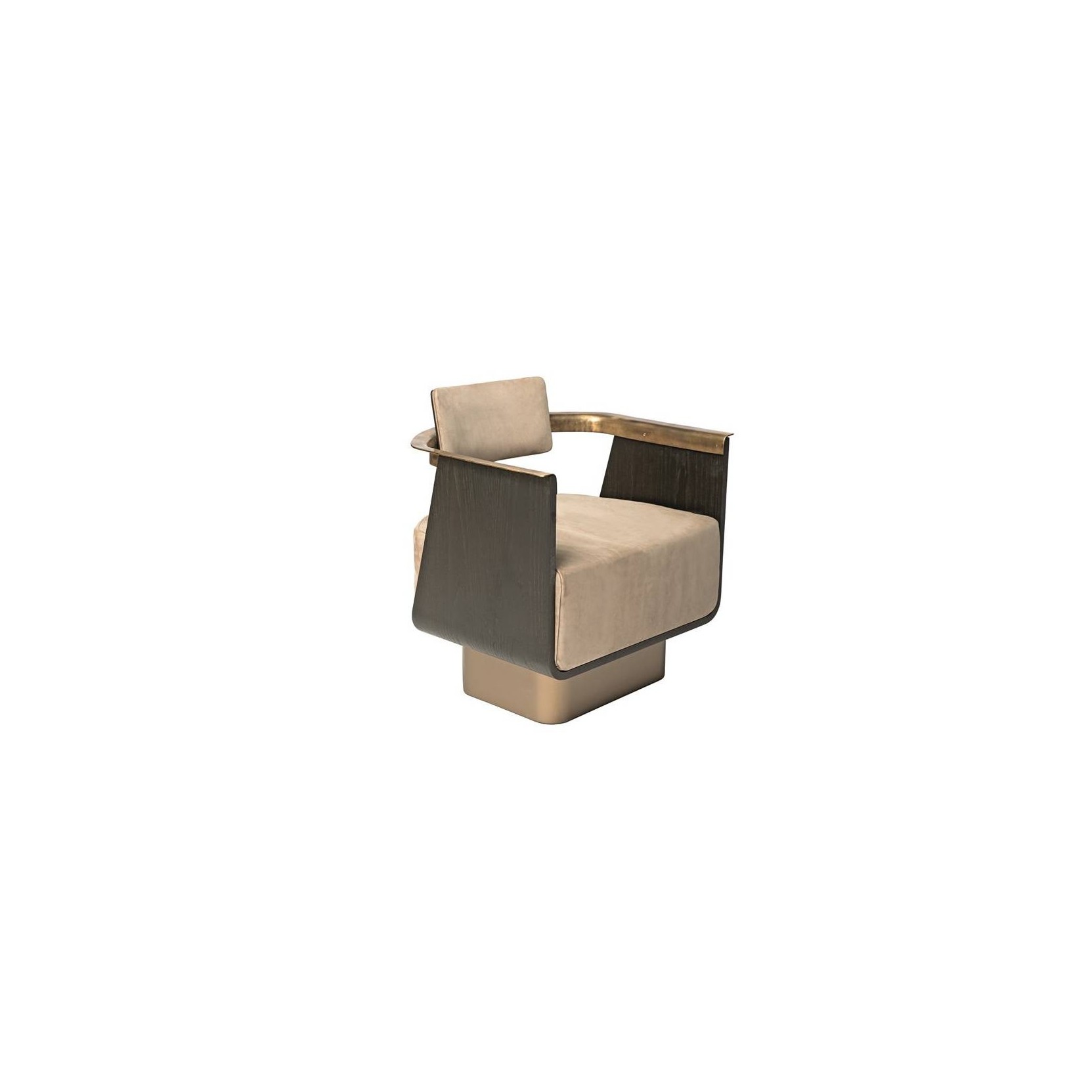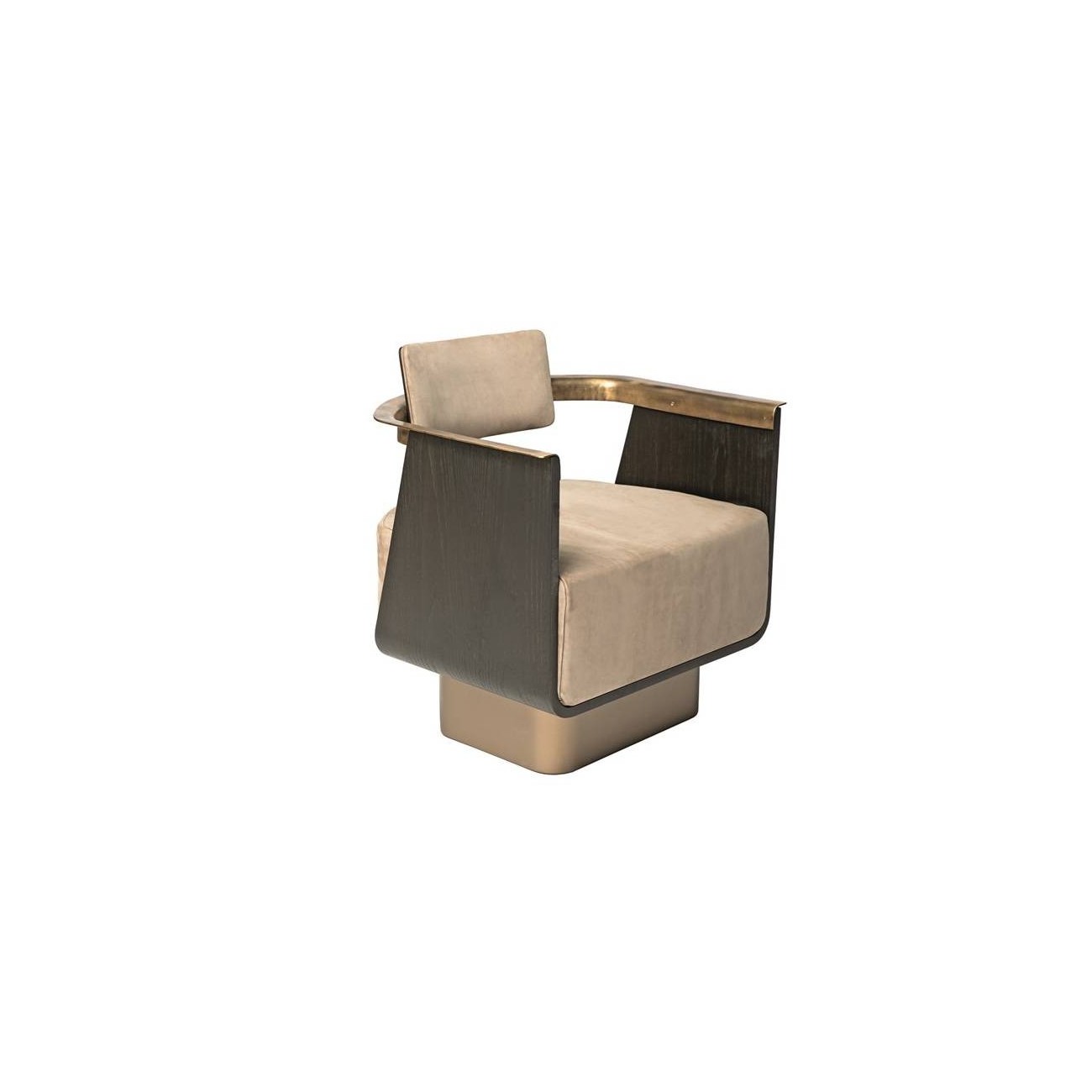 Poltrona imbottita in pelle (P20 nabuk liscio col. seppia) con scocca e retro schienale in legno (finitura T150 noir), basamento in bronzo scuro e bracciolo in ottone brunito della collezione BOSTON di SHAKE.Spedizione 5-6 settimane lavorative