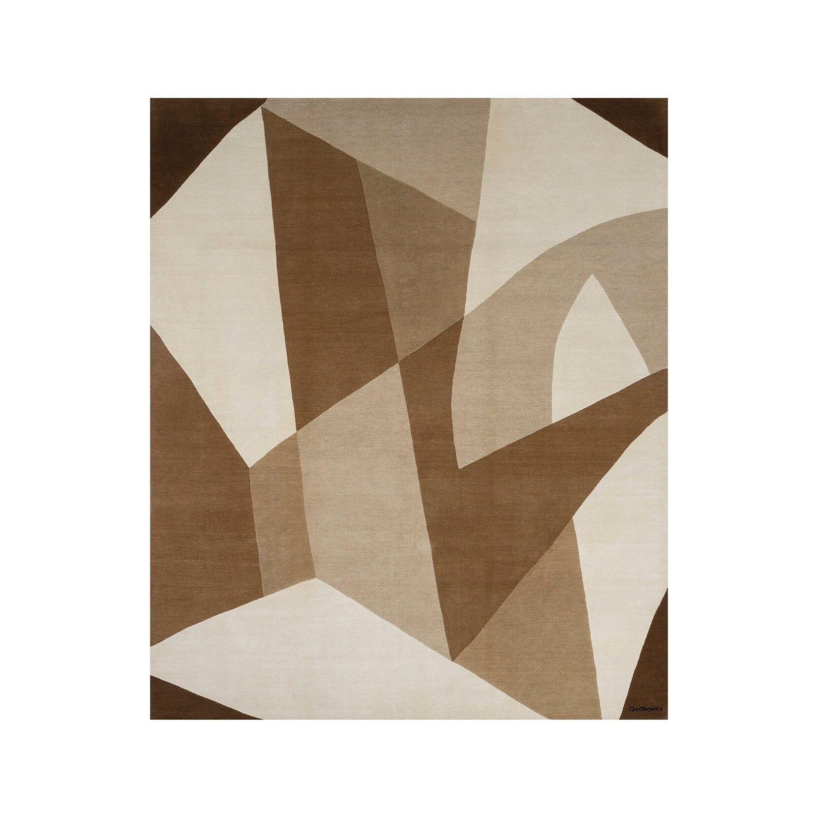 Il tappeto Riflessi, disegnato da Gio Ponti, presenta forme che ricordano i diamanti e riflettono la luce creando sovrapposizioni di figure trasparenti angolari, conferendo al pezzo un aspetto moderno e sofisticato.