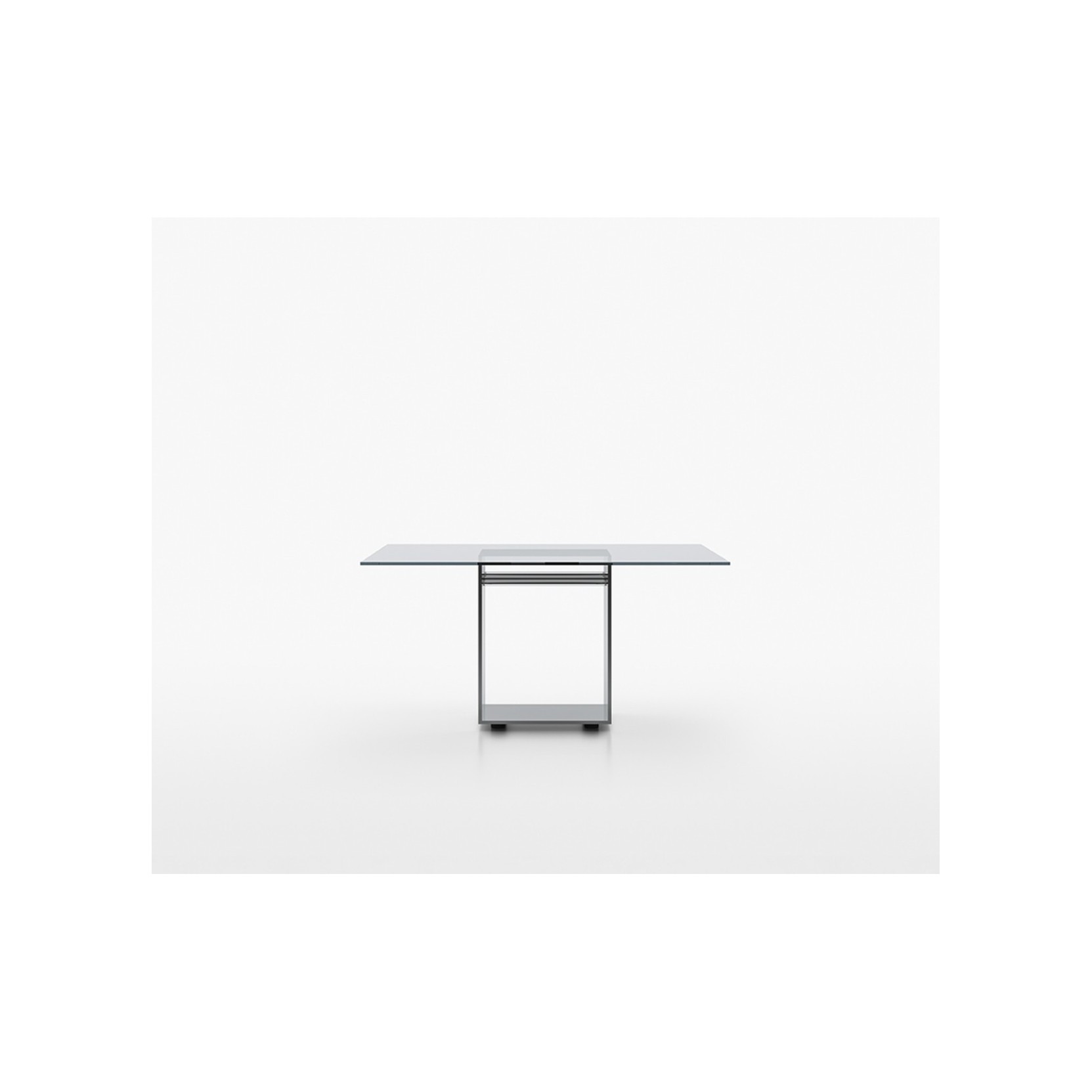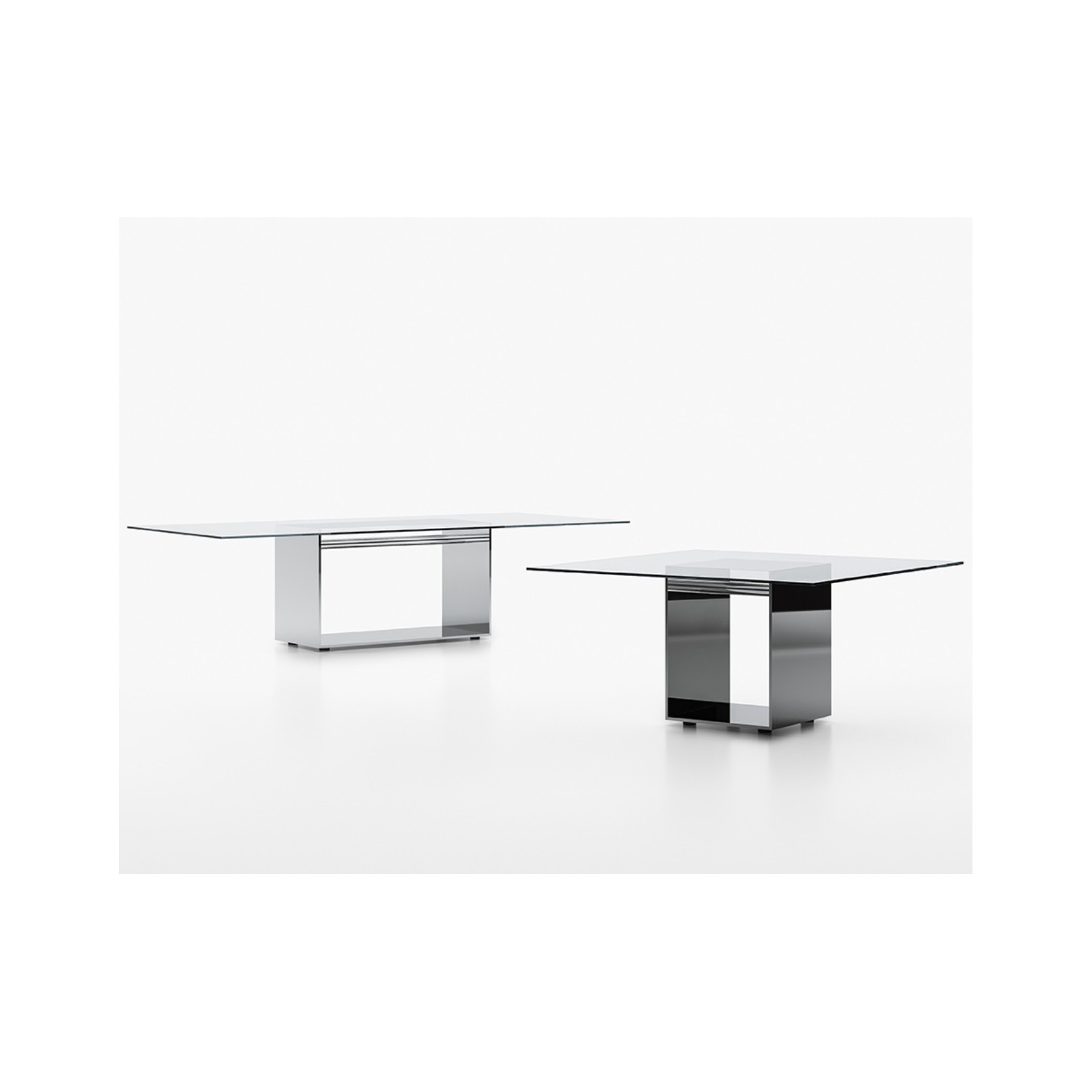 Il tavolo si distingue per l’eleganza del piano in cristallo trasparente, una lastra di vetro float spessa 15 mm, arricchita da un riquadro centrale sabbiato sul lato inferiore. Questo elemento poggia su una base rettangolare cava, innovativa nella sua costruzione, che all’esterno mostra la brillantezza dell’acciaio inox lucidato a specchio, mentre all’interno offre la possibilità di diverse finiture, dal cristallo laccato nero al vetro a specchio in tonalità classica o piombo. L’unione di trasparenze, riflessi e contrasti materici conferisce a Glimm un carattere di leggerezza e sofisticata modernità.