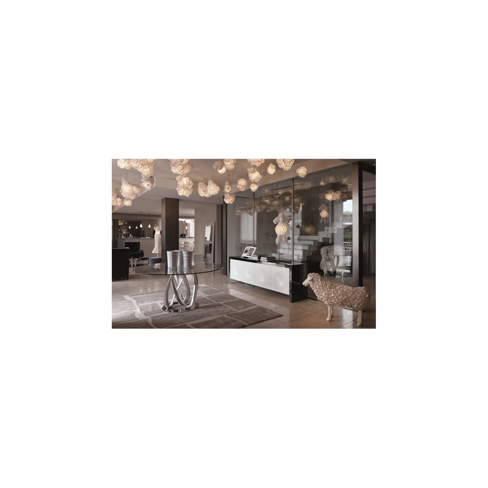 Infinity è un tavolo di Stefano Bigi per Porada, base in massello di noce canaletta montata su piastra in metallo e piano ellittico in cristallo temprato (12mm). Infinity è un tavolo con una base dal design organico. Come fosse un elemento della natura, come radici di grandi alberi secolari. Un elemento d'arredo protagonista nell'ambiente in cui è inserito. La contrapposizione dei materiali, la leggerezza impalpabile del cristallo e l'armoniosa base in noce creano un tavolo dalla forte personalità ed eleganza.In questa versione: noce canaletta, cristallo trasparente temperato, metallo cromato.