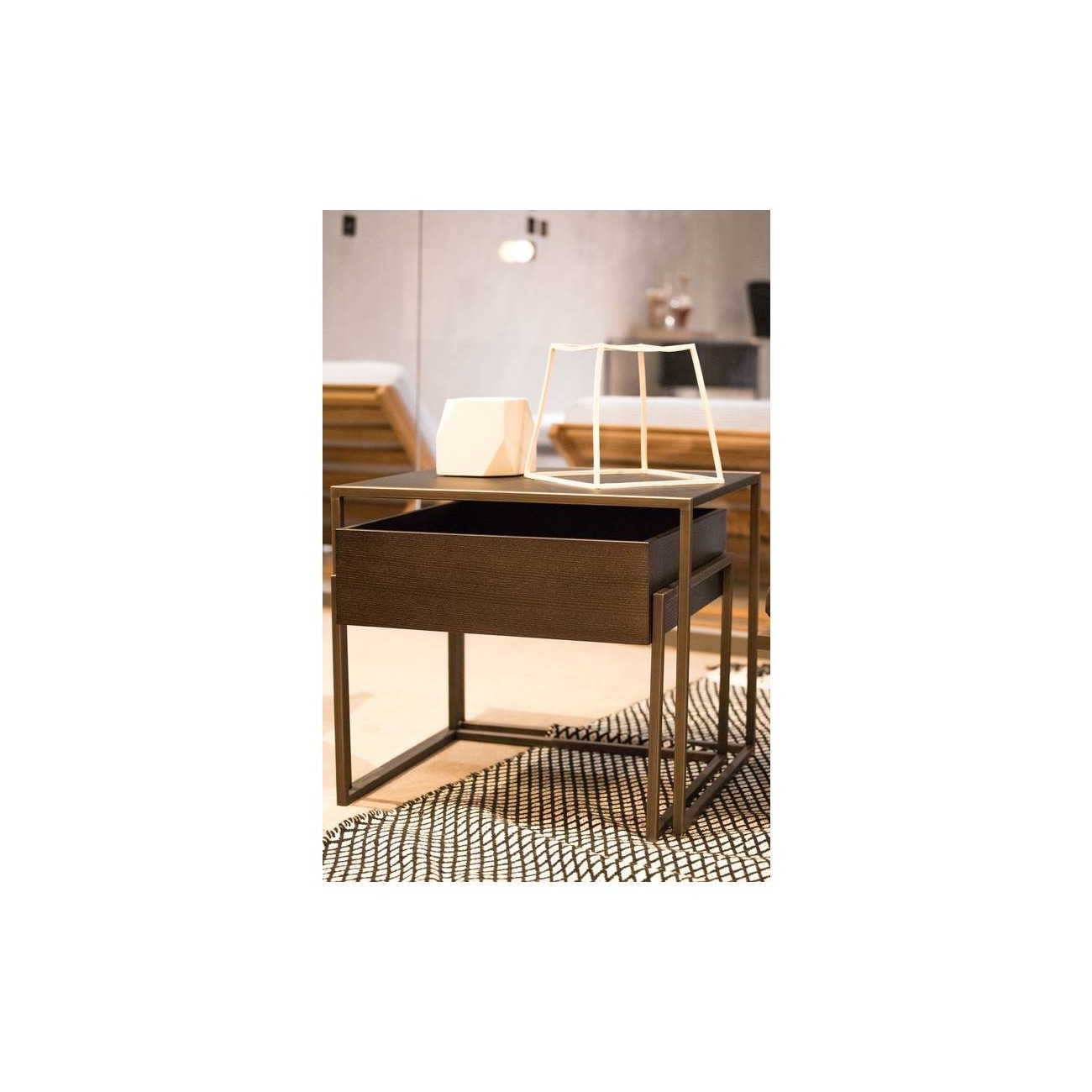 MATERIALI E FINITURE: Coppia di tavolini con struttura in metallo ottone brunito. Piano superiore laccato nero opaco. Tavolino sottostante, con contenitore aperto, disponibile in frassino o noce Canaletto.