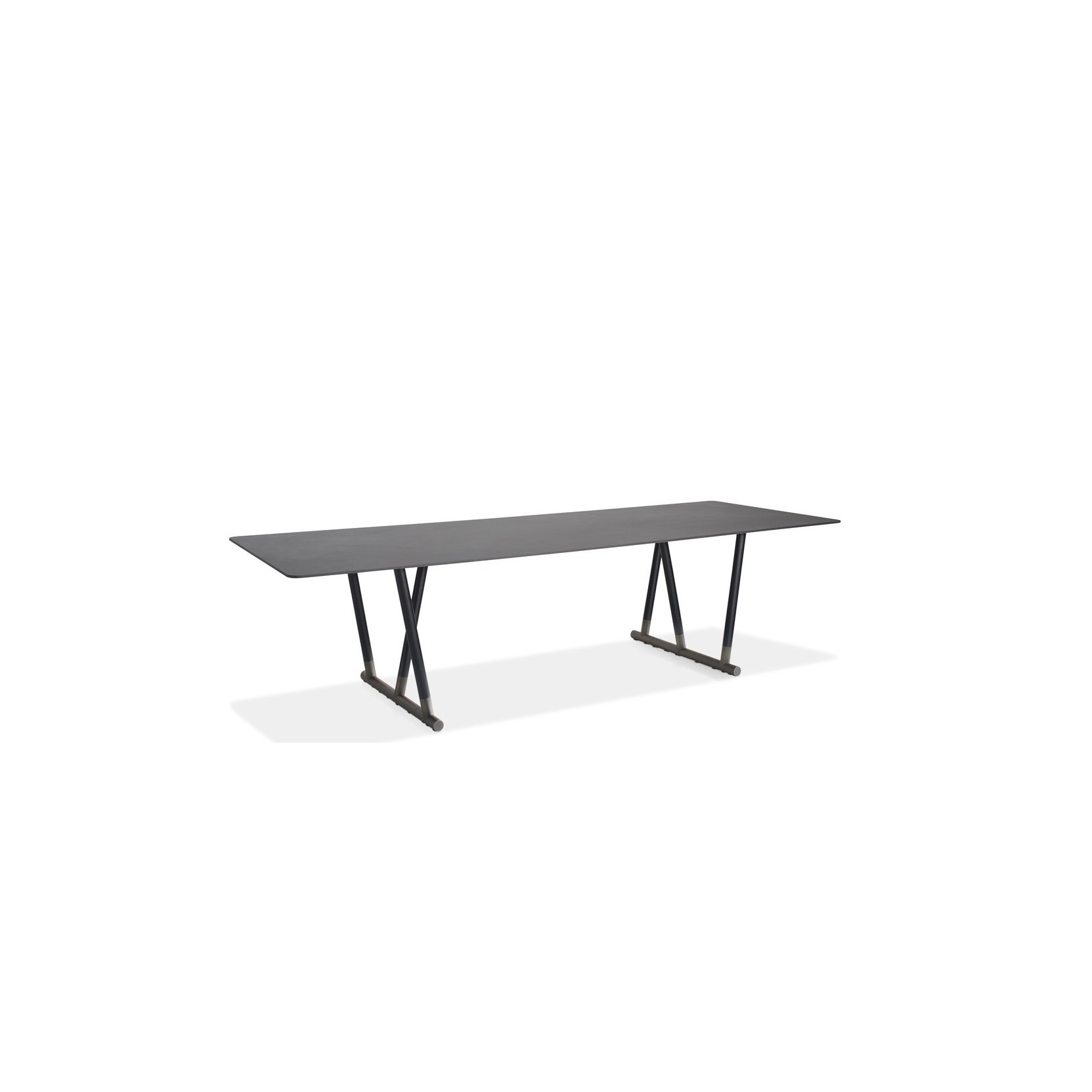 Pipe è un tavolo con gambe in frassino che terminano in piedini in tubolare in ottone brunito.Tavolo architettonico, Pipe è caratterizzato da un ampio piano in marmo Bianco Carrara, frassino o gres porcellanato, disponibile nelle dimensioni cm 300x108 e 260x108. Ad animarne la silhouette, la struttura a compasso idealmente composta da due cavalletti capovolti che terminano in un piedino in tubolare in ottone brunito, da cui le gambe del tavolo in frassino nelle finiture a collezione, scaturiscono verso direzioni opposte.