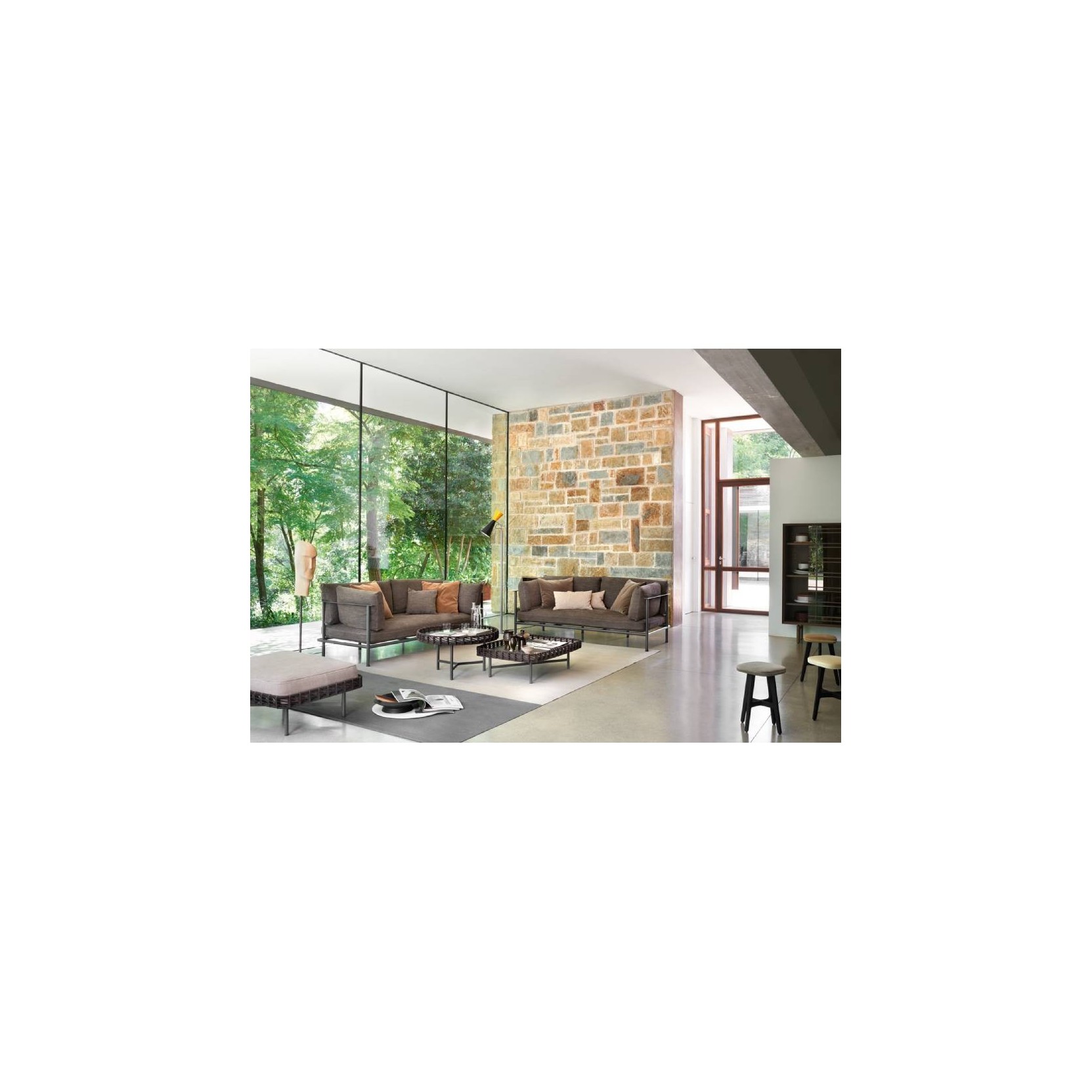 MATERIALI E FINITURE: Il tavolino Ropu è disponibile nelle due versioni rettangolare e tonda, con struttura in due diverse altezze in metallo verniciato goffrato e piano in marmo, vetro retroverniciato, grès porcellanato o hpl. La cornice è realizzata con un intreccio a mano in cordino grezzo, di cuoio o cordino “Gassa”.Dalle rimembranze esotiche, Ropu si distingue per la bordatura intrecciata in cordino di cuoio nella versione per interni, o nautico per gli esterni, che corre lungo il perimetro creando una cornice per top in marmo, vetro retroverniciato e hpl oppure soffici cuscini con profili a coda di topo. Con base a quattro gambe in metallo, la collezione è disponibile nella versione tavolino basso con piano rettangolare o alto con piano tondo e pouf rettangolare, da abbinare in libere composizioni.