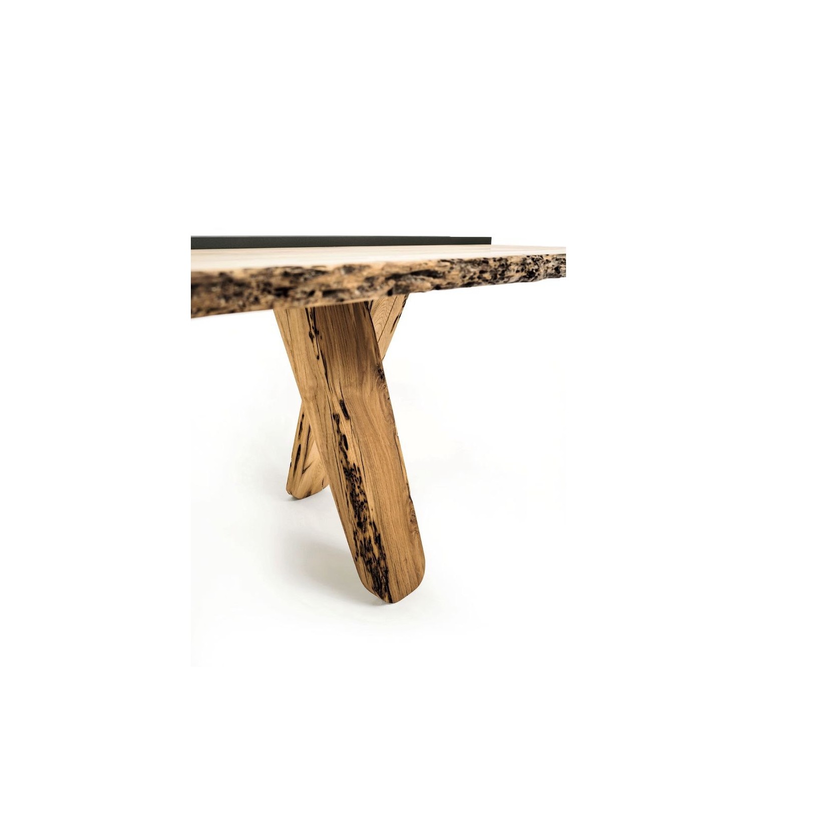 Tavolo realizzato in legno massello, con top a liste incollate e lati squadrati dotato di vano centrale in ferro con funzione contenitiva. A sorreggere il piano quattro possenti gambe a sezione geometrica. Finitura: a base di olio/cera di origine vegetale conestratti di pino.Spedizione 5-6 settimane lavorative
