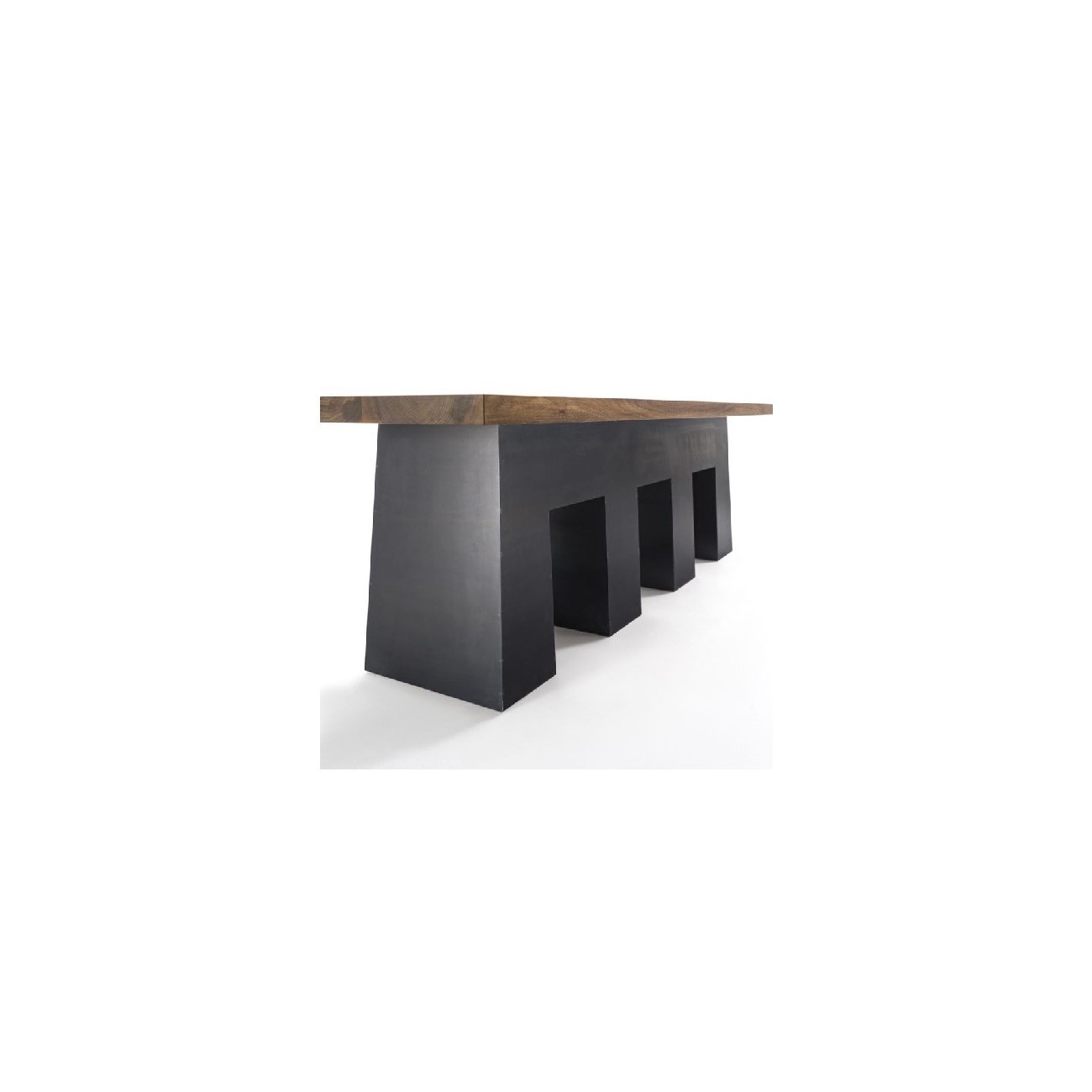 Tavolo realizzato con top in massello, base geometrica in ferro con saldature a vista. e con sagomatura speciale per contenere una serie di sgabelli a scomparsa ed estraibili. Finitura: a base di olio/cera di origine vegetale con estratti di pinoSpedizione 5-6 settimane lavorative
