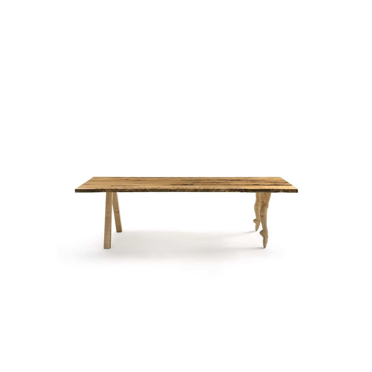 Tavolo con top in legno massello a liste incollate con lati squadrati,dotato di due gambe a cavalletto e due gambe di ballerina.Caratterizzato da un particolare gioco di cromie, che spaziano dal rovere naturale al rovere Vulcano. Finitura: a base di olio/cera di origine vegetale conestratti di pino.Spedizione 5-6 settimane lavorative
