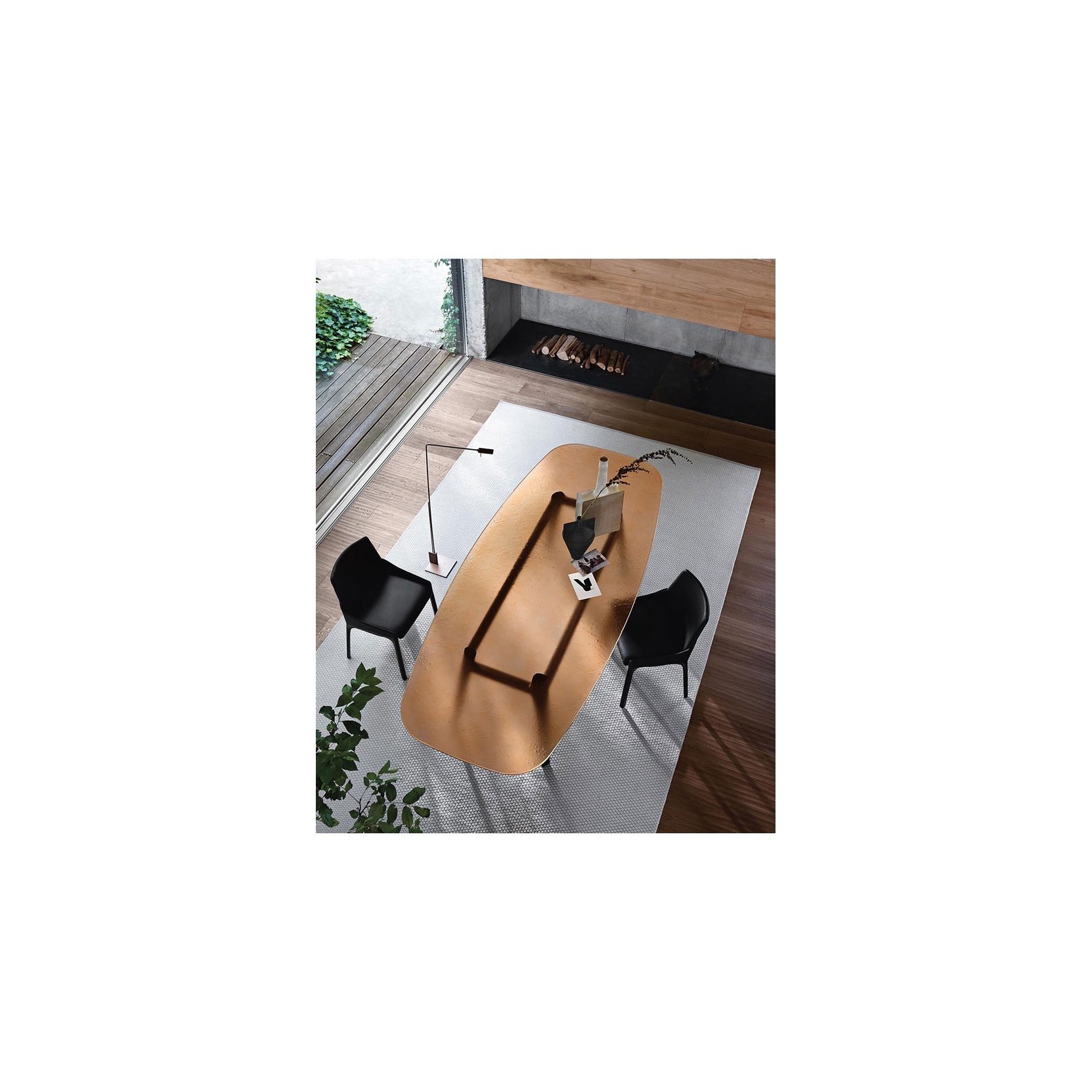 Tavolo con piano in vetro da 15mm fuso a gran fuoco e temperato, disponibile nelle tinte trasparenti Fumo, Blu, Ambra o Naturale effetto satinato. Struttura in legno massello disponibile nelle finiture rovere naturale o tinto grigio.Spedizione 5-6 settimane lavorative