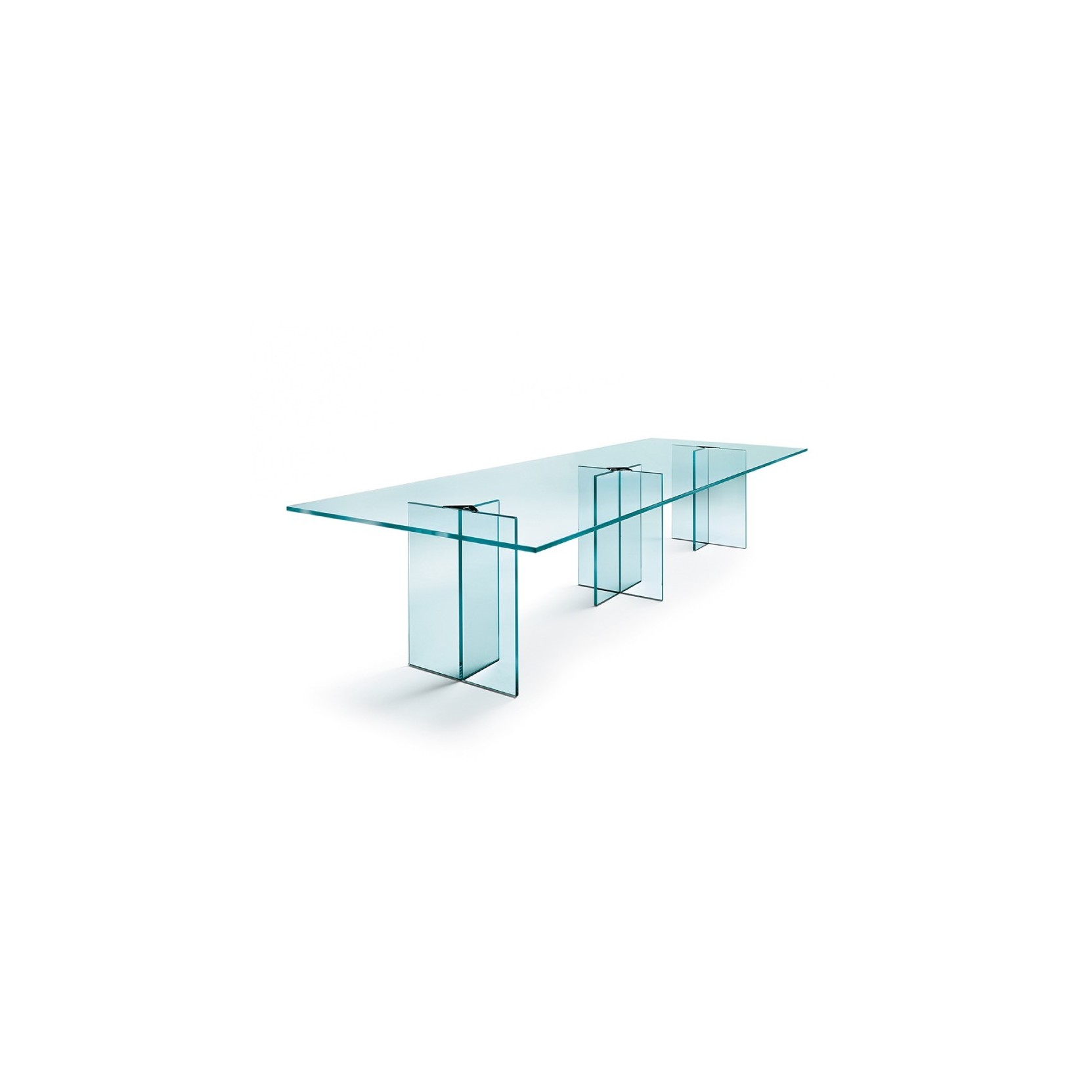 Tavolo riunioni in vetro trasparente da 19 mm. Il piano è appoggiato sulle basi in vetro incollato e i fori presenti hanno la funzione di passacavi. LLT ofx meeting è disponibile anche con piani su misura, fino ad una dimensione massima 350x120 cm.