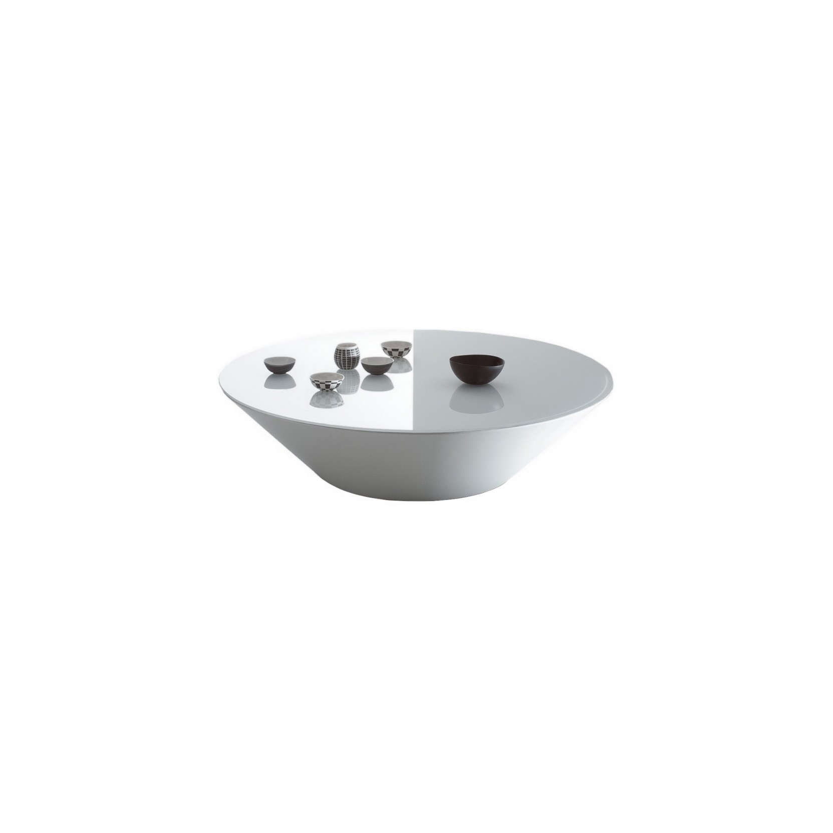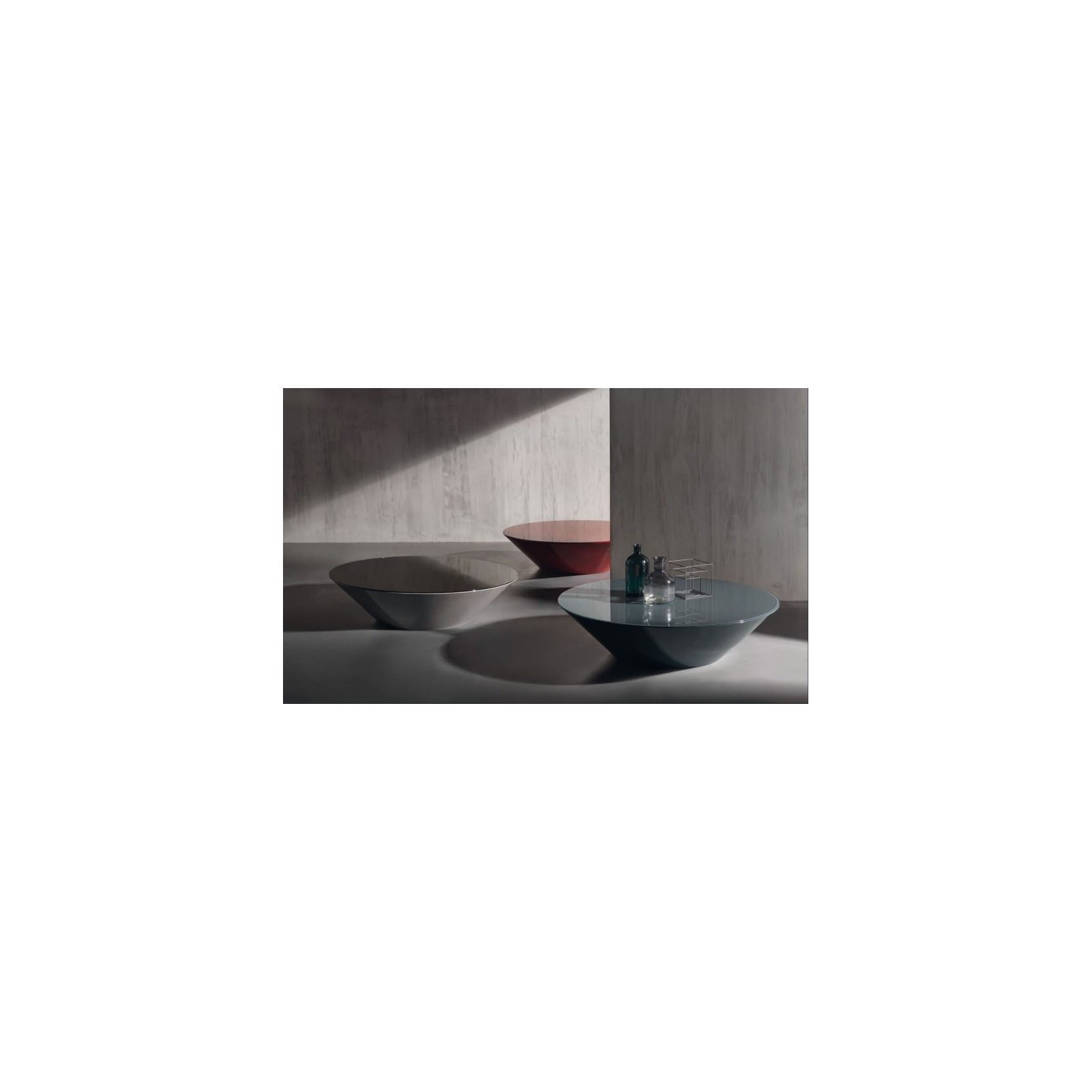 Pond, progettato da Marco Acerbis per Acerbis nel 2006, propone basi coniche stampate in poliuretano BAYDUR® 60 laccato lucido in nuance come nero, bianco SW, lino, sabbia, argilla, bordeaux, rosa, verde scuro, senape o navy blu, che sembrano svanire nell’ombra mentre i piani rotondi – in vetro retro-laccato extrachiaro, a specchio piombo o marmo Calacatta oro/Levanto rosso/Alpi verde – da ø50 cm a ø120 cm e altezze 30-48 cm catturano riflessi acquatici o venature minerali. La variante ø120 cm include ruote rimovibili nascoste nella base per mobilità discreta, rendendolo perfetto come tavolino da cocktail, laterale o occasionale in composizioni vivaci per il living.