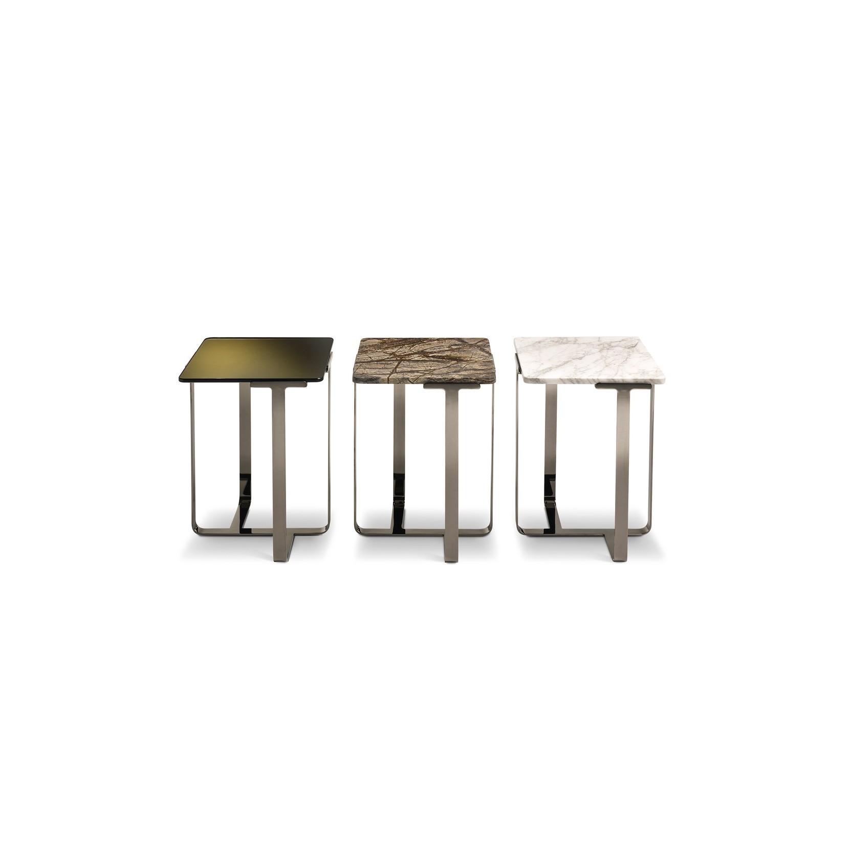 Il basamento in acciaio piatto curvato conferisce solidità alla struttura mantenendo una linea pulita e sofisticata, mentre i piani – proposti in cristallo bronzato retroverniciato alluminio, marmo, pelle o cuoio – offrono una ricca varietà materica e cromatica. Ideali da soli o in composizione, i Joshua si inseriscono con naturalezza in ambienti sia classici che contemporanei, portando con sé un’impronta discreta ma decisa di design. Dal punto di vista tecnico, la struttura in acciaio curvato è rifinita con verniciatura a polveri epossidiche disponibile in finiture standard o, su richiesta, in colori RAL personalizzati. I piani, a seconda della variante, sono realizzati in vetro bronzato con retroverniciatura effetto alluminio, in marmo naturale selezionato, oppure rivestiti in pelle o cuoio, per una resa visiva e tattile sempre raffinata.