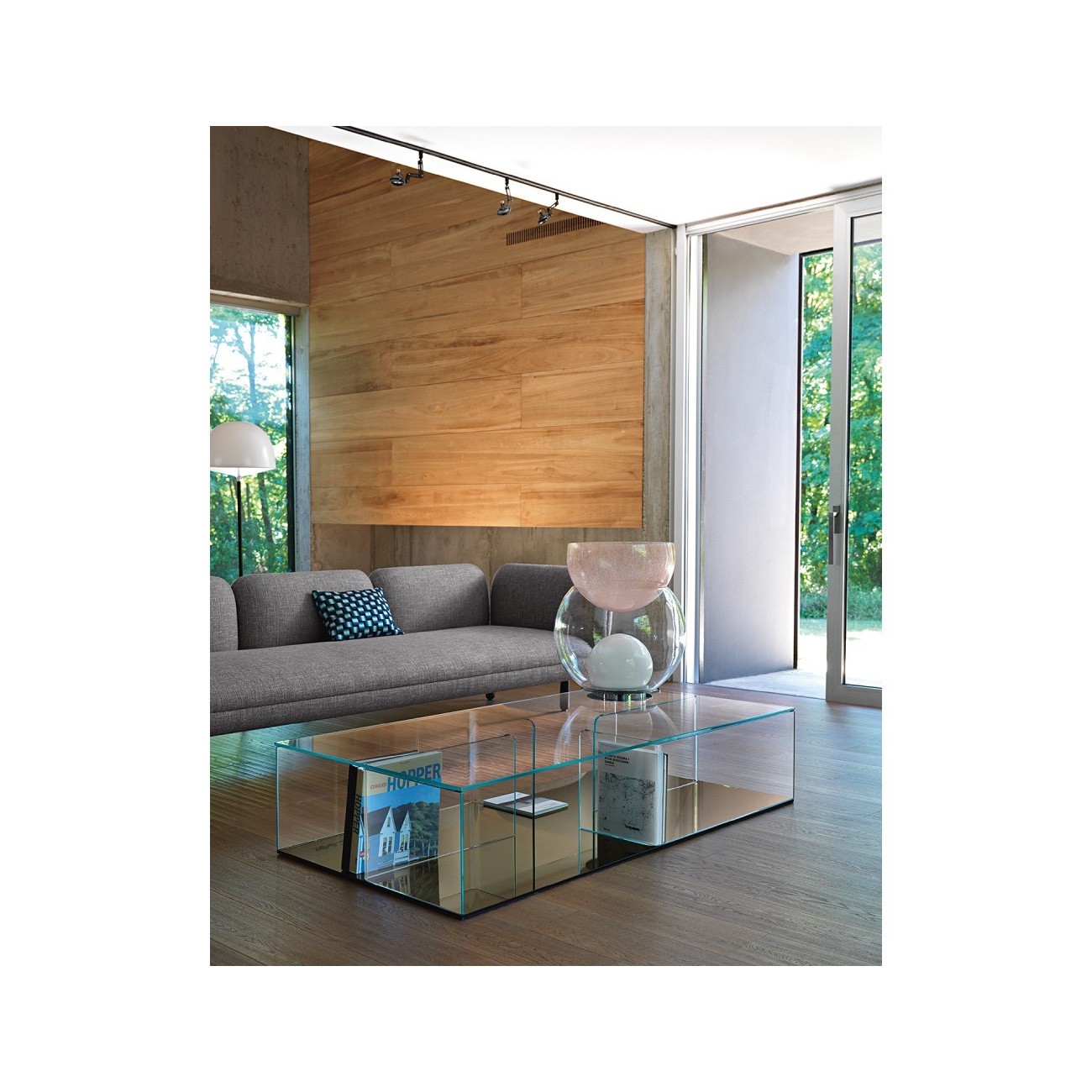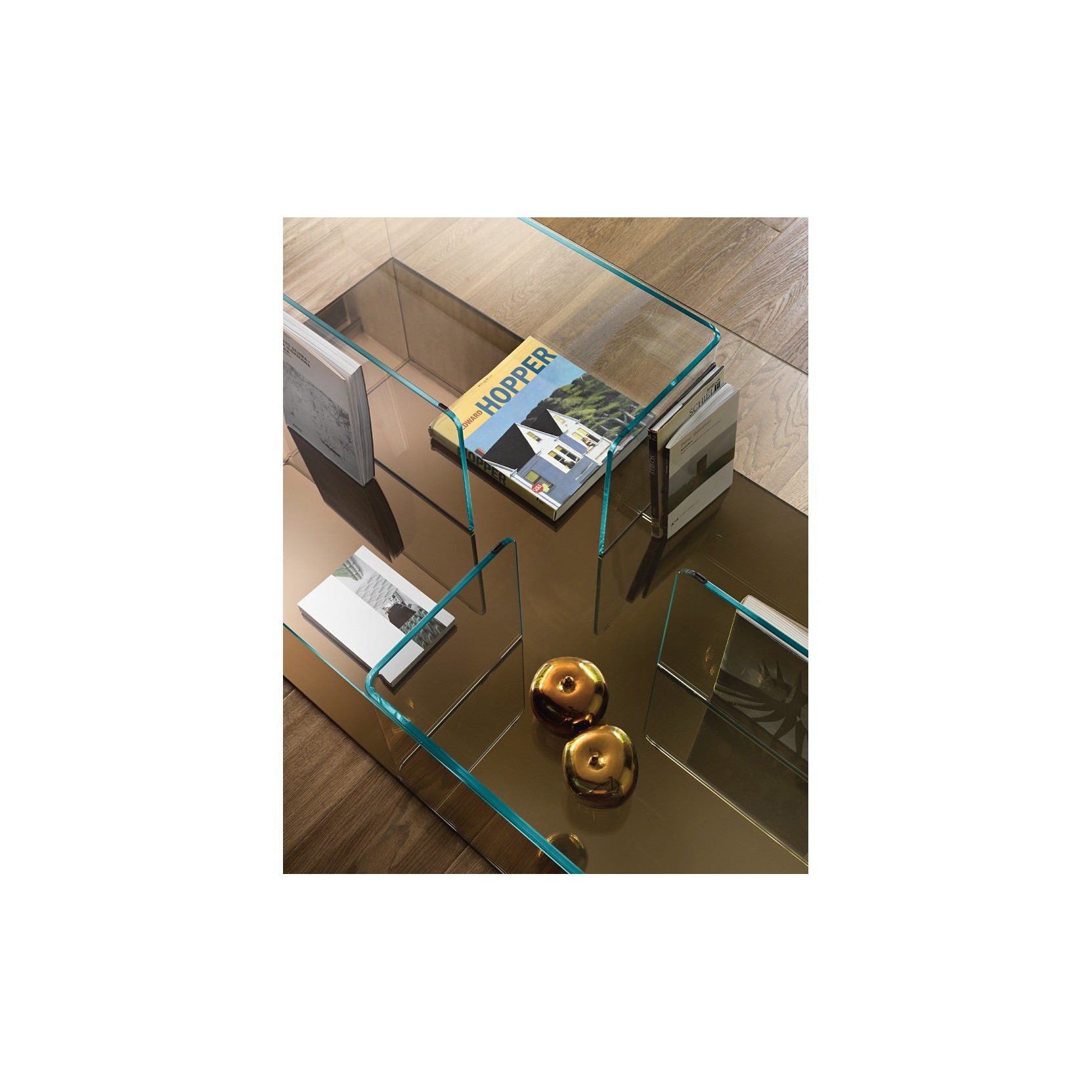 Tavolino contenitore composto da 4 elementi in vetro curvato da 10 mm interposti tra 2 piani in vetro da 10 mm. Piano superiore e divisori in vetro extralight; basi nelle seguenti varianti: vetro extralight trasparente, vetro extralight retroverniciato, vetro extralight retroargentato, vetro bronzo retroargentato.Spedizione 5-6 settimane lavorative