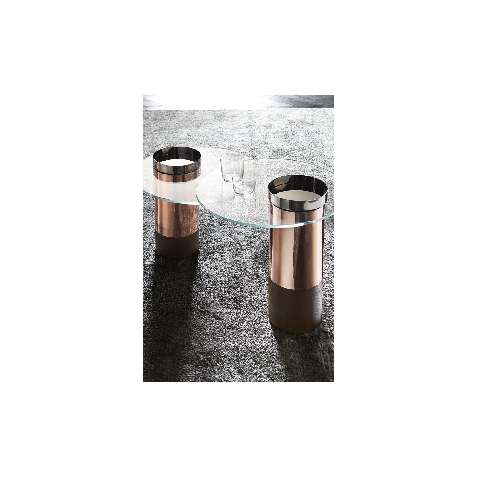 Tavolino con piano in cristallo trasparente extralight temperato 10mm. Base in legno laccato nero (mod. Layer) poro aperto o ruggine. Parti metalliche in ottone lucido, brunito a mano, ramato o cromo nero.Spedizione 5-6 settimane lavorative