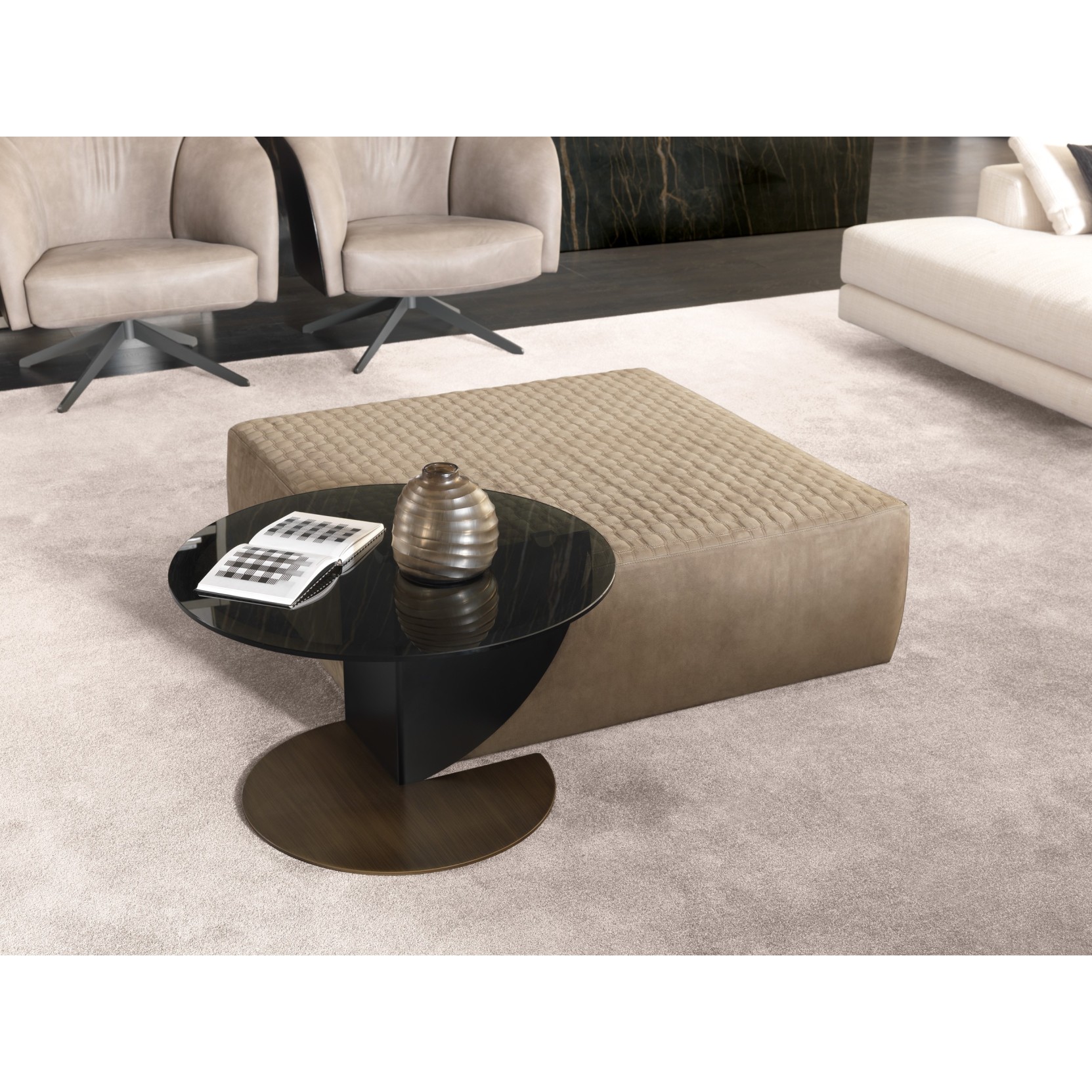 Disponibile in due versioni, una con piano rotondo al 100% e una con piano aperto a 3/4 di cerchio, il tavolino presenta una base metallica in ottone anticato verniciato, che mantiene la stessa forma per entrambe le varianti. Il corpo che sostiene il top è un accostamento di linee rette e circolari in metallo verniciato nero. Il piano, realizzato in vetro bisellato trasparente fumé da 12 mm, aggiunge un ulteriore tocco di eleganza. La versione con piano a 3/4, in particolare, può essere utilizzata come tavolino complementare da posizionare all'angolo di un divano o di un pouf.
