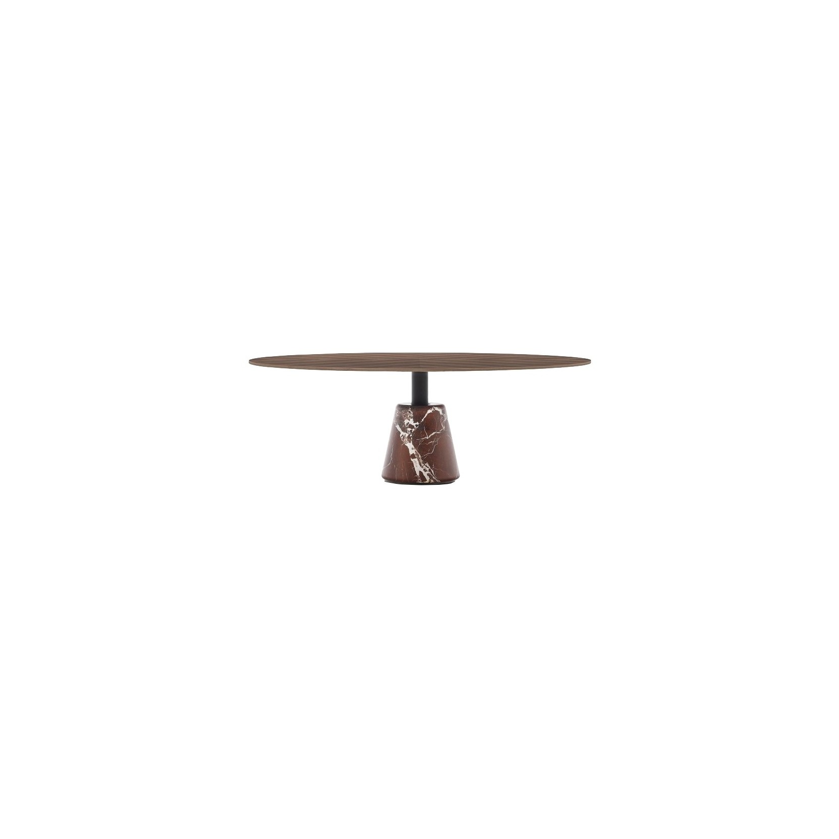 Menhir A sovrappone rocchi di marmo in varie dimensioni e venature – Carrara statuario, Marquinia nero o Levanto rosso – a piani rotondi in laccato lucido o essenza legno, nelle altezze 36,2 cm, 42,5 cm o 48,8 cm e diametri ø80 cm, ø100 cm o ø120 cm, per composizioni totemiche modulari