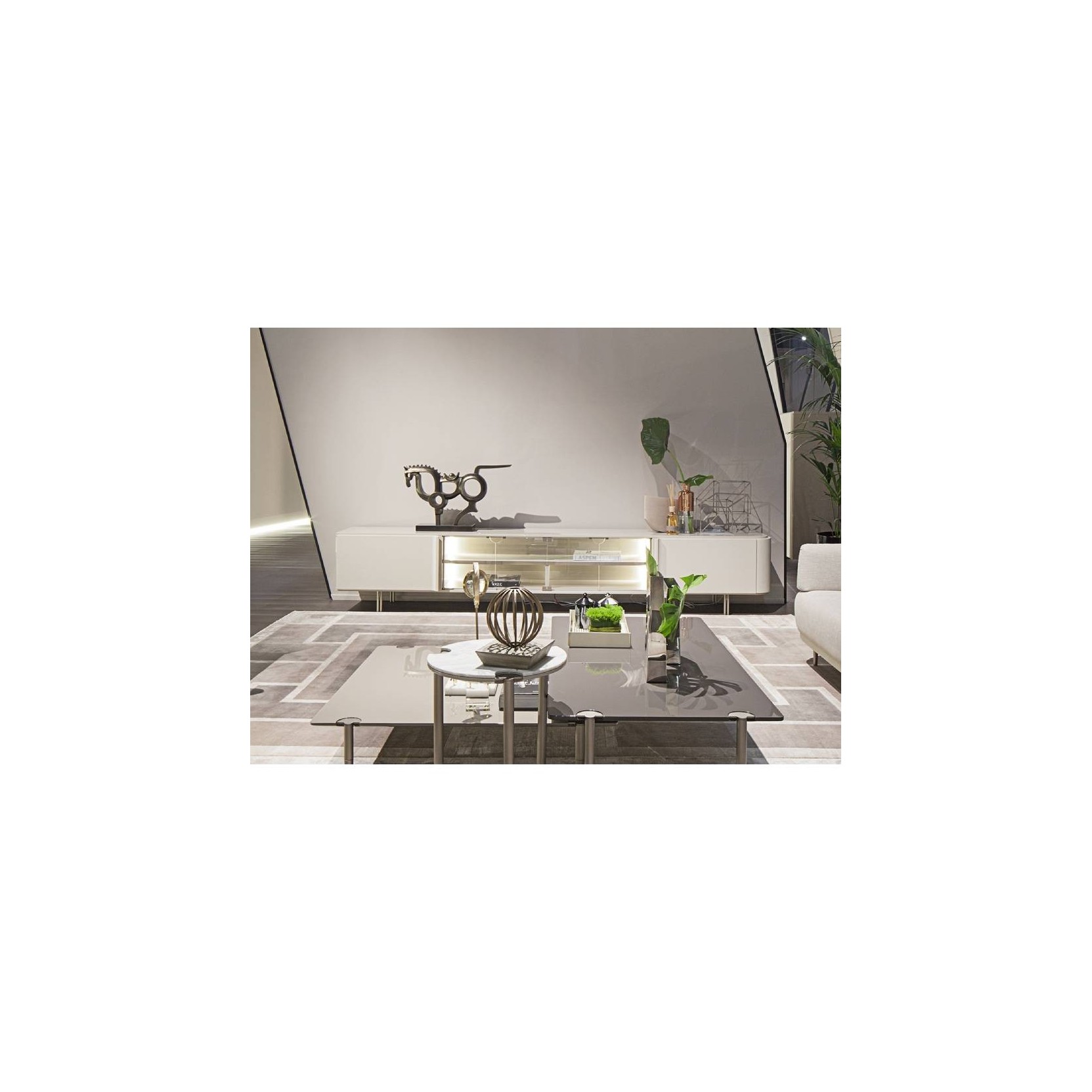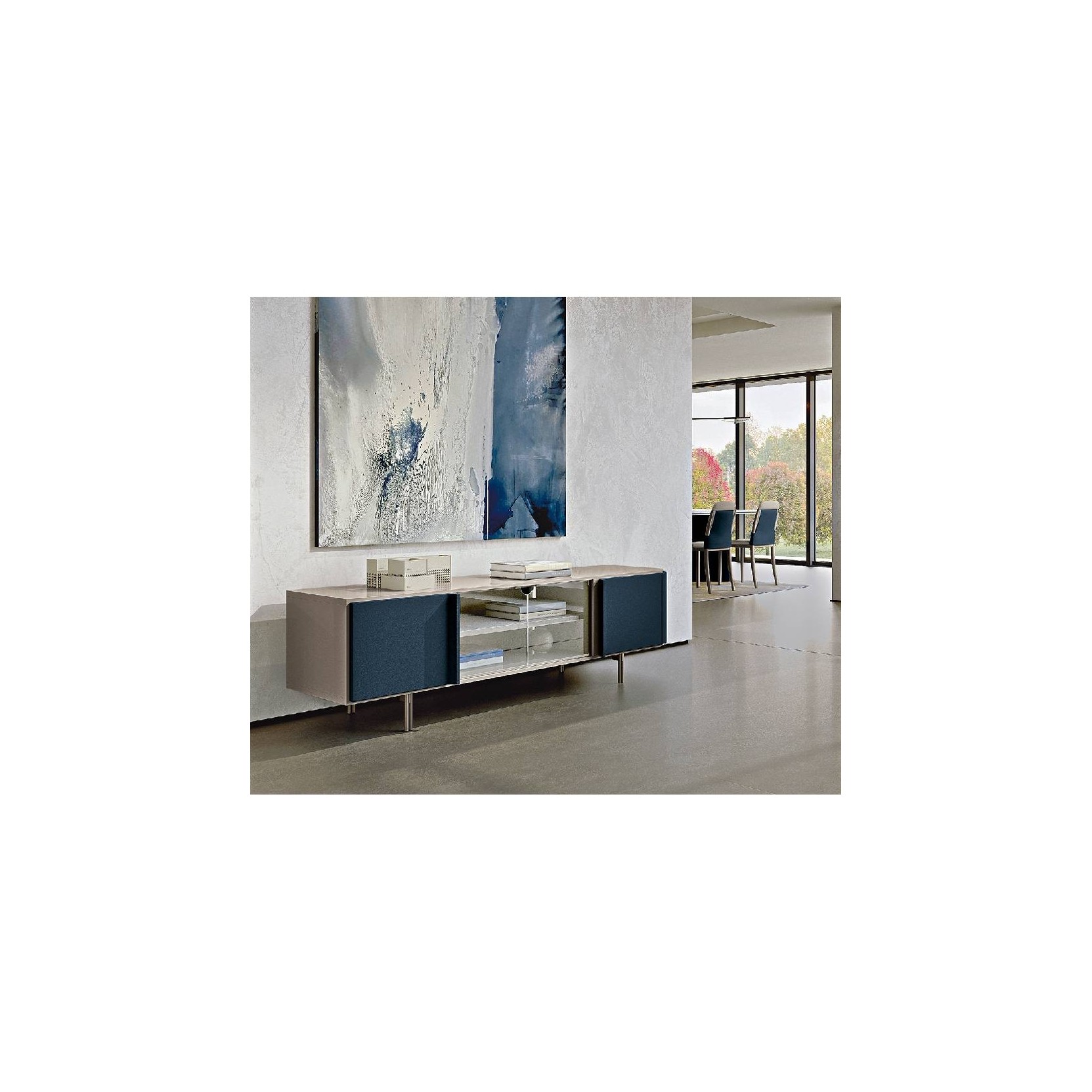 Il mobile tv Zero è costituito da un lungo vano centrale con ante in vetro e illuminazione a LED, all’interno il ripiano è disponibile in marmo, in legno o in vetro con stampa effetto marmo, i due vani laterali sono invece chiusi da ante rivestite in pelle. I piedini sono in metallo satinato in finitura platino. Il mobile tv è disponibile in due dimensioni per adattarsi a qualsiasi ambiente. Il mobile tv Zero è disponibile in diverse finiture come da campionario.Spedizione 5-6 settimane lavorative
