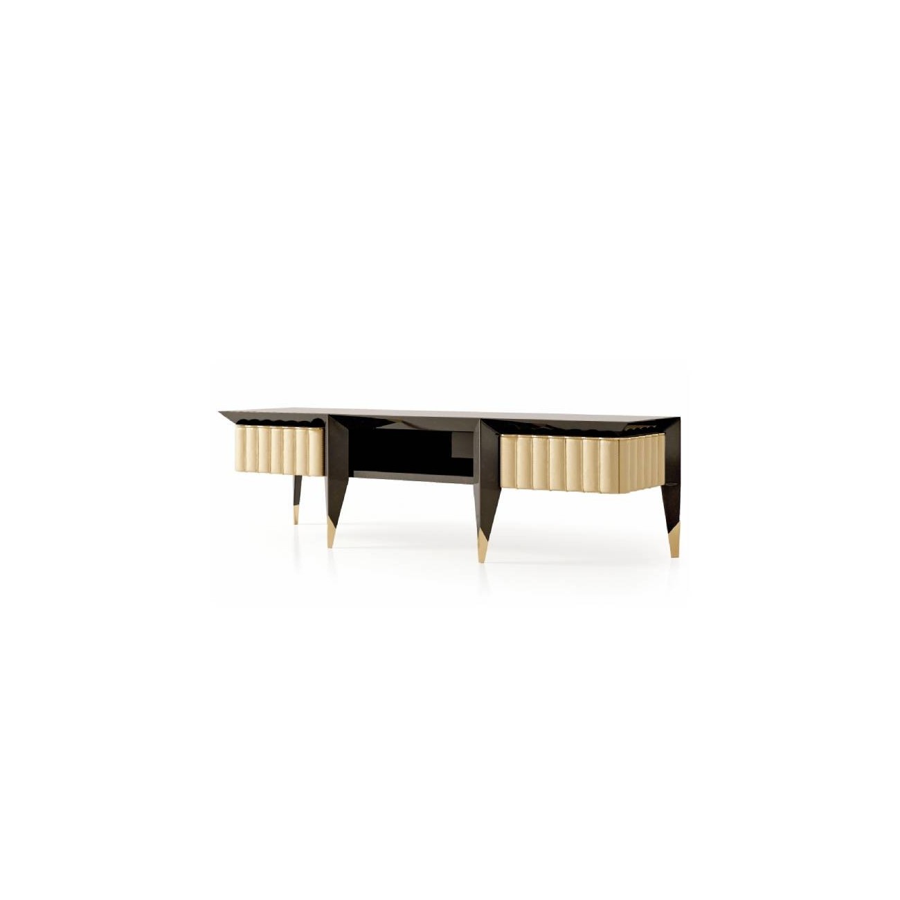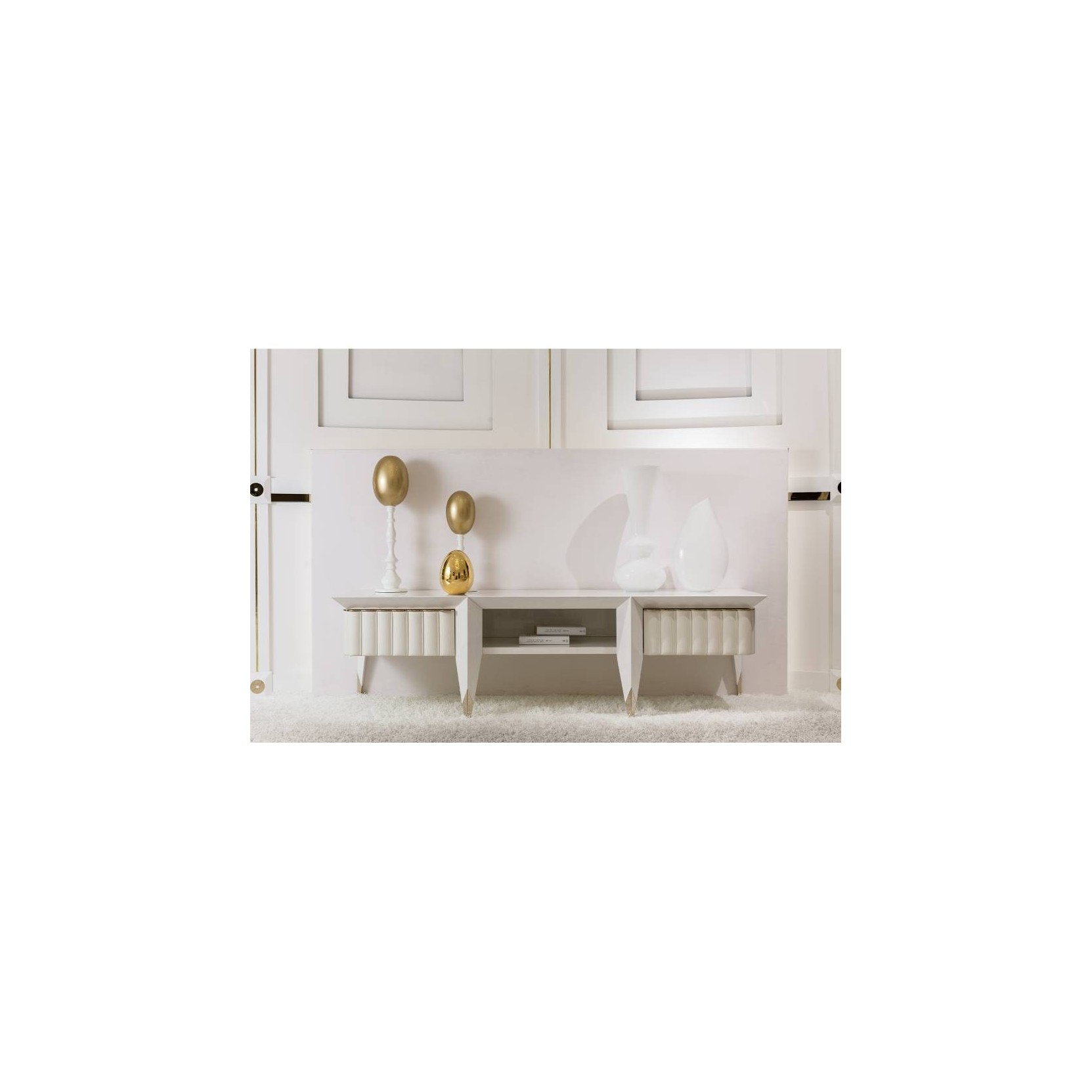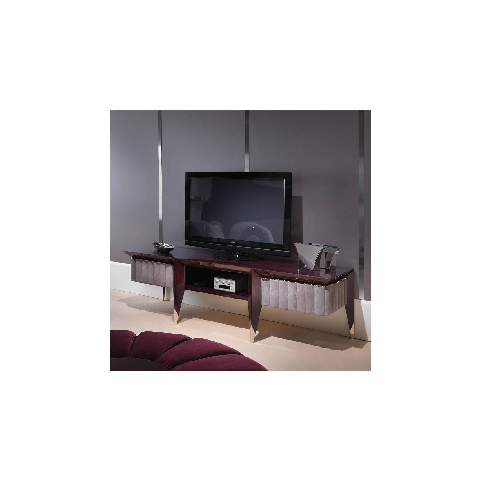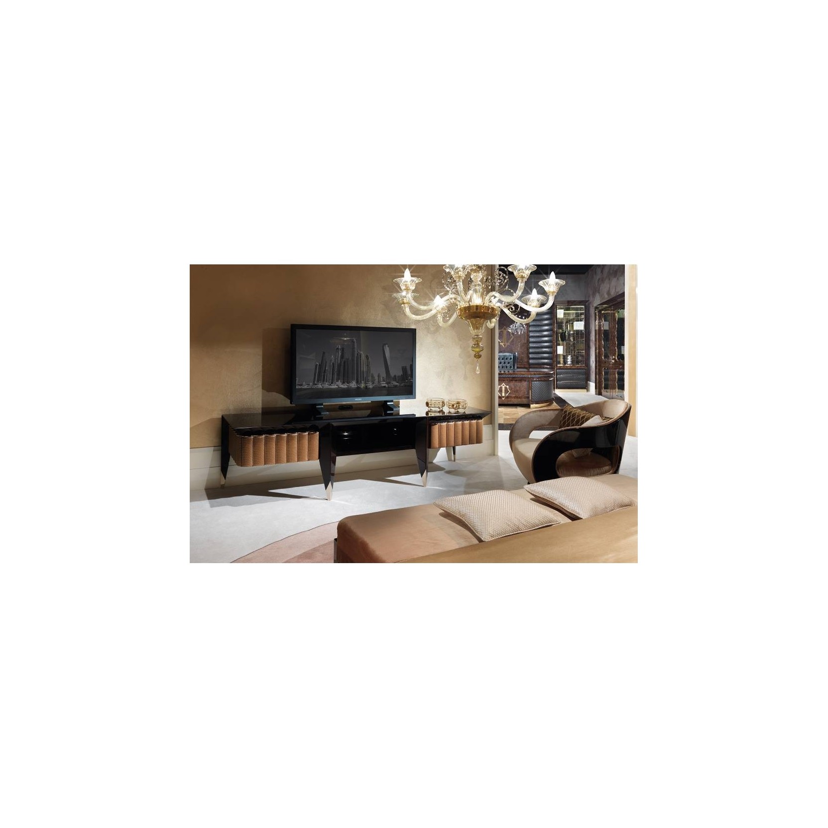 Il mobile tv della collezione Orion è un elemento compatto adatto ad arredare ambienti living e notte. Il tema ricorrente dell’intera collezione sono le colonnine bombate leggermente imbottite e rivestite in pelle o tessuto, le gambe e le parti in legno laccato lucido sono disegnate a sezione triangolare per dare ancora più carattere ad ogni oggetto. Il mobile tv Orion è dotato di due ante e un vano a giorno centrale. Il mobile tv Orion è disponibile in diverse finiture come da campionario.Spedizione 5-6 settimane lavorative